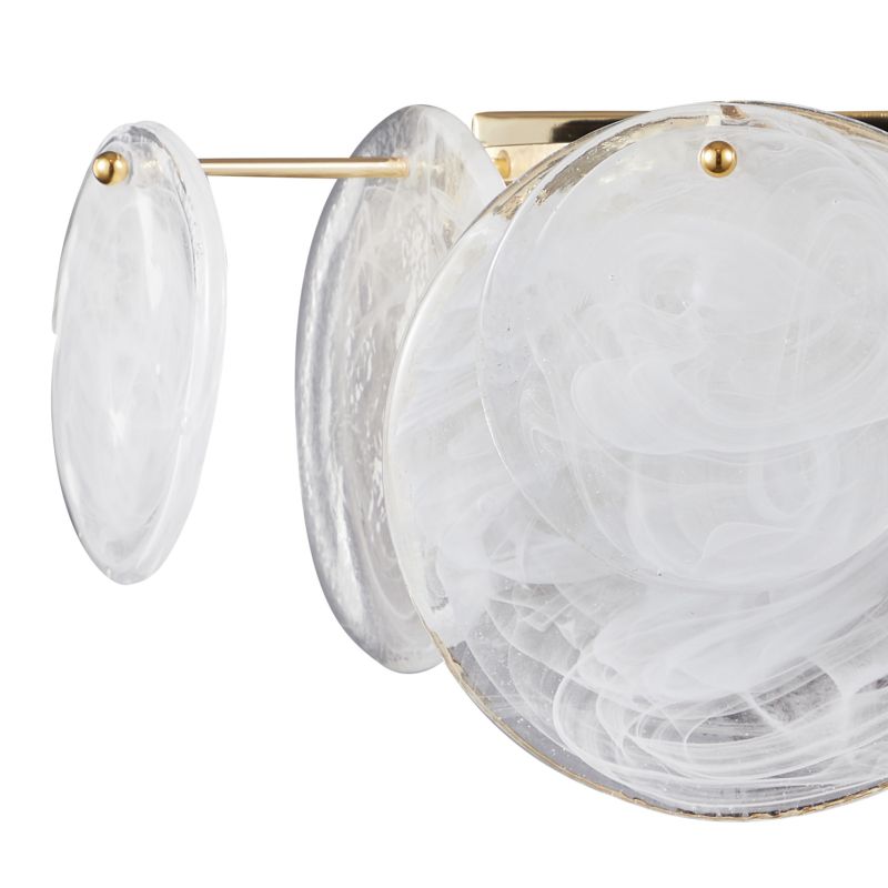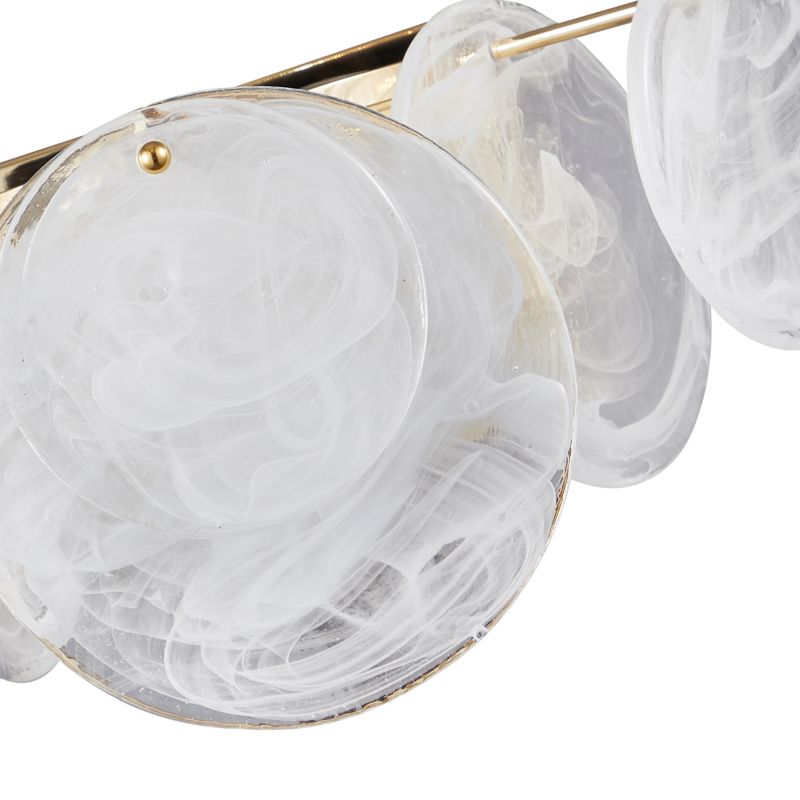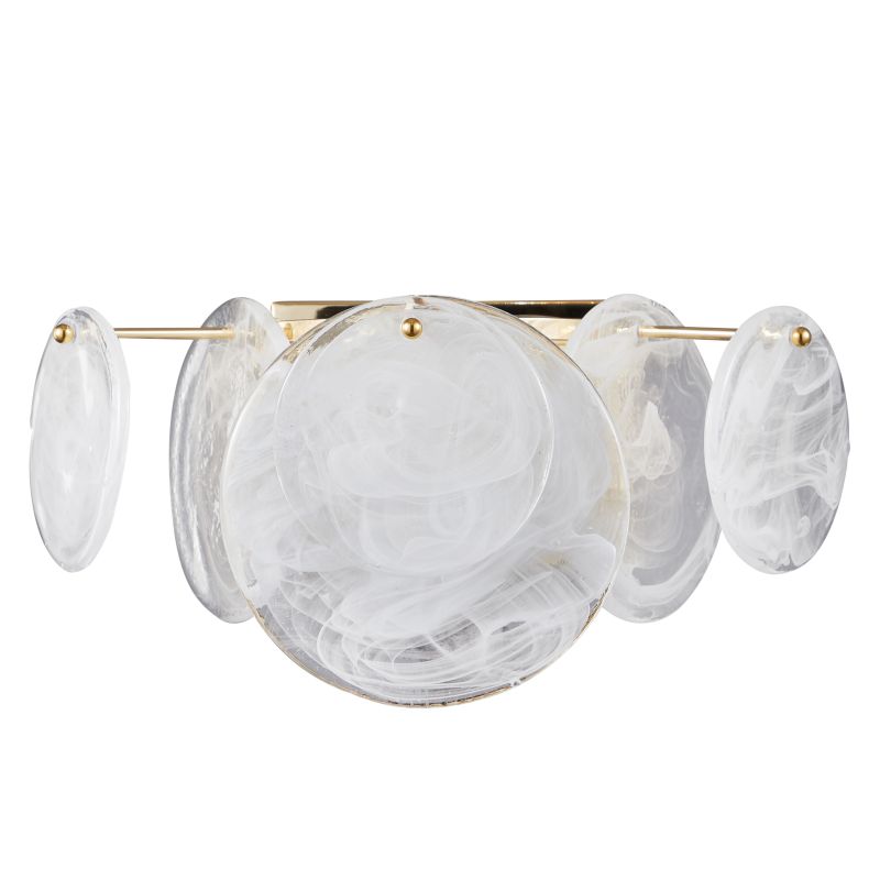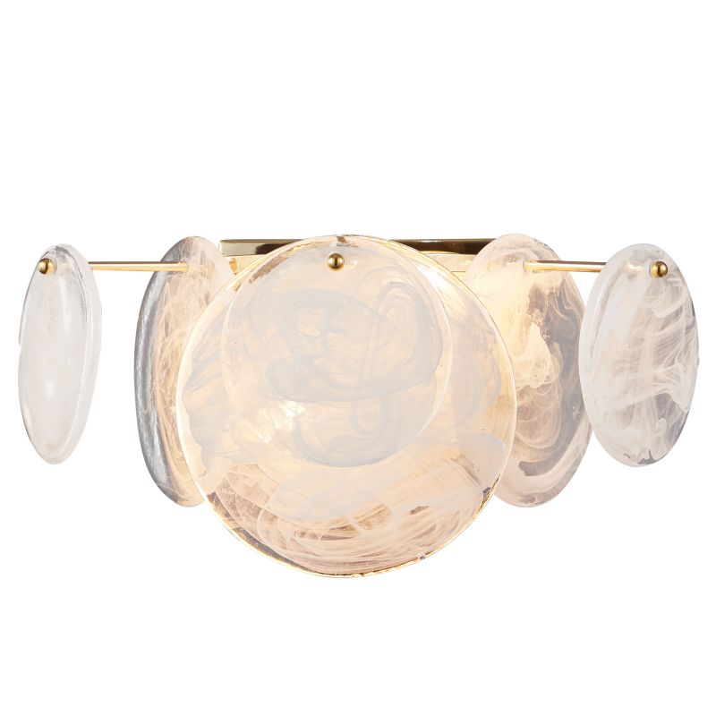 Светильник настенный из коллекции Elegantly выполнен из металла, гальванизированного в цвет золота, и декорирован круглыми пластинами из алебастрового стекла разного размера. Премиальное качество и неповторимыи? дизаи?н светильников идеально подои?дут в современные и дизайнерские интерьеры.