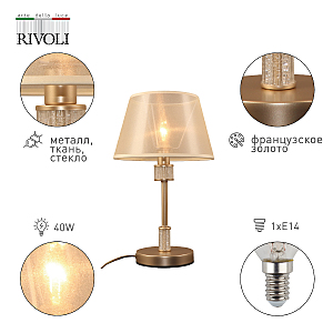 Настольные светильники Rivoli Elinor (арт. 7083-501) классические светильники с благородными деталями. Абажур красивого золотистого цвета изготовлен из прочной интерьерной ткани, которая не выцветет со временем. Эти прикроватные светильнки прекрасная покупка, которая продемонстрирует ваш замечательный вкус и будет радовать долгие годы.Позолоченная арматура настольной лампы Elinor от итальянского бренда Rivoli декорирована вставками из стекла.Лампа для настольного светильника в спальню или в гостиную Elinor - Е14 40 Вт. Популярное применение этогй настольной лампы - возле кровати для организации комфортной вечерне-утренней подсветки.Коллекция укомплектована люстрой на 5, 5 и 7 ламп (2083-310, 2083-305, 2083-307) и бра (2083-401).