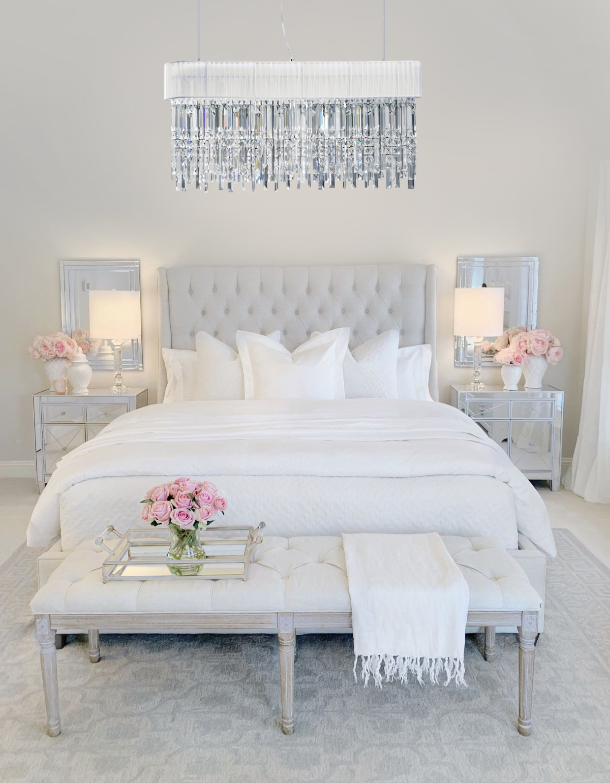 Прямоугольная люстра в хроме — идеальный вариант для зоны над обеденным столом, над кроватью или в гостиной над диваном.