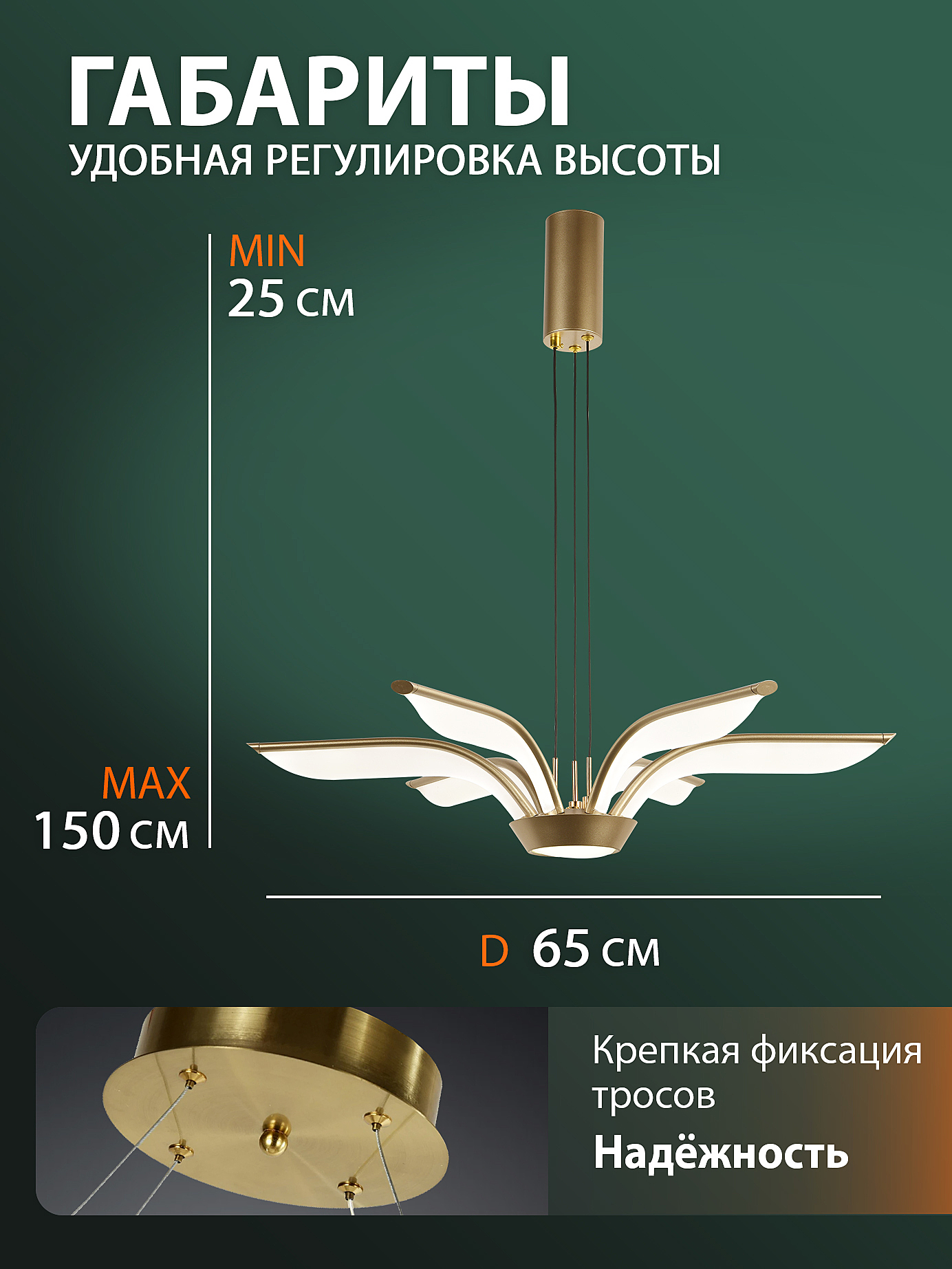Допускается отличие страны-изготовителя, указанной в характеристиках. Линии производства могут находиться в нескольких государствах. Это не влияет на качество изготовления товара: все заводы данного бренда работают по общим стандартам, а готовые изделия проходят соответствующий контроль.Австрия Коллекция Euro ЦветЦвет арматуры золотой Цвет Золото Материал арматуры Металл Цвет плафона Белый Материал плафона Акрил РазмерыВысота (мм) 1640 Длина (мм) 650 Высота минимальная (мм) 140 Ширина (мм) 650 ЭлектрикаКоличество ламп (шт) 1 Цоколь LED Тип лампы Светодиодная Мощность лампы (Вт) 100 Световой поток 6000 Цветовая температура 3000, 6500, 4300 Площадь освещения 21 Дополнительная информацияСпособ крепления Планка Техническая оссобеность Ночной режим, Таймер, Регулировка яркости, Регулировка цветовой температуры Тип подвеса На тросах Тип управления Пульт ДУ -