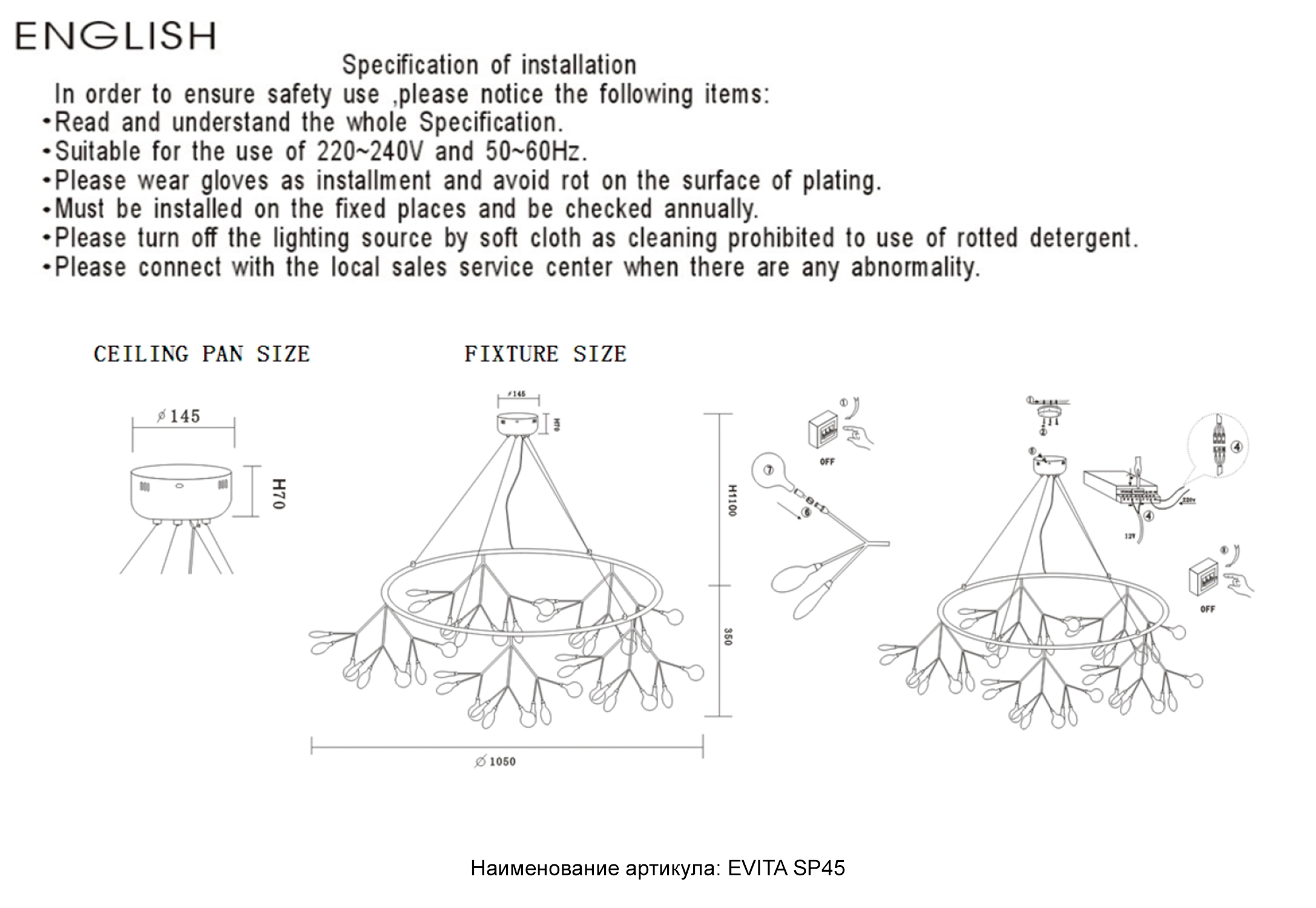 Допускается отличие страны-изготовителя, указанной в характеристиках. Линии производства могут находиться в нескольких государствах. Это не влияет на качество изготовления товара: все заводы данного бренда работают по общим стандартам, а готовые изделия проходят соответствующий контроль.Испания Коллекция Evita ЦветЦвет арматуры золотой Цвет Золото Материал арматуры Металл Цвет плафона прозрачный Материал плафона Стекло РазмерыВысота (мм) 1400 Диаметр (мм) 1050 Высота минимальная (мм) 400 Ширина (мм) 1050 ЭлектрикаКоличество ламп (шт) 45 Цоколь G4 Лампочки в комплекте Лампы в комплекте Мощность лампы (Вт) 1 Дополнительная информацияСтепень защиты (IP) 20 Вес (Кг) 8,84 Тип подвеса На тросах -