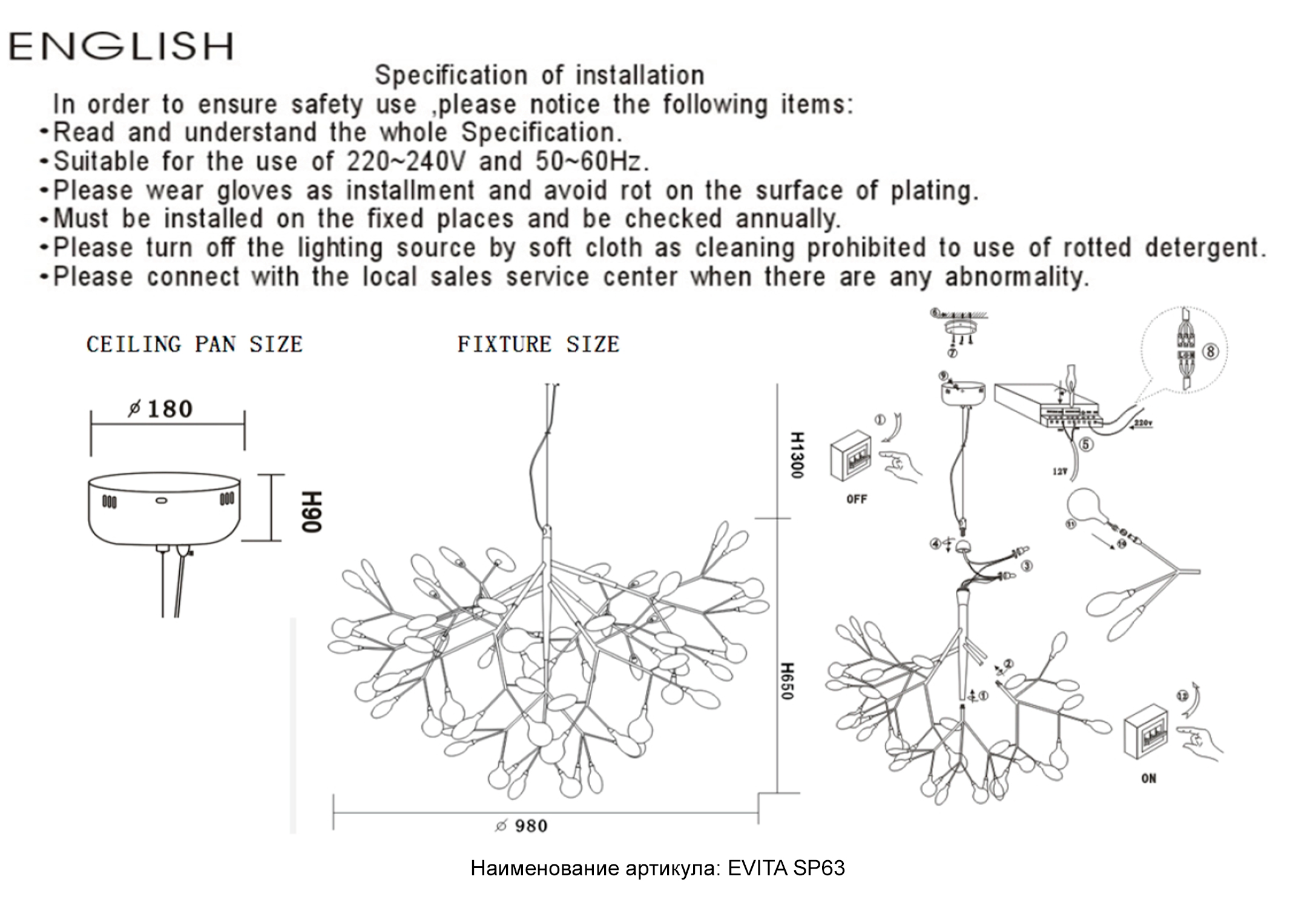 Допускается отличие страны-изготовителя, указанной в характеристиках. Линии производства могут находиться в нескольких государствах. Это не влияет на качество изготовления товара: все заводы данного бренда работают по общим стандартам, а готовые изделия проходят соответствующий контроль.Испания Коллекция Evita ЦветЦвет арматуры Черный Цвет Черный Материал арматуры Металл Цвет плафона прозрачный Материал плафона Стекло РазмерыВысота (мм) 2020 Диаметр (мм) 980 Высота минимальная (мм) 720 Ширина (мм) 980 ЭлектрикаКоличество ламп (шт) 63 Цоколь G4 Лампочки в комплекте Лампы в комплекте Мощность лампы (Вт) 1 Цветовая температура теплый (3000k) Дополнительная информацияСтепень защиты (IP) 20 Тип подвеса На тросах -