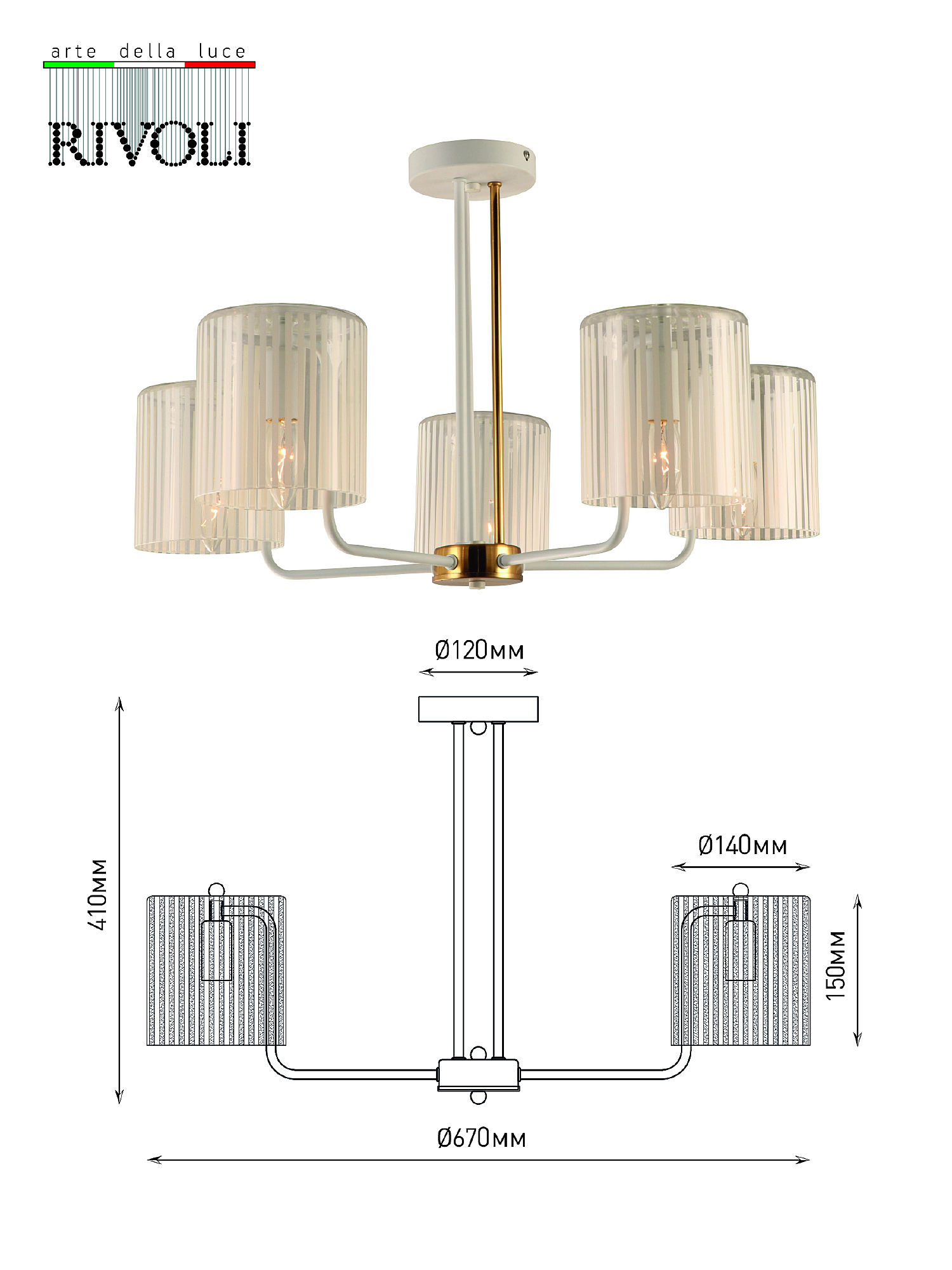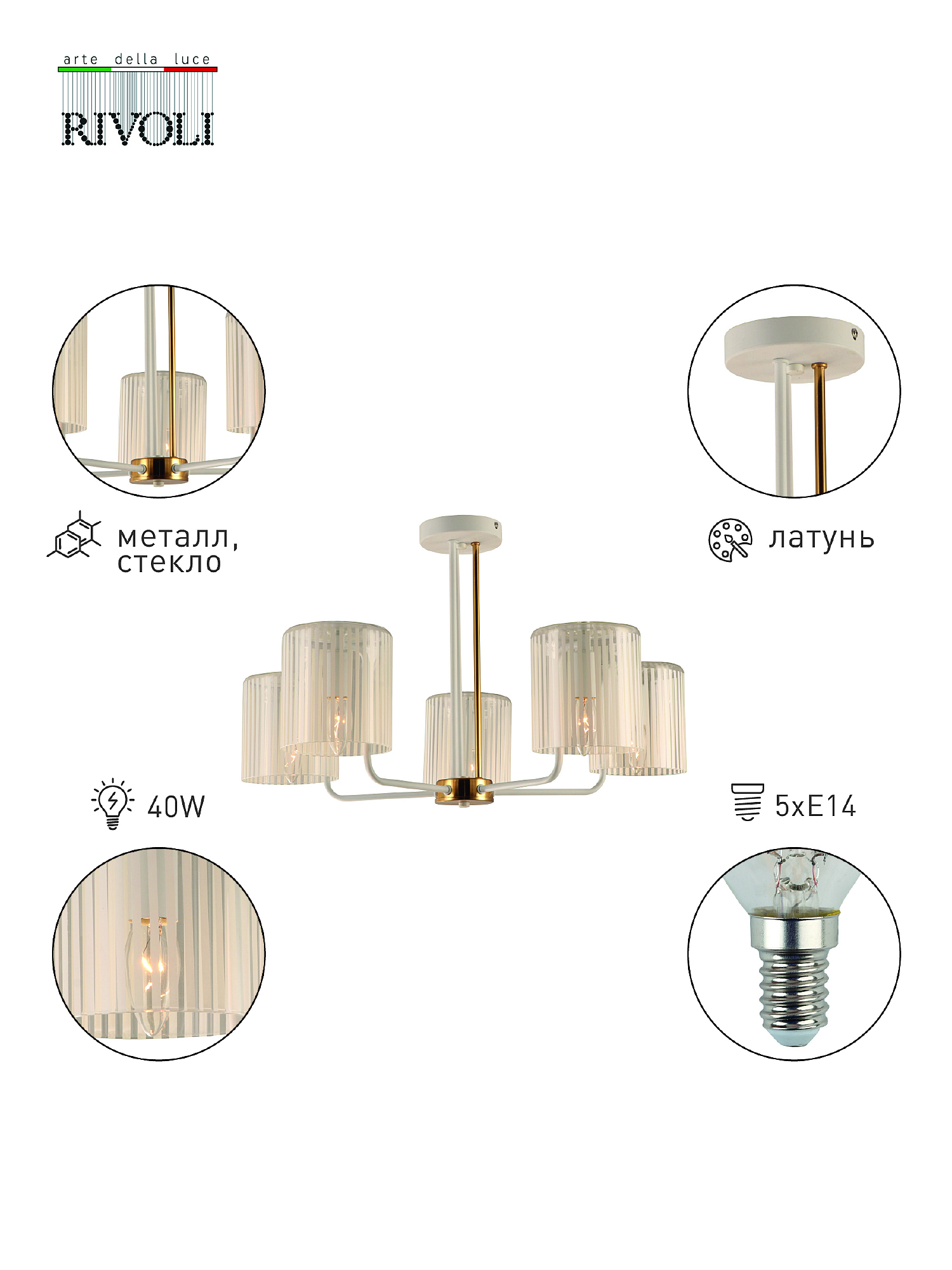 Допускается отличие страны-изготовителя, указанной в характеристиках. Линии производства могут находиться в нескольких государствах. Это не влияет на качество изготовления товара: все заводы данного бренда работают по общим стандартам, а готовые изделия проходят соответствующий контроль.Италия Коллекция Evonne ЦветЦвет арматуры Белый, Латунь Цвет Белый Материал арматуры Металл Цвет плафона Белый, прозрачный Материал плафона Стекло РазмерыВысота (мм) 410 Длина (мм) 670 Ширина (мм) 670 ЭлектрикаКоличество ламп (шт) 5 Цоколь E14 Мощность лампы (Вт) 40 Напряжение (В) 220 Площадь освещения 15 Дополнительная информацияСпособ крепления Планка Степень защиты (IP) IP20 Вес (Кг) 3,82 -