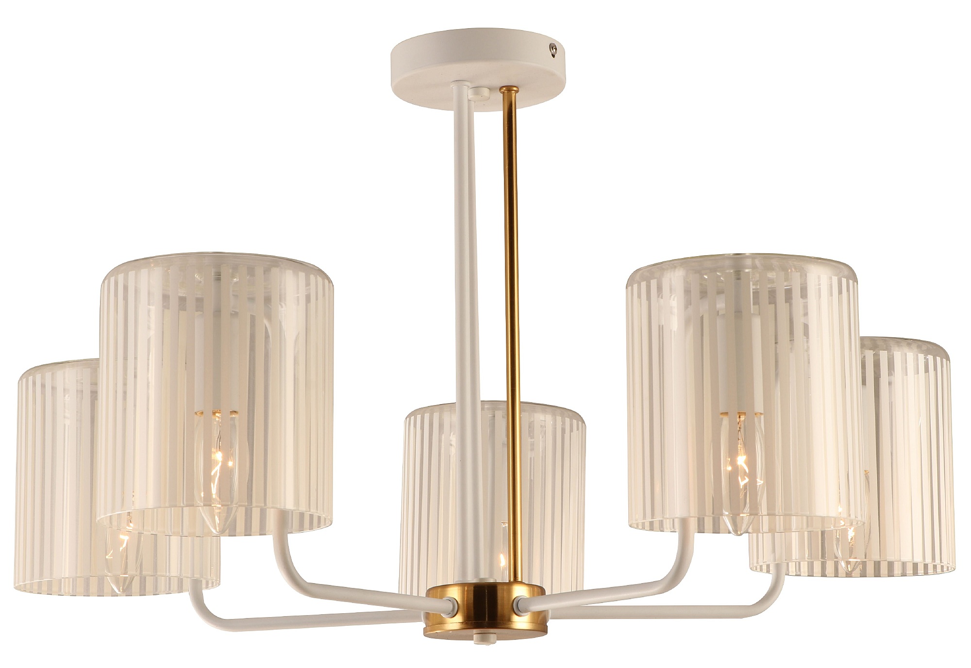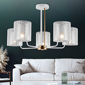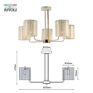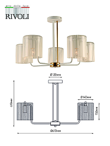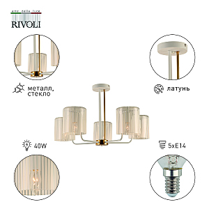 5-рожковая люстра на двух штангах – белого и золотого цветов. Плафоны люстры на потолок Rivoli Evonne (арт. 2088-305) изготовлены из стекла с чередованием прозрачных и матовых участков. Дизайнерскую коллекцию Evonne в классическом стиле дополняют люстры 7-рожковые (арт. 2088-307) и настенное бра (арт. 2088-401).Люстра Evonne c 5 стеклянными плафонами качественно освещает до 15 м2 площади жилого пространства. Эту модель стоит купить в качестве основной люстры в гостиную, люстры в спальню. Такая дизайнерская люстра даст много света и поможет создать неповторимый интерьер. Источники света для данной люстры – Е14 40 Вт (5 ламп).