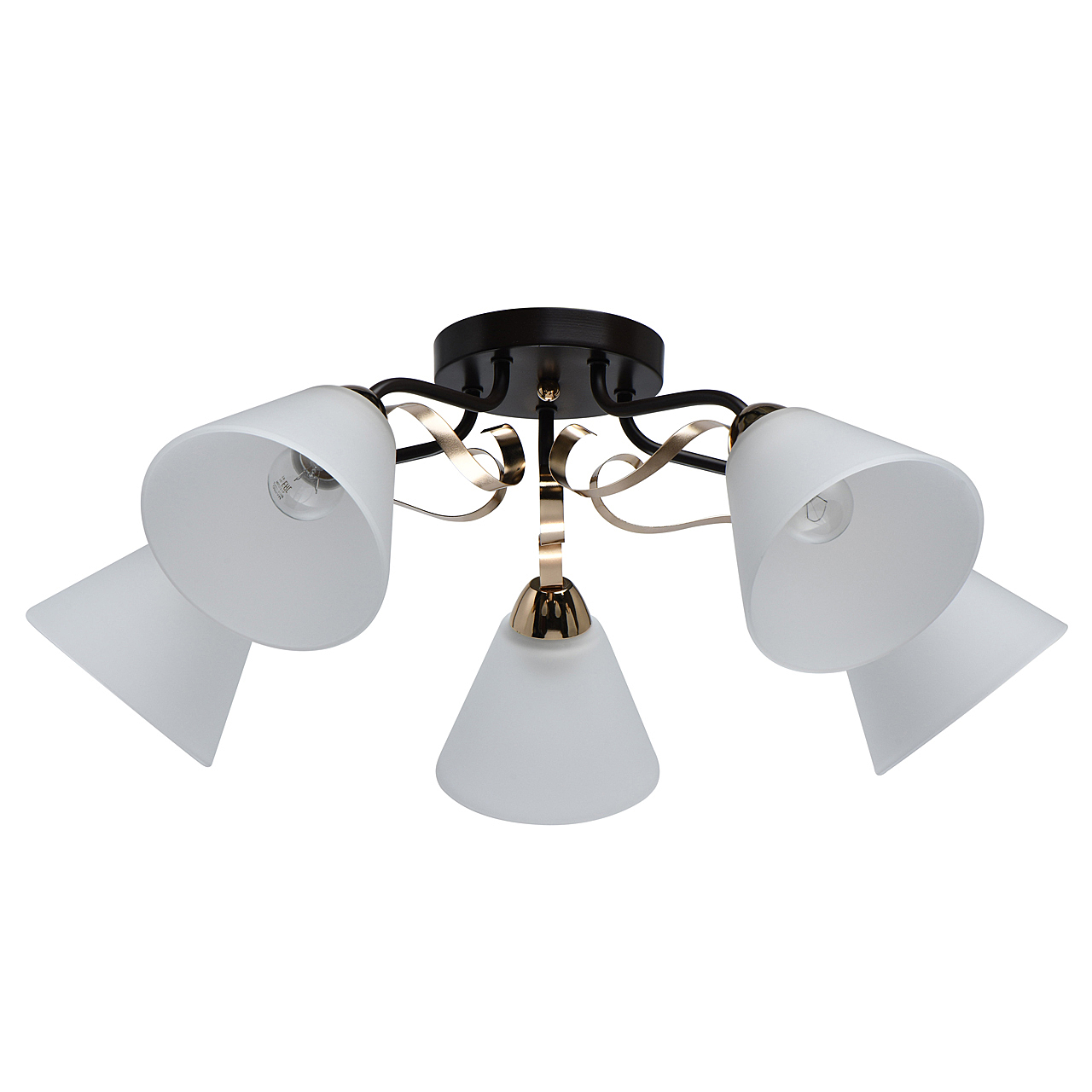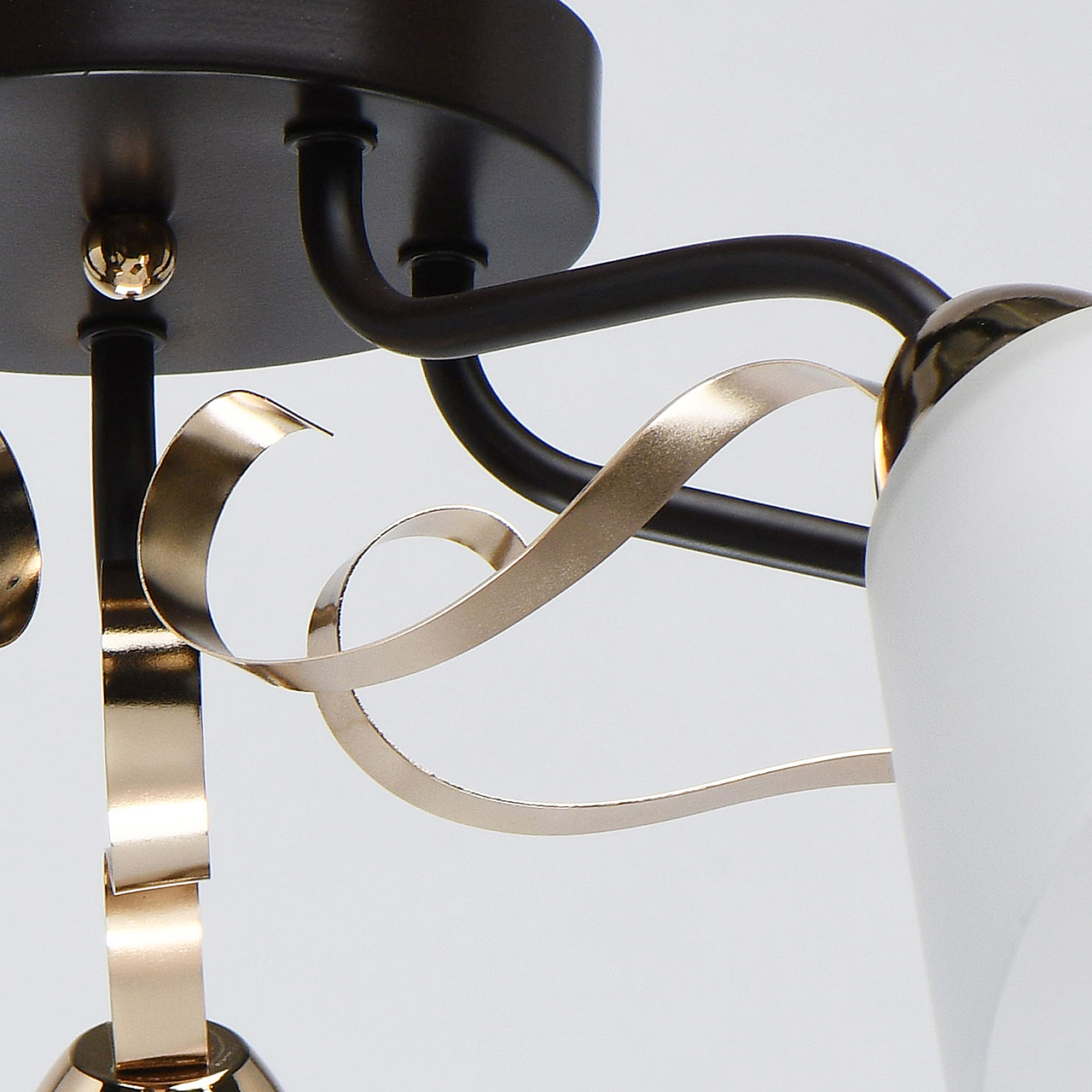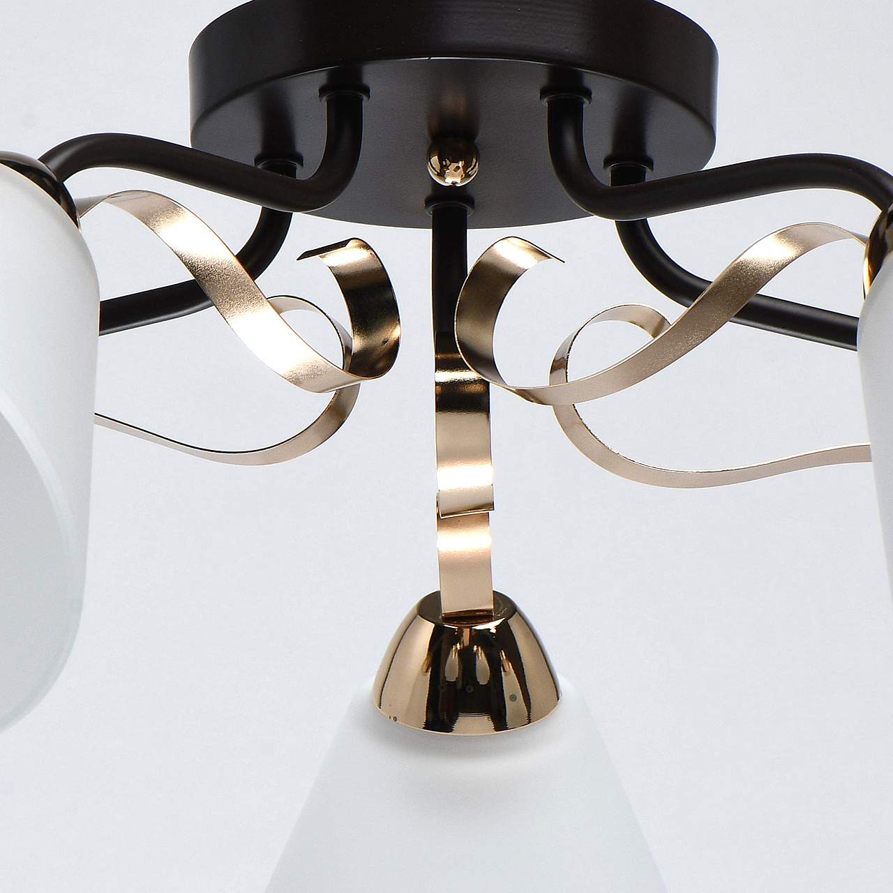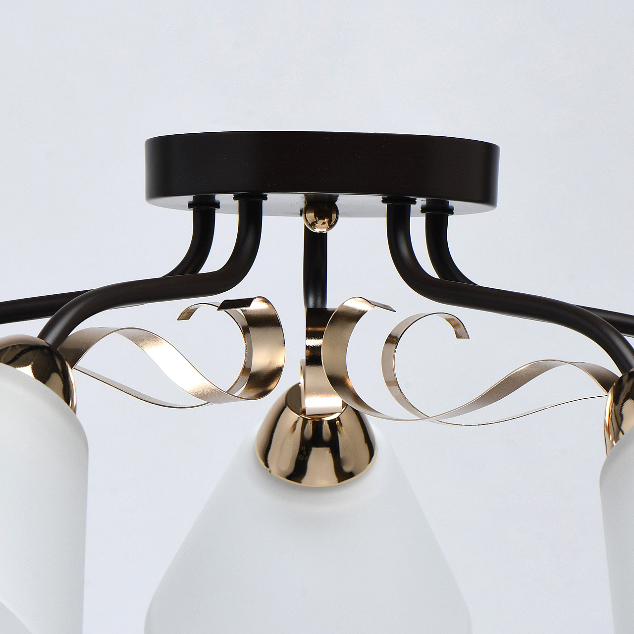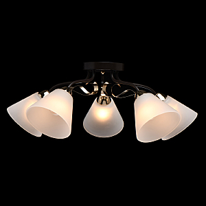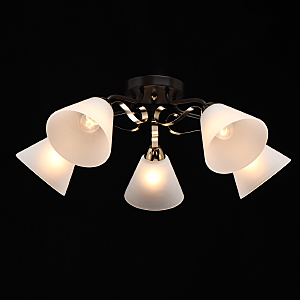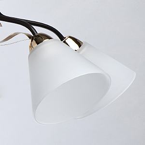 Насыщенные цвета основания светильника кофе и золотого придадут яркости интерьеру.Плафоны матового стекла обеспечивают мягкий световой поток.Компактная высота идеальна для стандартной высоты потолка. Широкий диаметр обеспечивает высокие параметры освещения.Металлический декор создает дополнительный акцент.