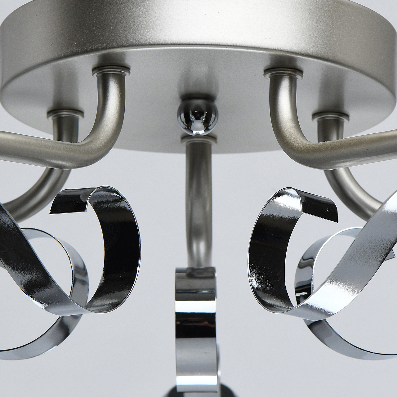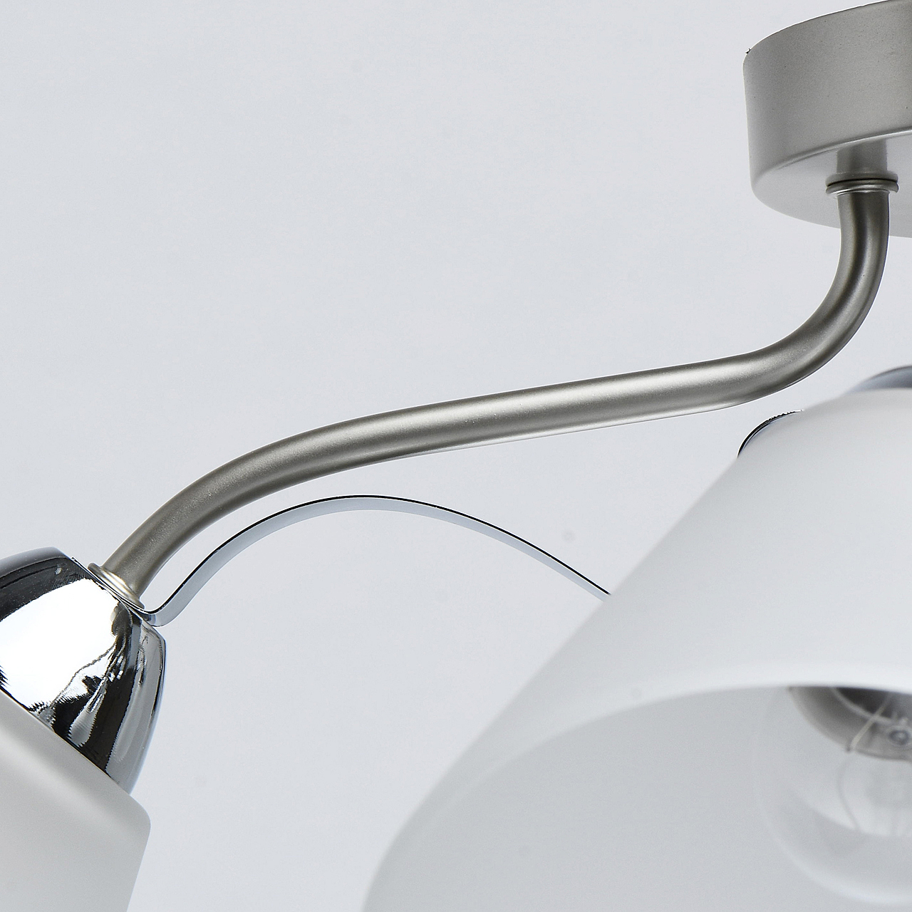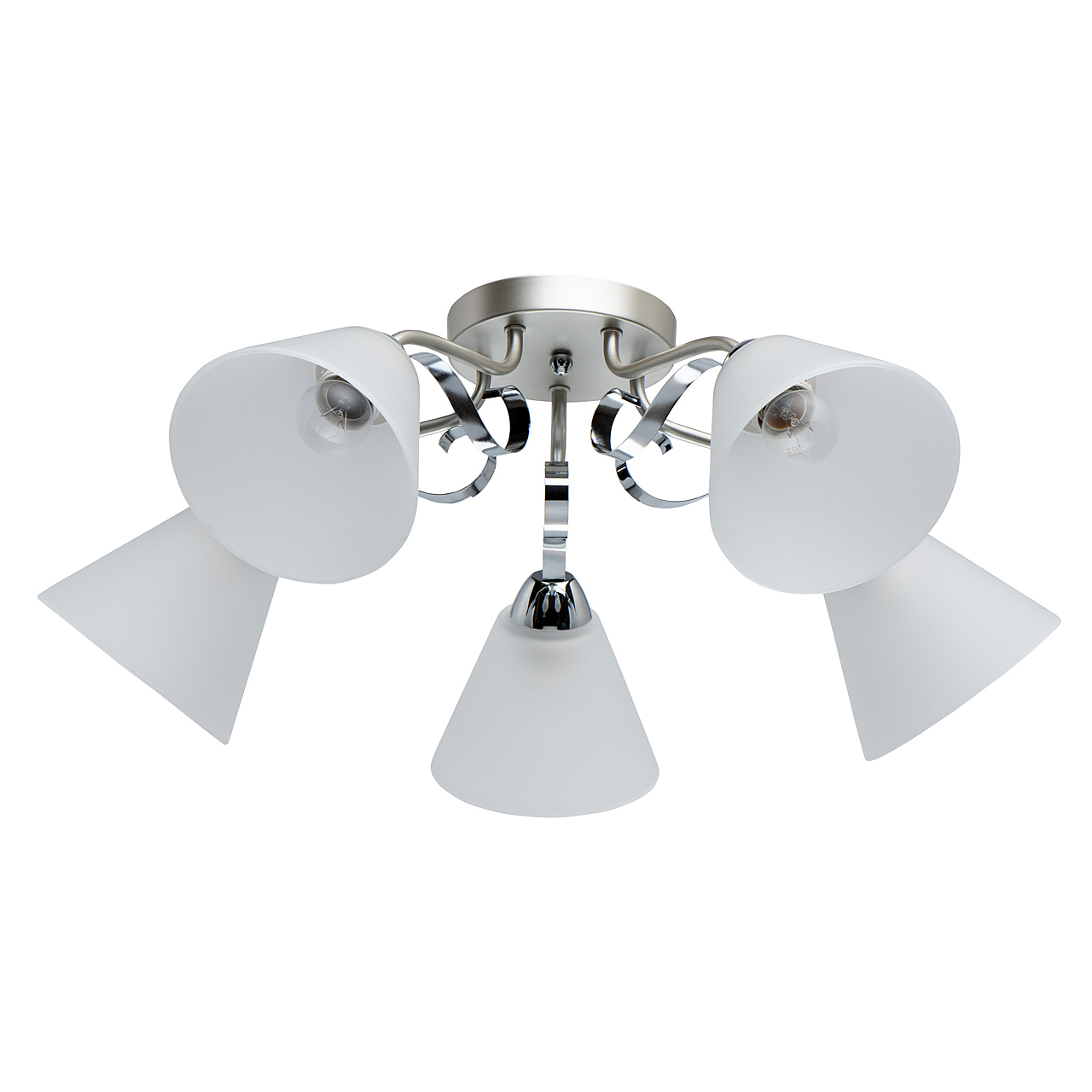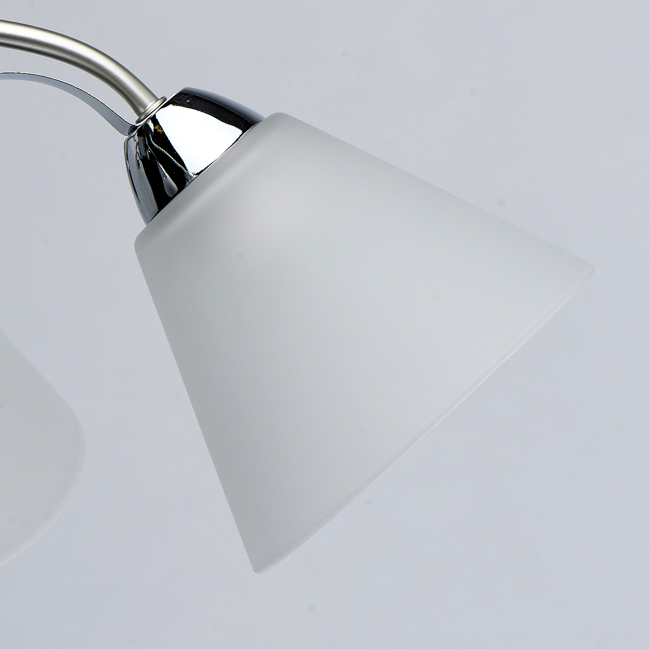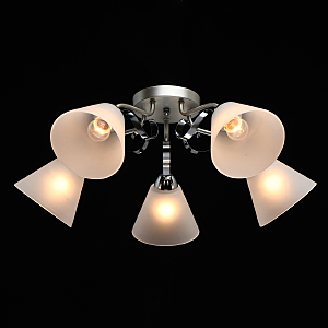 Актуальный цвет основания перламутрового серебра.Плафоны матового стекла обеспечивают мягкий световой поток.Компактная высота идеальна для стандартной высоты потолка. Широкий диаметр обеспечивает высокие параметры освещения.Металлический декор создает дополнительный акцент.