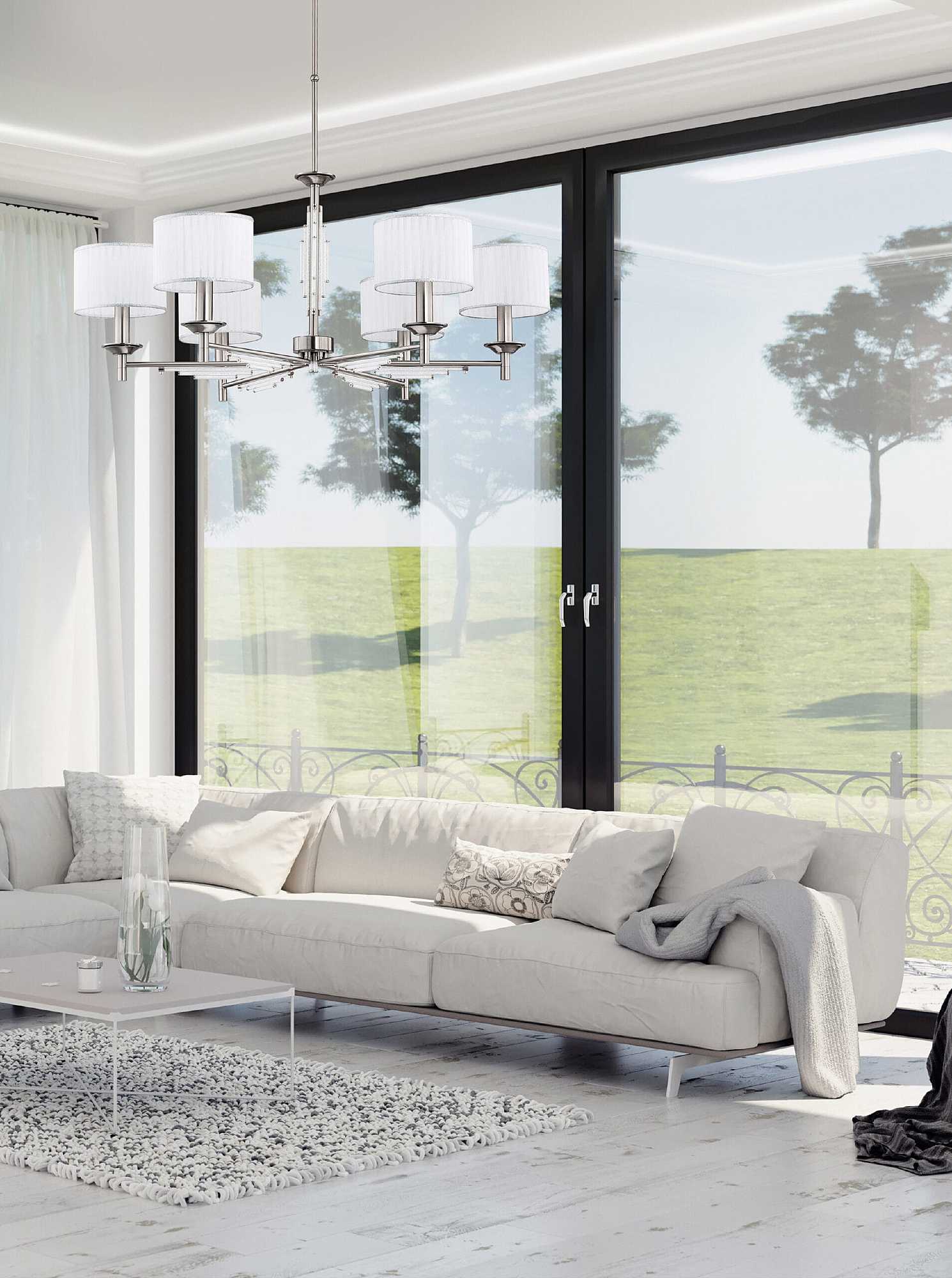 Шестирожковая люстра FEL-ZW-6 (N/A) в никелированной отделке - современная интерпретация классики. Светлые абажуры и холодный блеск арматуры подойдут для сдержанных интерьеров в светло-серой или бежевой палитре.