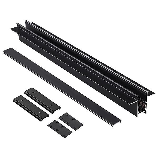 Шинопровод FLUM для монтажа в ГКЛ высотой 12мм. Длина шинопровода 2 метра, в комплект к нему входят две заглушки, два прямых соединителя и крышка из пластика.