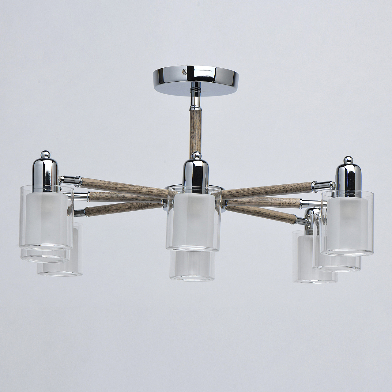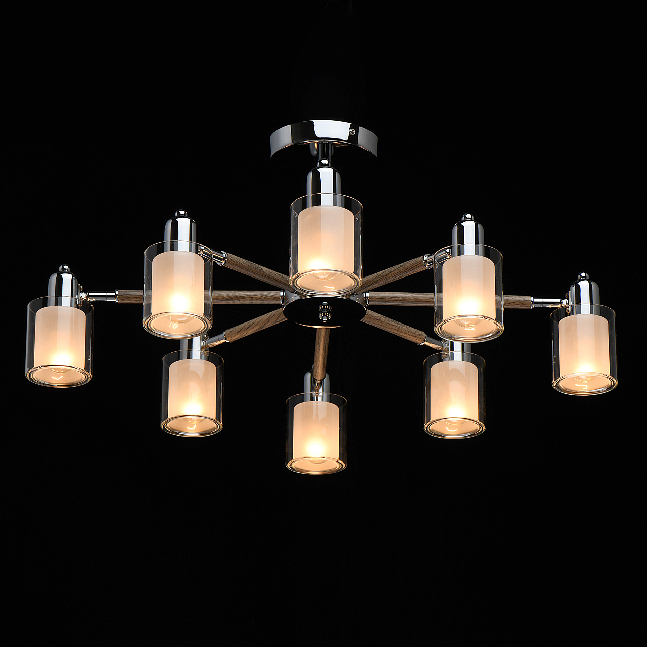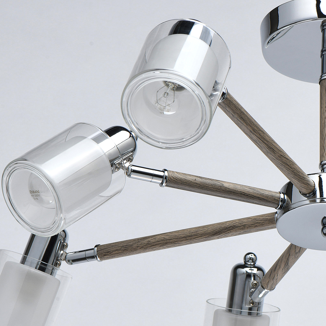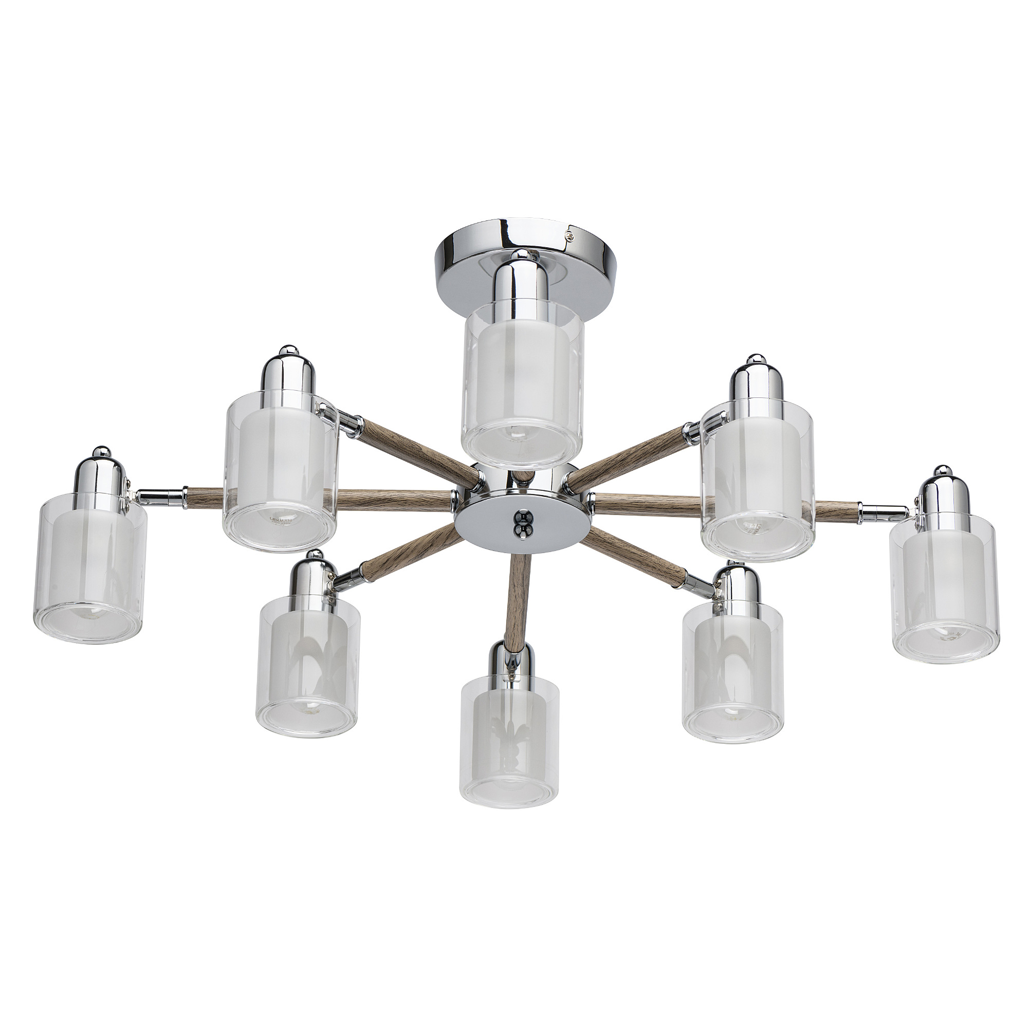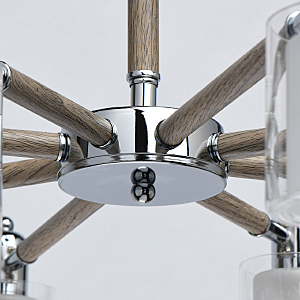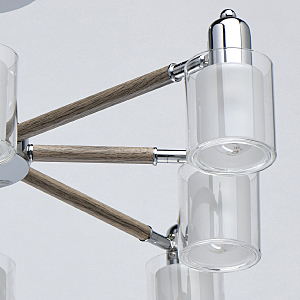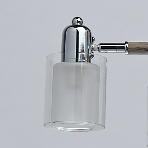 Комбинация эко-цвета ореха и металла в тренде.Заменяемые источники света удобны в эксплуатации.Компактная высота для стандартных потолков.Двойные плафоны из белого и прозрачного стекла декорируют традиционные лампочки накаливания.Широкий диаметр светильника обеспечивает высокие параметры освещенности.Поворот плафона регулирует направление светового потока.Полная семья из бра и потолочного светильника.