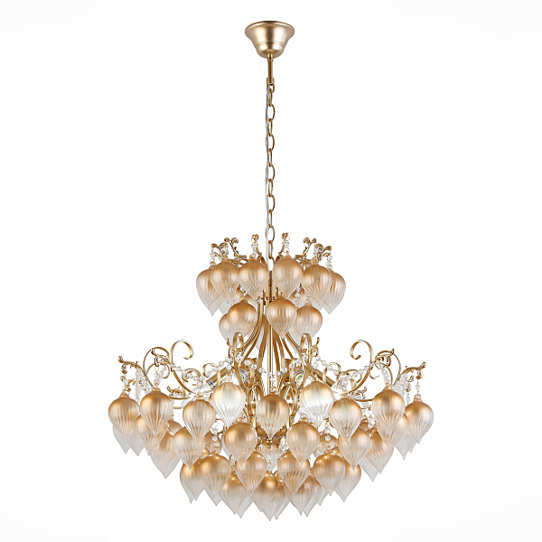 Допускается отличие страны-изготовителя, указанной в характеристиках. Линии производства могут находиться в нескольких государствах. Это не влияет на качество изготовления товара: все заводы данного бренда работают по общим стандартам, а готовые изделия проходят соответствующий контроль.Италия Коллекция Frutti ЦветЦвет арматуры Золото Цвет Золото Материал арматуры Металл Цвет плафона золото Материал плафона Стекло РазмерыВысота (мм) 1150 Диаметр (мм) 580 Высота минимальная (мм) 450 Ширина (мм) 580 ЭлектрикаКоличество ламп (шт) 6 Цоколь E14 Тип лампы Накаливания Мощность лампы (Вт) 40 Общая мощность (Вт) 240 Площадь освещения 12 Дополнительная информацияСпособ крепления Крюк Тип подвеса На цепи -