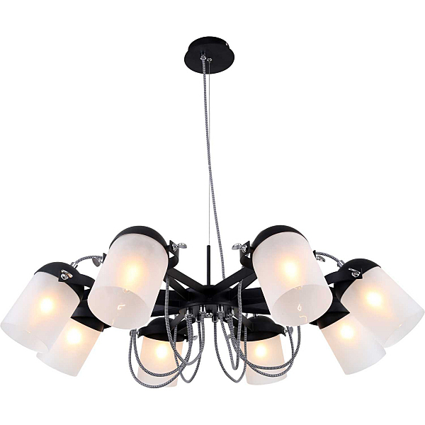 Люстра подвесная 2014/02/08P Stilfort серии Fuoco - креативная модель в стиле модерн. Арматура изготовлена из метала двух цветов - "черный" и "хром". Плафоны люстры выполнены из стекла, прозрачные.