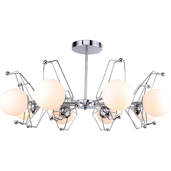 Люстра потолочная на штанге 2019/09/08C Stilfort серии Future отличается креативным дизайном в стиле модерн. Арматура изготовлена из окрашенного металла в цвете "хром". Плафоны люстры выполнены из матового стекла белого цвета.