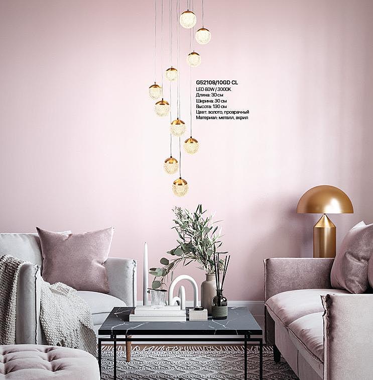 Светильник светодиодный G52108/10GD CL в современном стиле от бренда Gerhort. Каркас выполнен из материала металл, цвет золото. Плафоны (светорассеиватели) выполнены из материала акрил, цвет прозрачный. Встроенные LED модули на 80 Вт осветят до 16 м. Свет теплый, мягкий.