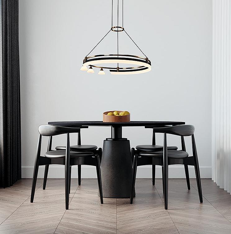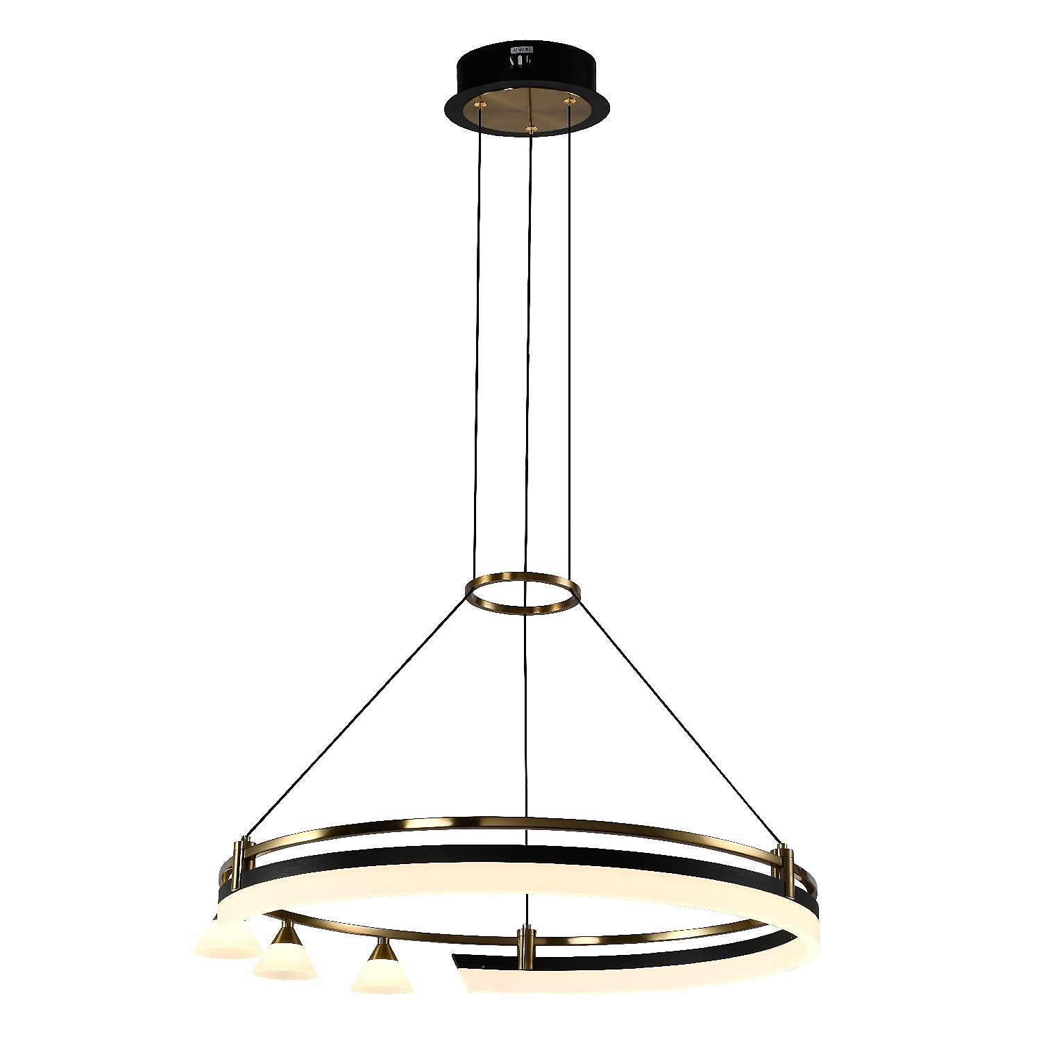 Подвесной светодиодный светильник G52121/1+3R GD+BK WT в современном стиле от бренда Gerhort. Каркас выполнен из материала металл, цвет золото, черный. Плафоны (светорассеиватели) выполнены из материала акрил, цвет белый. Встроенные LED модули на 42 Вт осветят до 10 м. Свет теплый, мягкий.