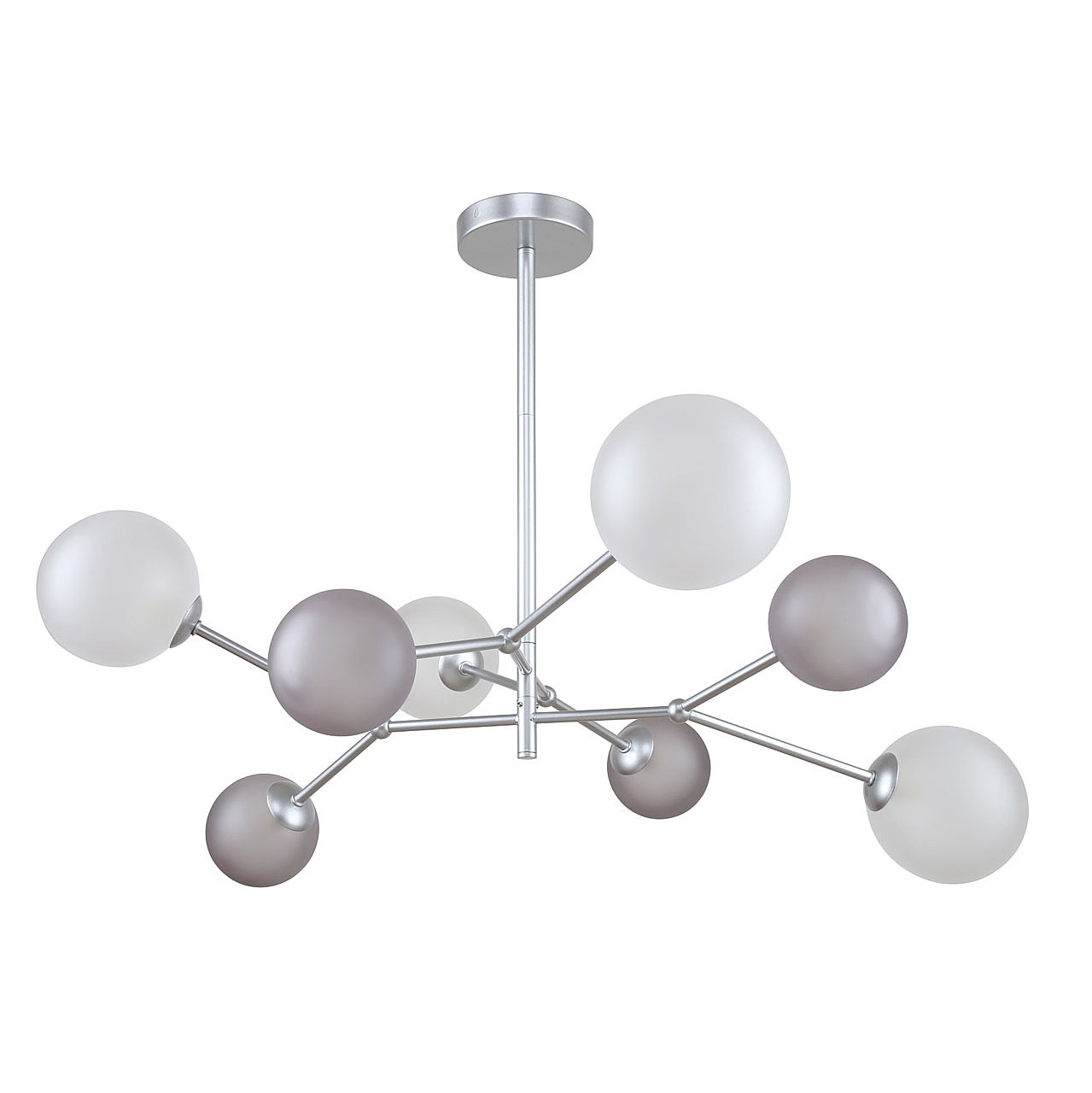Оригинальный дизайн светильника привлекает к себе внимание. Перламутровое серебро в тренде. Дизайн-идея - парящие плафоны разного диаметра, белого и дымчатого цвета. Заменяемые источники света удобны в эксплуатации.