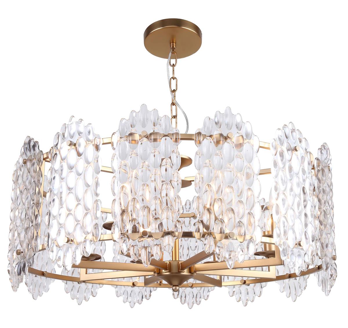 Люстра подвесная из коллекции Glazgo выполнена из металла, окрашенного в цвет бронзы, и декорирована вертикальными прозрачными фактурными стеклами.