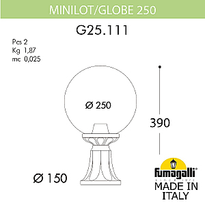 Ландшафтные фонари FUMAGALLI серии GLOBE 250, модель GLOBE 250/MINILOT. Столбик MINILOT с уличным фонарем GLOBE 250. Используются для архитектурного и ландшафтного освещения в стиле "классика". Место установки уличных светильников - перила лестниц, столбы заборов, колонны, тумбы, подпорные стенки, стилобаты, ландшафтные композиции в парках и скверах. В общем, там, где светильник находится на каком-то возвышении, тумбе или подиуме. Изготовлены в Италии, по уникальным технологиям "FUMAGALLI" из современного композитного полимера RESIN. Этот материал в 5 раз прочнее металла, не ржавеет, не окисляется, не выгорает на солнце, его не нужно красить. Все светильники пыле-влаго защищены по стандарту IP55 (Пыленепроницаемые, защита от водяных струй с любого направления). В комплекте идут крепежи и закладные элементы. Рассеиватель выполнен из антивандального, не мутнеющего и не горючего PMMA (ПолиМетилМетаАкрилат). Срок службы светильника - не менее 20 лет. Температура использования от -60 до +90. В серии GLOBE 250 есть фонари в настенном (BISSO/GLOBE 250, OFIR/GLOBE 250, MIRRA/GLOBE 250, PORPORA/GLOBE 250) подвесном (SICHEM/GLOBE 250) и наземном исполнении (IAFAET.R/GLOBE 250, ALOE.R/GLOBE 250, ARTU/GLOBE 250, GIGI/GLOBE 250, RICU/GLOBE 250, RICU/ISSO/GLOBE 250 1L, RICU/ISSO/GLOBE 250 2L, RICU/ISSO/GLOBE 250 3L) со столбами разной высоты, с разным количеством и конфигурацией голов. Консоли настенных фонарей и кронштейны светильников на столбах освщения могут устанавливаться вверх/вниз. Столбы выше 150 см имеют в основе мощную стальную трубу с двойной оцинковкой. При заказе требуется выбрать цвет корпуса, цвет плафона и тип патрона. По стилю и дизайну серия уличных светильников GLOBE 250 похожа на светильники большого размера GLOBE 400 и на светильники среднего размера GLOBE 300.
