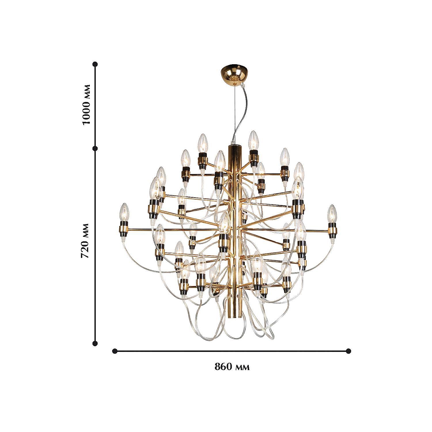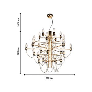 Допускается отличие страны-изготовителя, указанной в характеристиках. Линии производства могут находиться в нескольких государствах. Это не влияет на качество изготовления товара: все заводы данного бренда работают по общим стандартам, а готовые изделия проходят соответствующий контроль.Германия Коллекция Golem ЦветЦвет арматуры золотой Цвет Золото Материал арматуры Металл РазмерыВысота (мм) 1720 Диаметр (мм) 860 Высота минимальная (мм) 720 Ширина (мм) 860 ЭлектрикаКоличество ламп (шт) 30 Цоколь E14 Мощность лампы (Вт) 40W Напряжение (В) 220 Дополнительная информацияСпособ крепления Крюк Вес (Кг) 5 Тип подвеса На тросах -