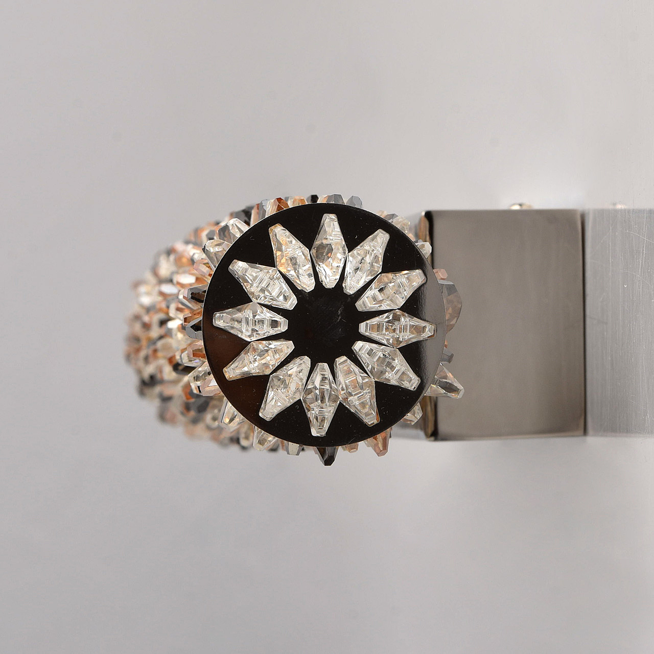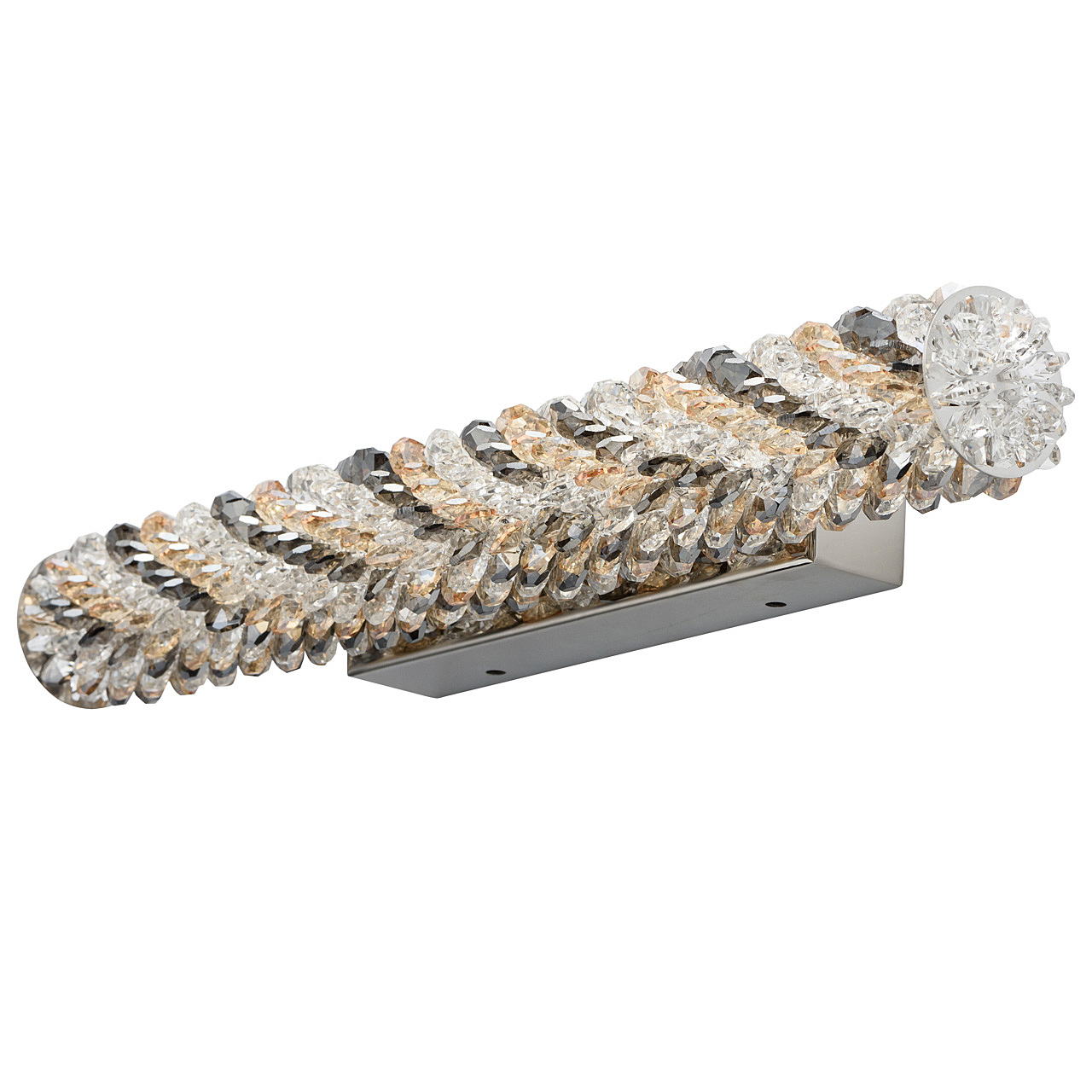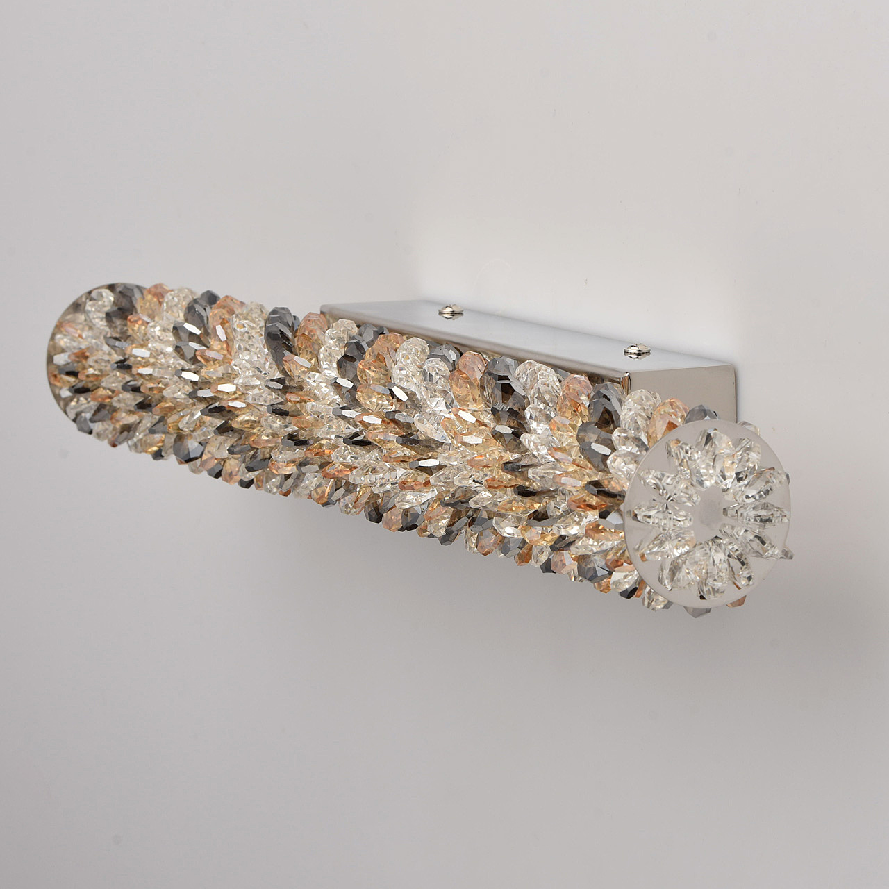 Праздничное сияние, роскошь и элегантность сочетает в себе настенный светильник из коллекции "Гослар". Хромированное основание из металла подчеркнуто зеркальным эффектом. На этом фоне особенно ярко выделяется необычный удлиненный плафон, выполненный в форме цилиндра из витых бусин трех оттенков - прозрачного, дымчатого и цвета драгоценного янтаря. Модель подойдет для создания необычно красивого настенного освещения.