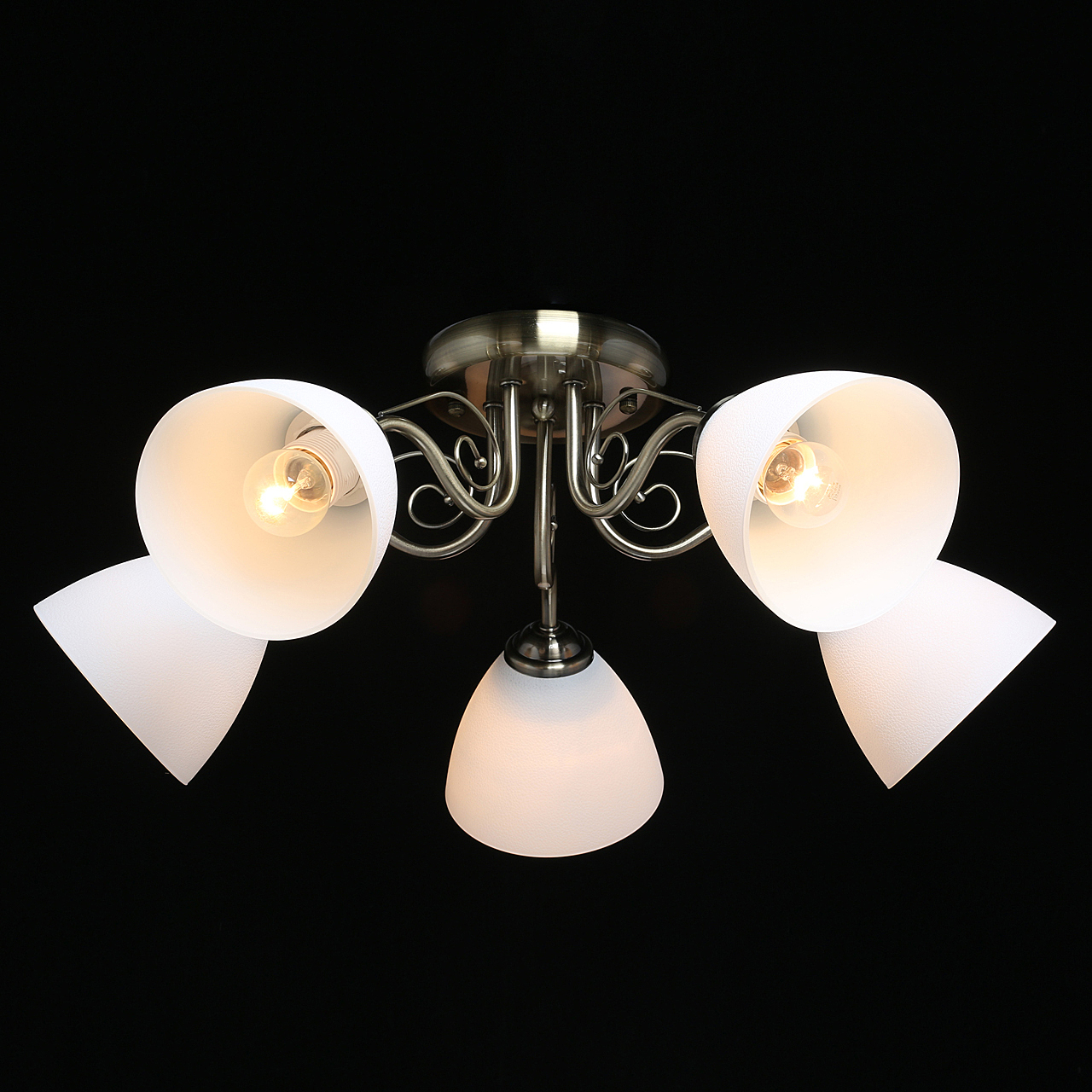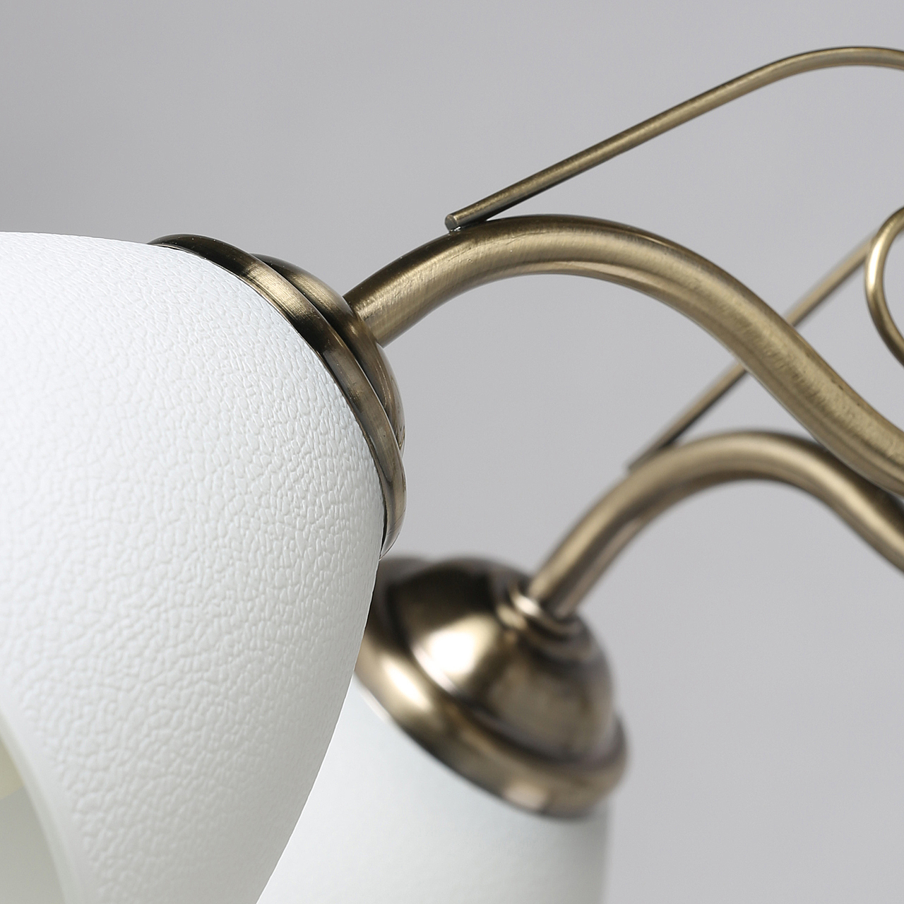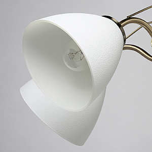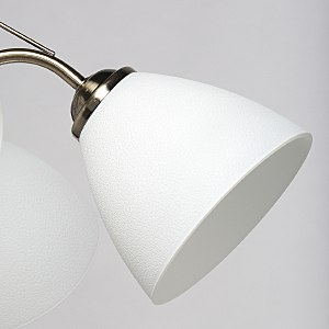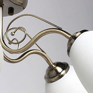 Популярный цвет античной бронзы основания светильника.Плафоны из фактурного стекла белого цвета обеспечивают мягкий световой поток.Металлический декор создает дополнительные акценты.Заменяемые источники света удобны в эксплуатации.