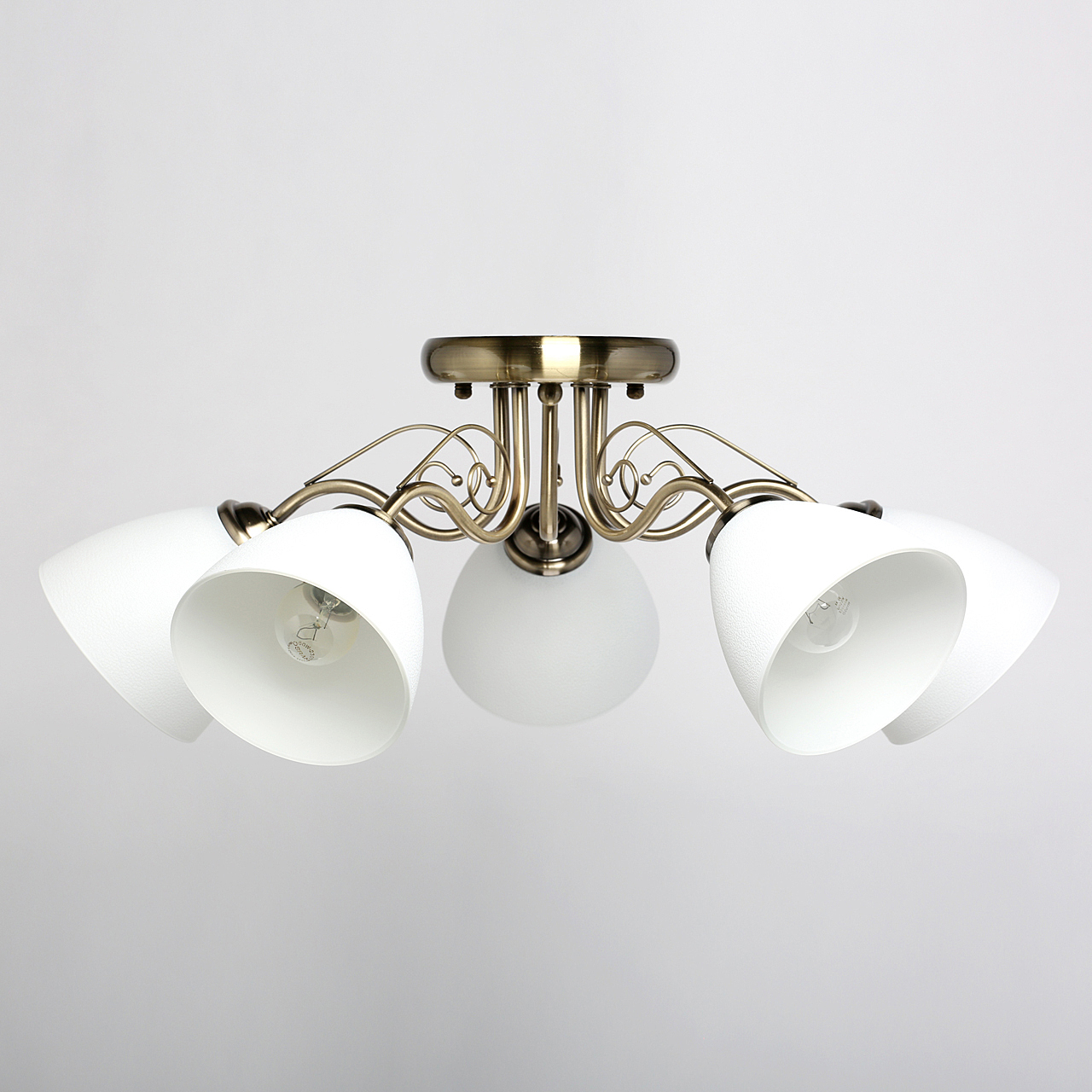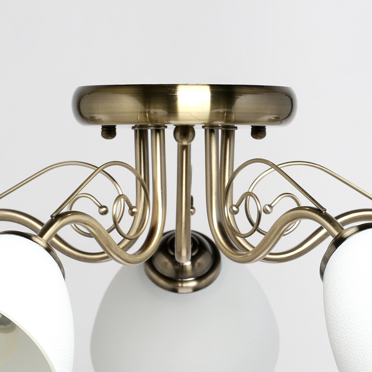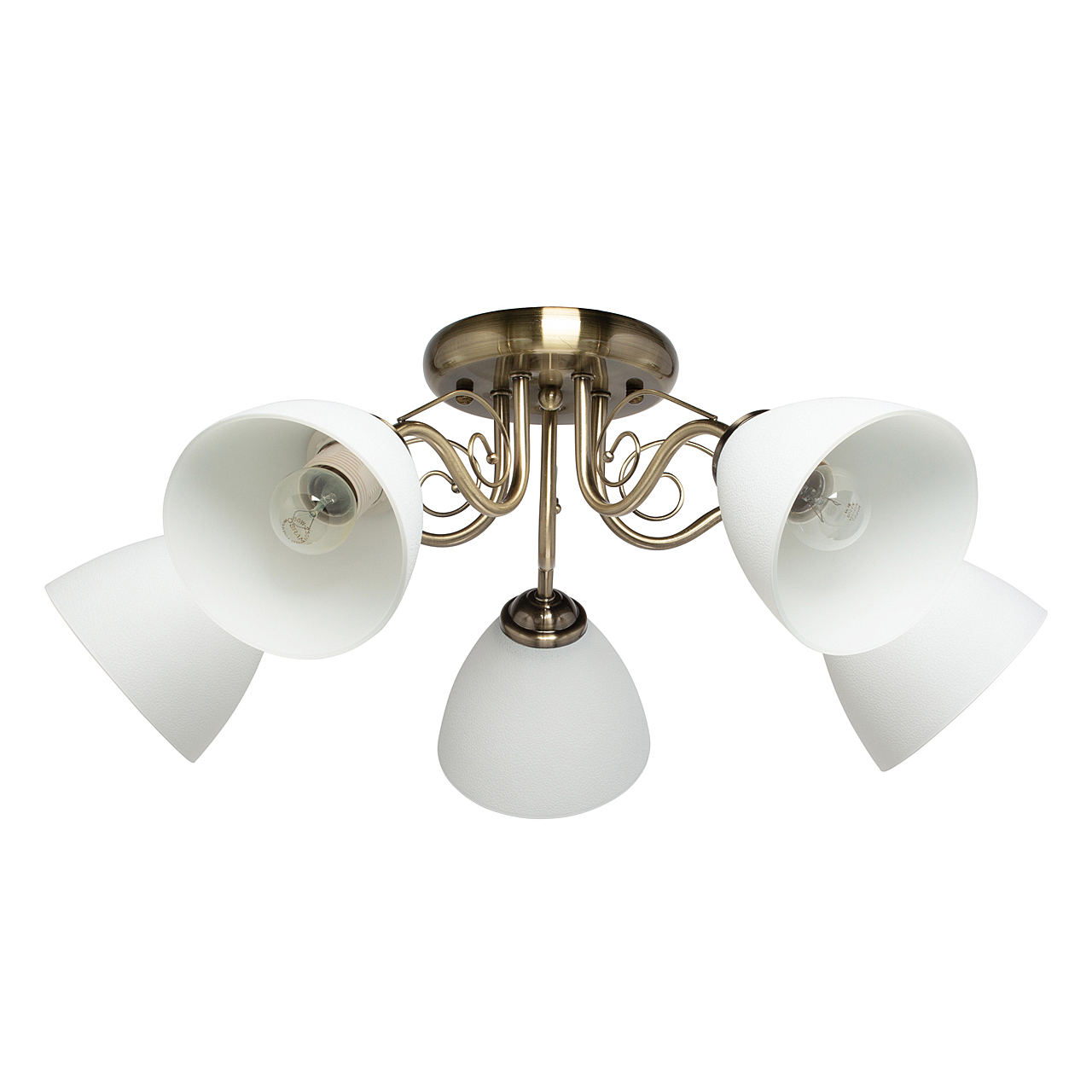 Популярный цвет античной бронзы основания светильника.Плафоны из фактурного стекла белого цвета обеспечивают мягкий световой поток.Металлический декор создает дополнительные акценты.Заменяемые источники света удобны в эксплуатации.