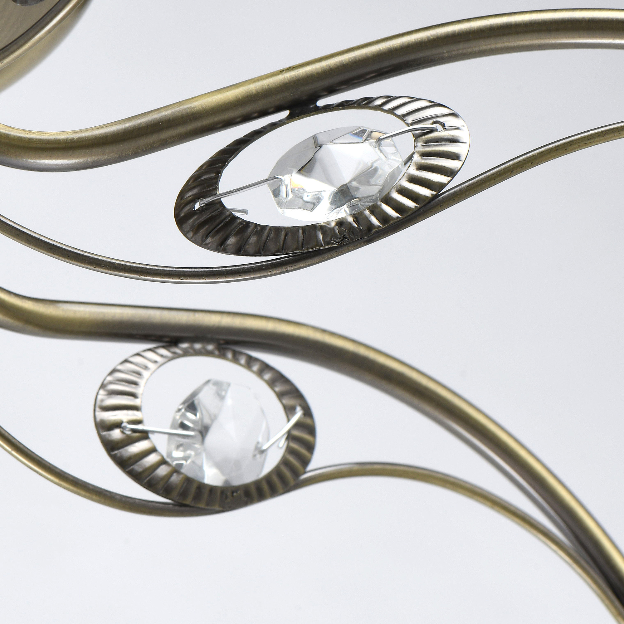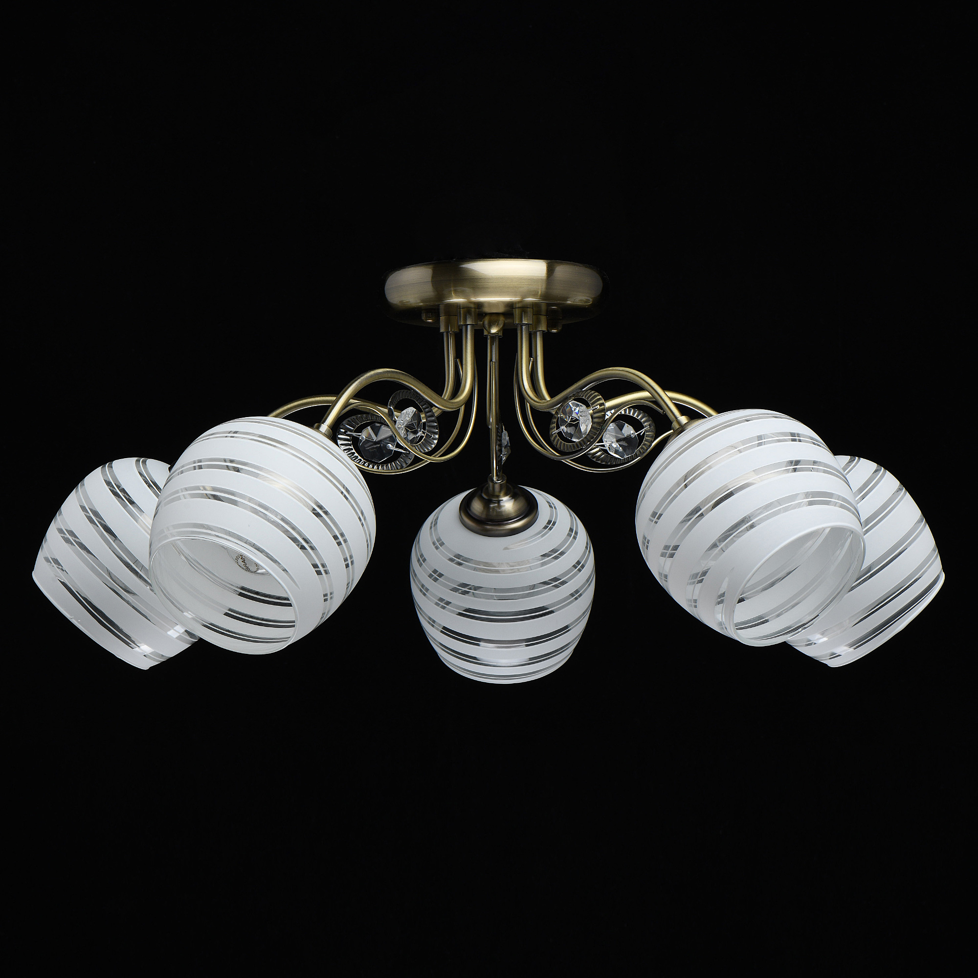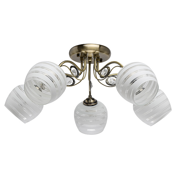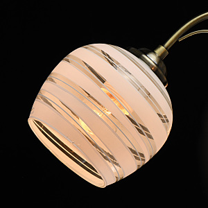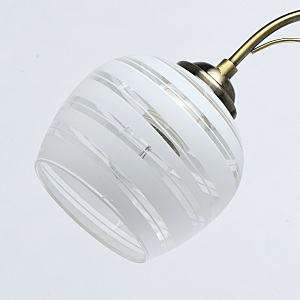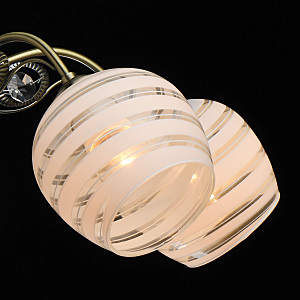 Популярный цвет античной латуни основания светильника.Компактная высота светильника идеальна для стандартной высоты потолка. Декор рожков дополнен декоративными кристаллами из стекла в металлической оправе.Плафоны с чередованием прозрачных и матовых полос мягко рассеивают свет.Заменяемые источники света удобны в эксплуатации.