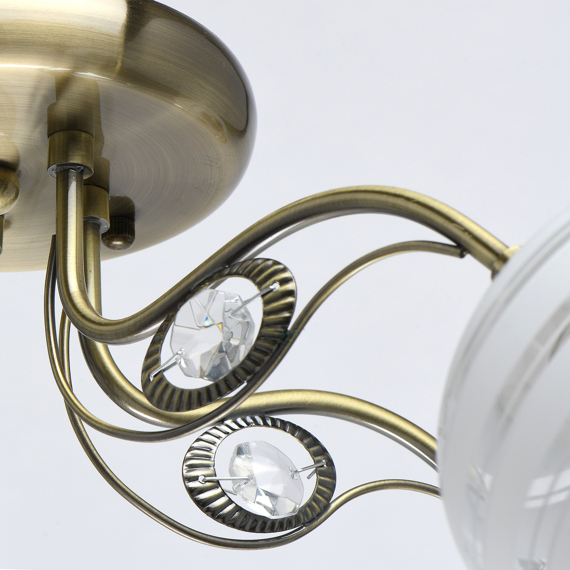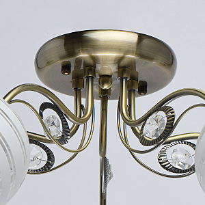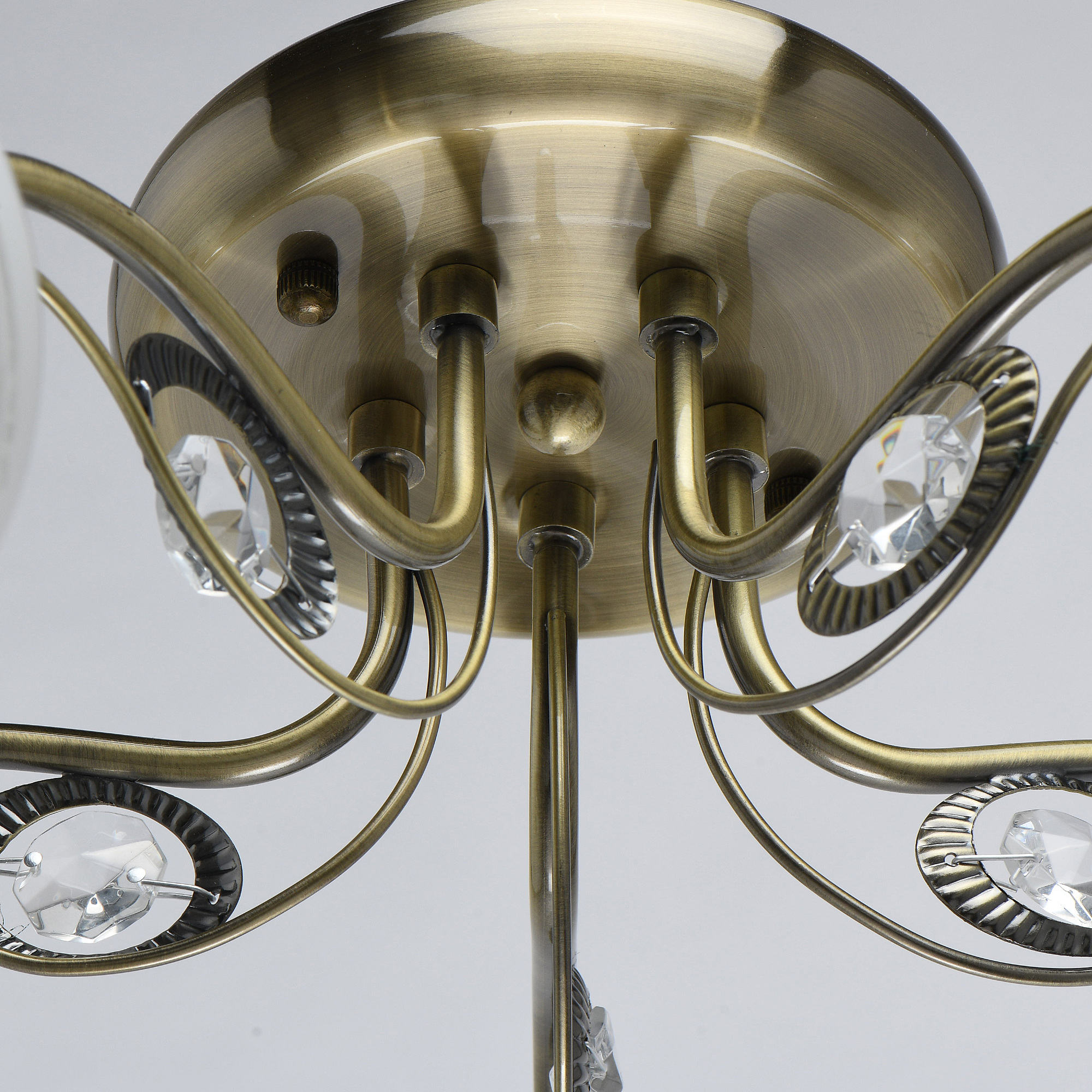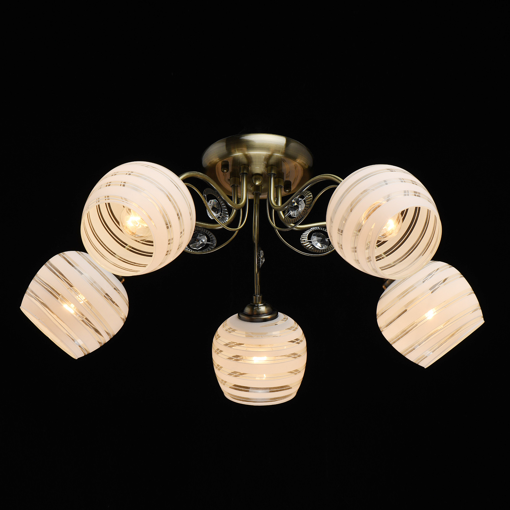 Популярный цвет античной латуни основания светильника.Компактная высота светильника идеальна для стандартной высоты потолка. Декор рожков дополнен декоративными кристаллами из стекла в металлической оправе.Плафоны с чередованием прозрачных и матовых полос мягко рассеивают свет.Заменяемые источники света удобны в эксплуатации.