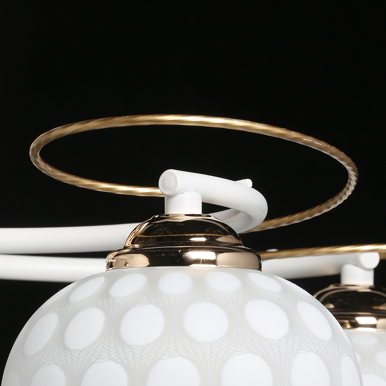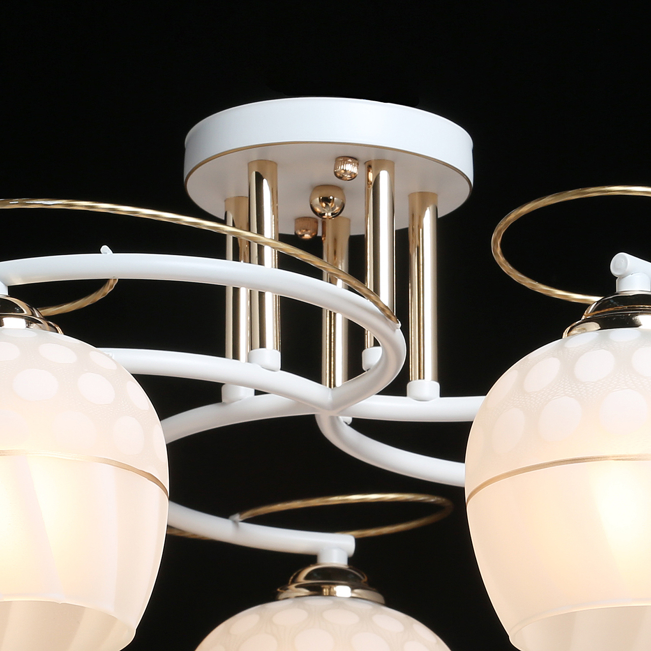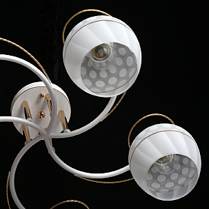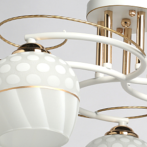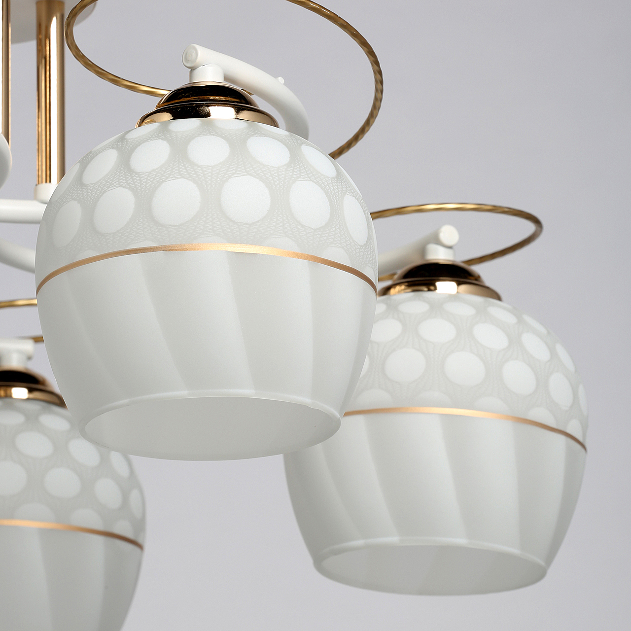 Актуальное сочетание металлического основания белого цвета и цвета золота. Плафоны гладкого стекла с комбинированным рисунком и декоративным кантом.Заменяемые источники света удобны в эксплуатации.Компактная высота модели идеальна для стандартной высоты потолка.