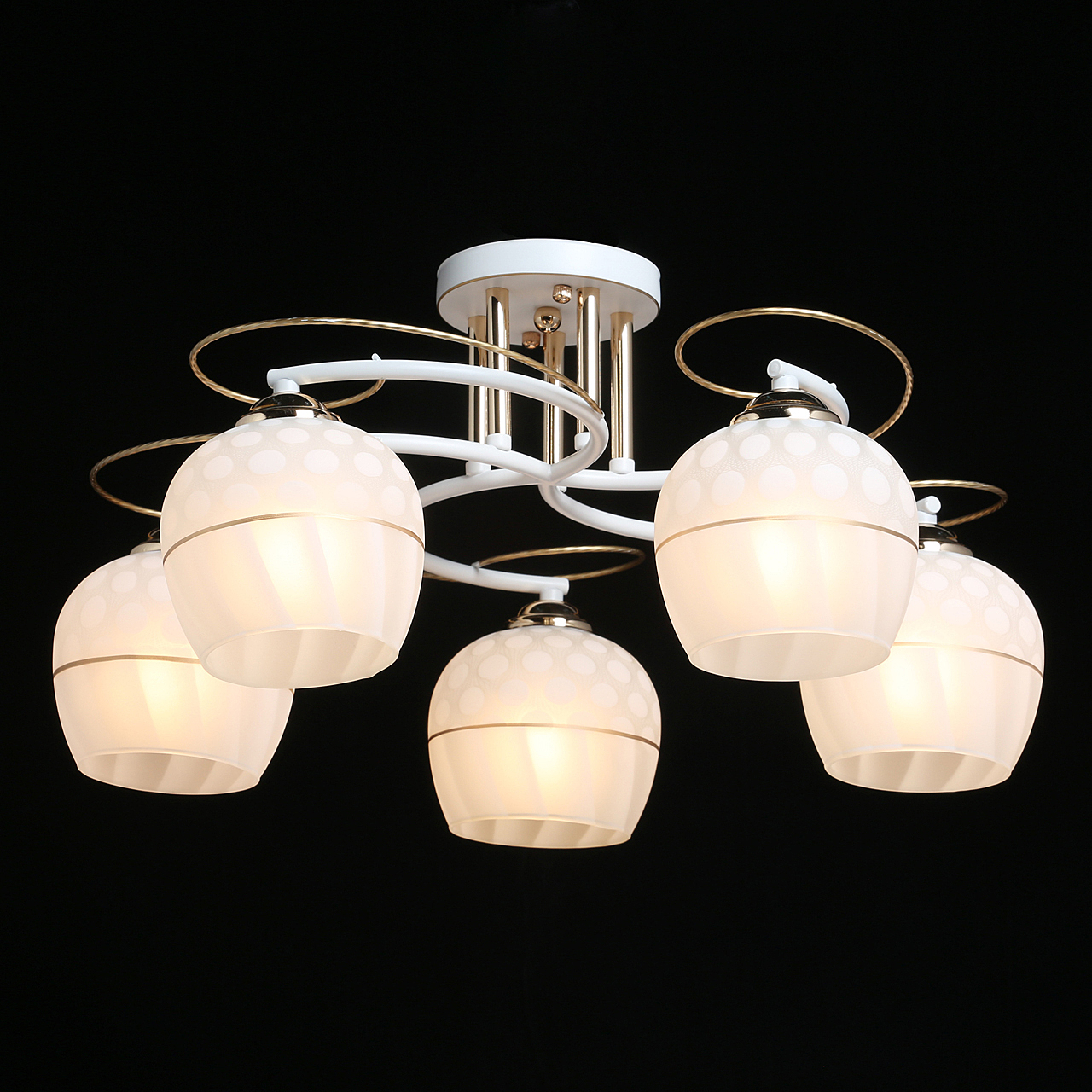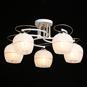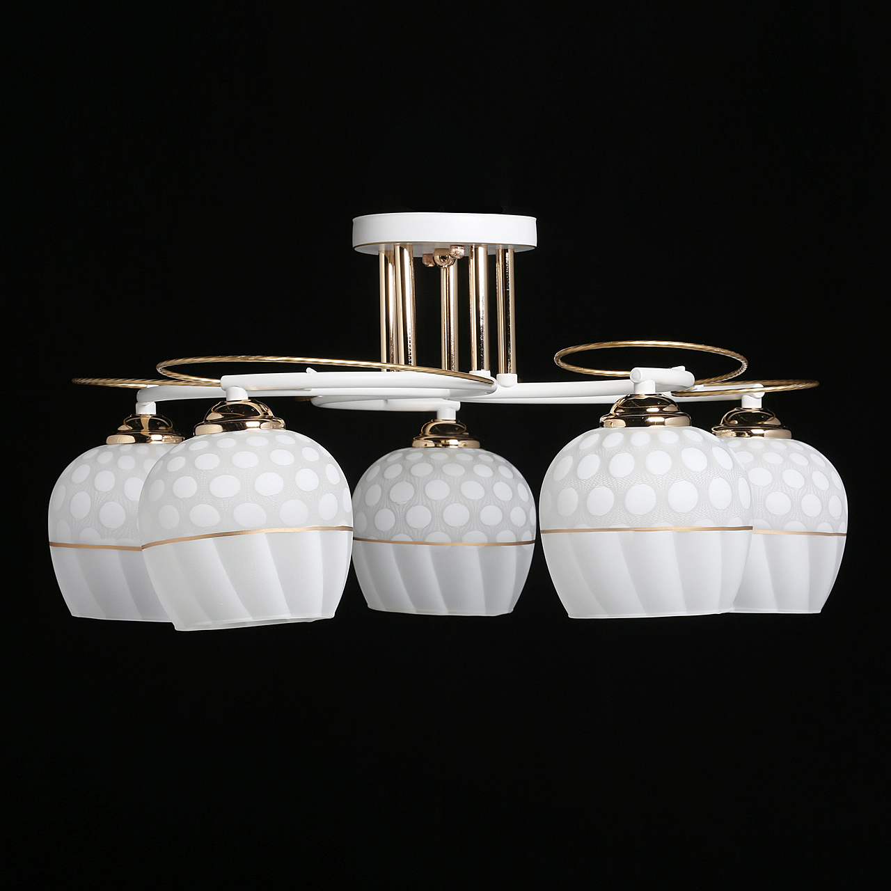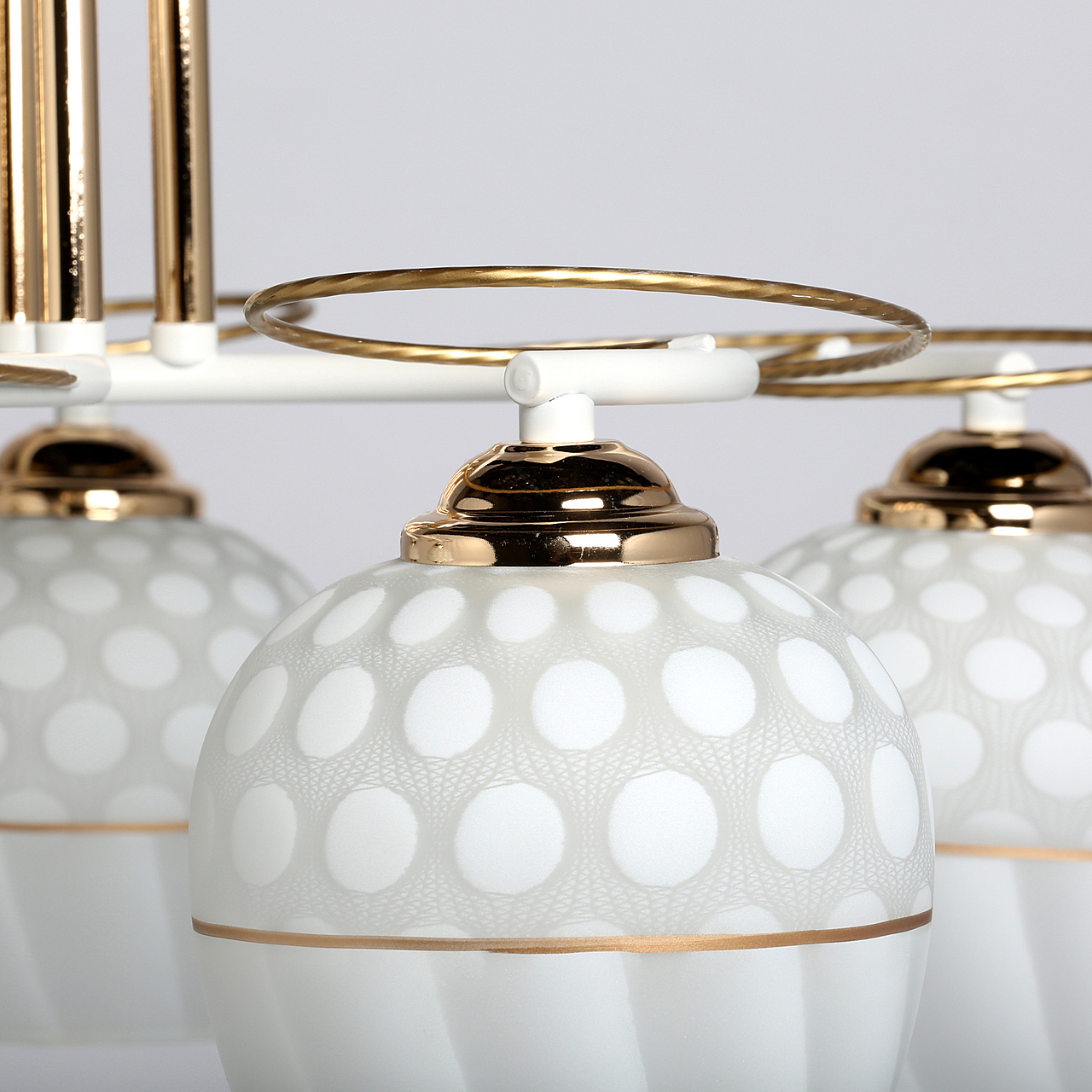 Актуальное сочетание металлического основания белого цвета и цвета золота. Плафоны гладкого стекла с комбинированным рисунком и декоративным кантом.Заменяемые источники света удобны в эксплуатации.Компактная высота модели идеальна для стандартной высоты потолка.