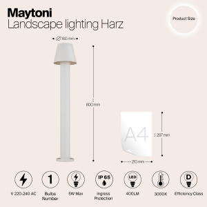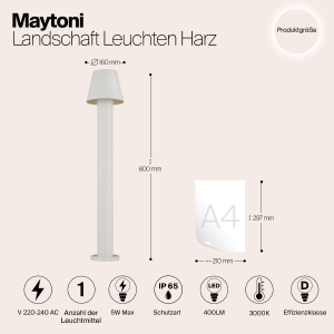 Допускается отличие страны-изготовителя, указанной в характеристиках. Линии производства могут находиться в нескольких государствах. Это не влияет на качество изготовления товара: все заводы данного бренда работают по общим стандартам, а готовые изделия проходят соответствующий контроль.Германия Коллекция Harz ЦветЦвет арматуры Белый Цвет Белый Материал арматуры Металл Форма плафона Круглый плафон РазмерыВысота (мм) 800 Диаметр (мм) 160 Ширина (мм) 160 ЭлектрикаКоличество ламп (шт) 1 Цоколь LED Тип лампы Светодиодная Лампочки в комплекте Нет в комплекте Мощность лампы (Вт) 5 Напряжение (В) 220 Световой поток 400 Цветовая температура 3000 Дополнительная информацияСтепень защиты (IP) IP65 Вес (Кг) 1,61 Техническая оссобеность Полностью светодиодная -