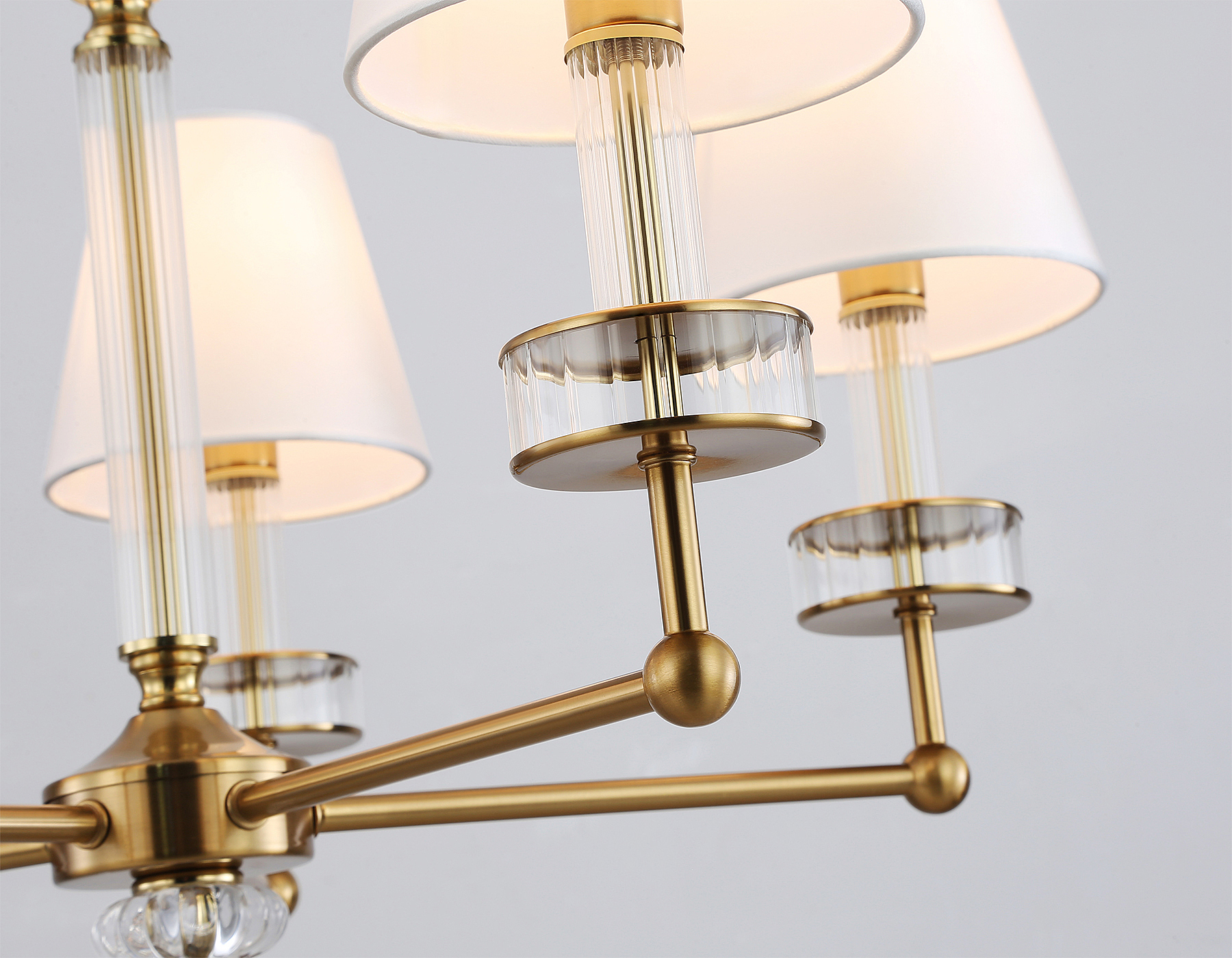 Подвесная люстра с абажурами и хрусталем из коллекции HIGH LIGHT. Модель LH71021 представлена в стиле неоклассика. Люстра выполнена из металла цвета латунь, тканевых плафонов белого цвета и декорирована превосходным прозрачным хрусталем. Для данной модели подойдут лампы с цоколем Е14. Люстра будет прекрасным дополнением в любом помещении.