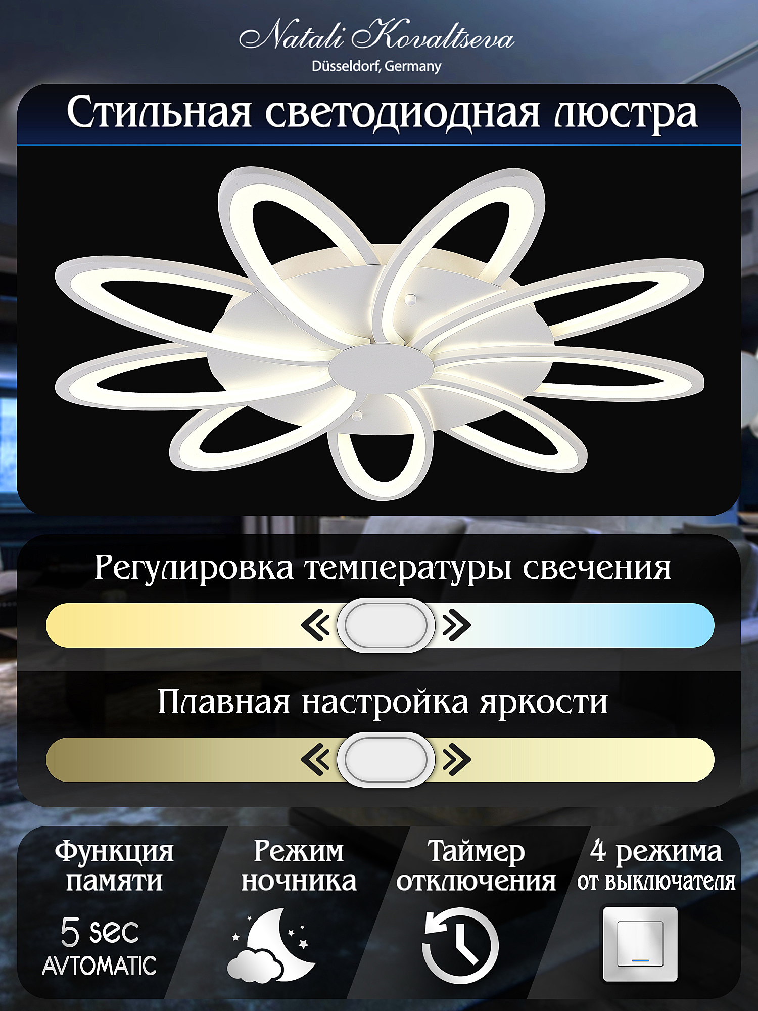 Высококачественный LED светильник в современном стиле с функционалом "умный дом". Данная люстра сочетает в себе исключительный дизайн и обширную функциональность. Лицевую часть составляют равноудалённые друг от друга рожки с симметричным дизайнерским узором, благодаря которому светильник подойдёт в любой интерьер. По их периметру расположена подсветка, которая обеспечивает отличное рассеивание света. Многофункциональный пульт управления позволит дистанционно управлять светильником. Возможность управлять светильником со смартфона и планшета, загрузив специальное приложение. Люстра имеет тёплый, естественный и холодный свет с регулировкой температуры свечения. Кроме того, имеется функция регулировки яркости свечения, делая светильник оптимальным в процессе использования. Имеет режим ночника и таймер отключения. Общая мощность лампы 200 Ватт. Потолочный светодиодный светильник может осветить до 26 метров2. Он прост в сборке, установке и экономичен в обслуживании. Подойдёт для всех видов потолков. Степень защиты 20 IP. Светодиодные ленты и платы легко заменимы в случае перегорания. Цветовая температура от 2700 до 7000Kelvin(K). Состав: Металл, Акрил. Световой поток 16200 lm.