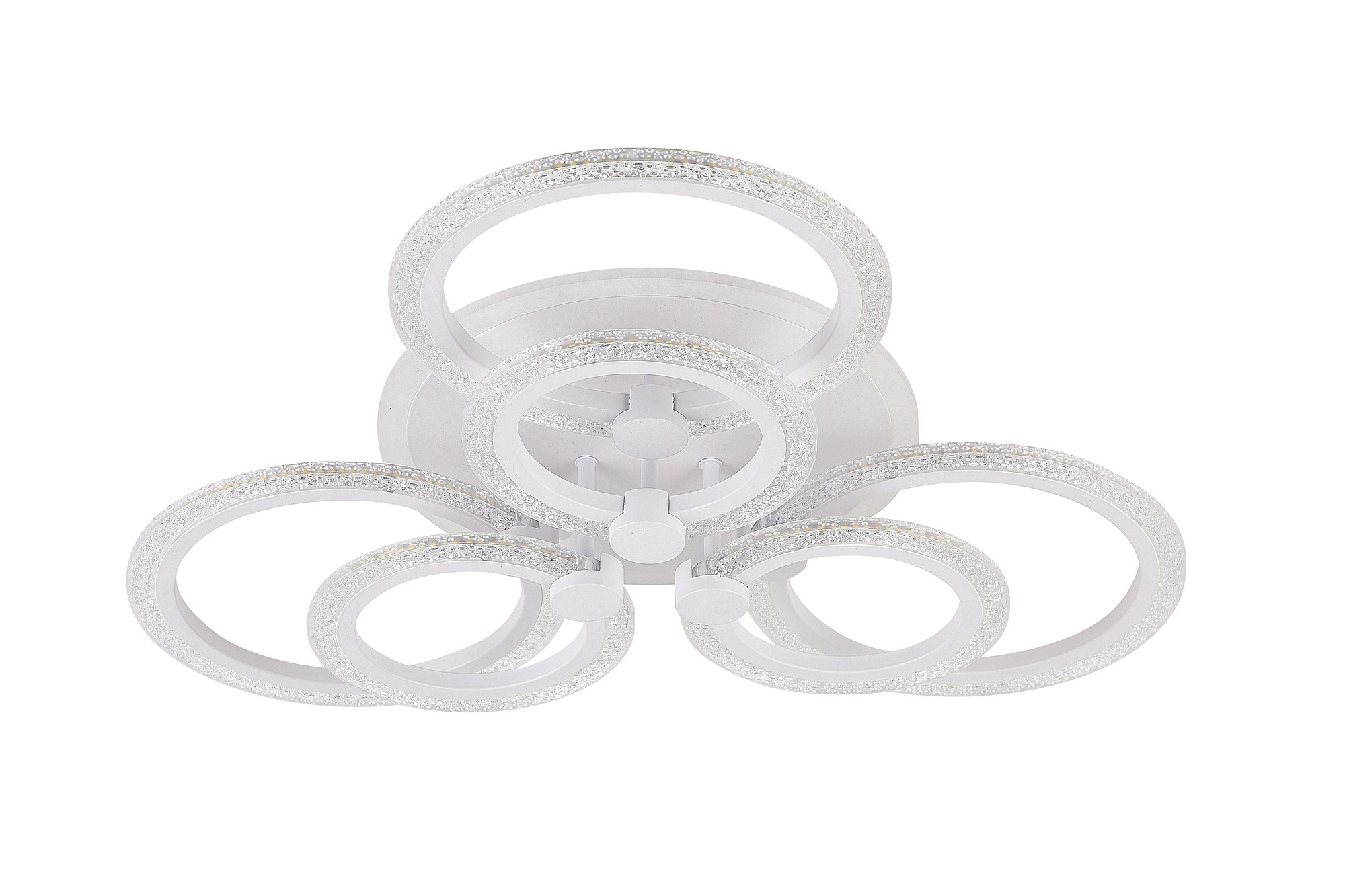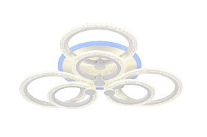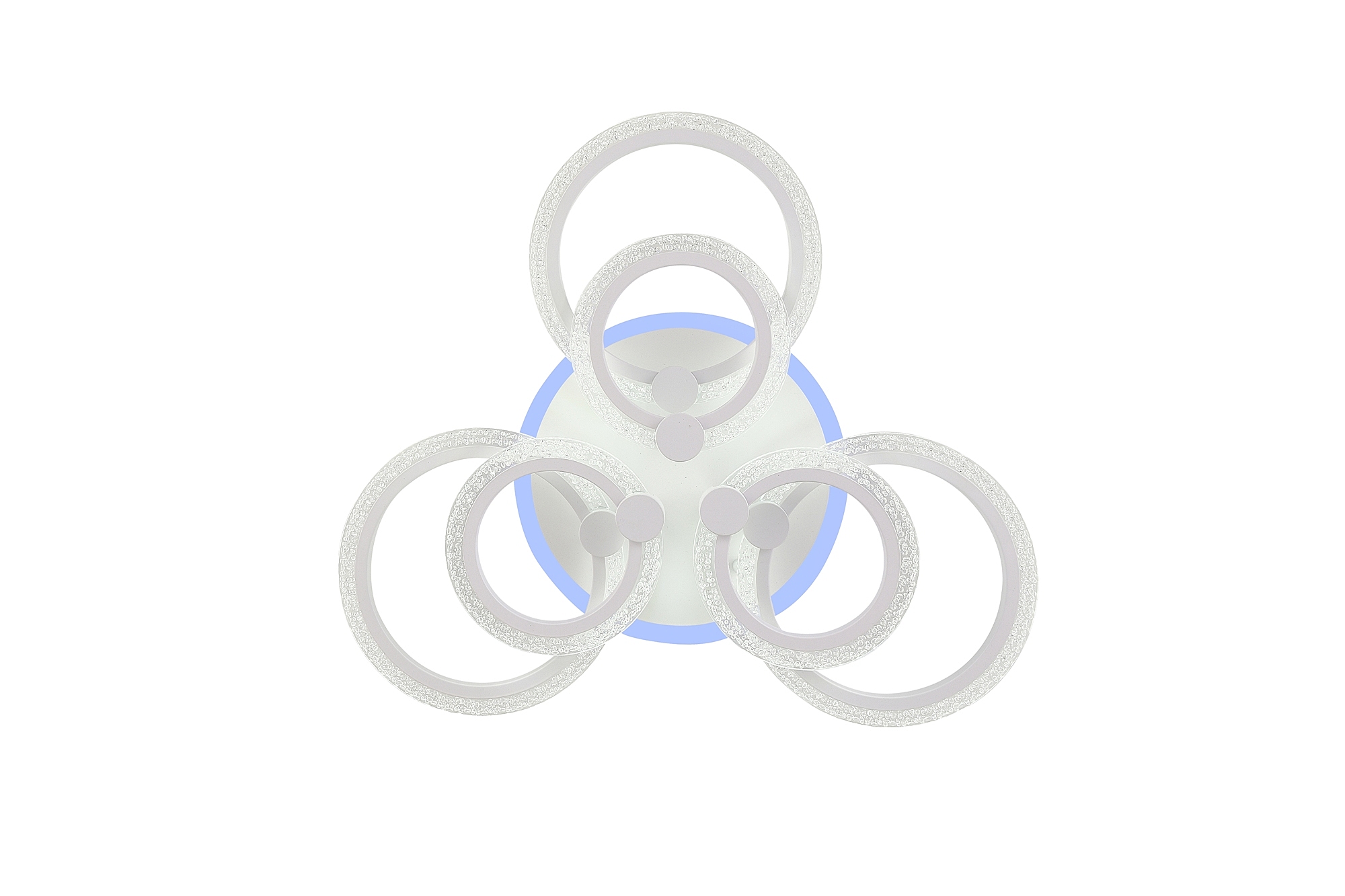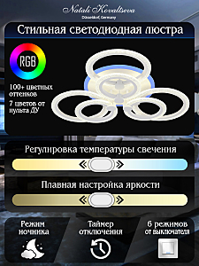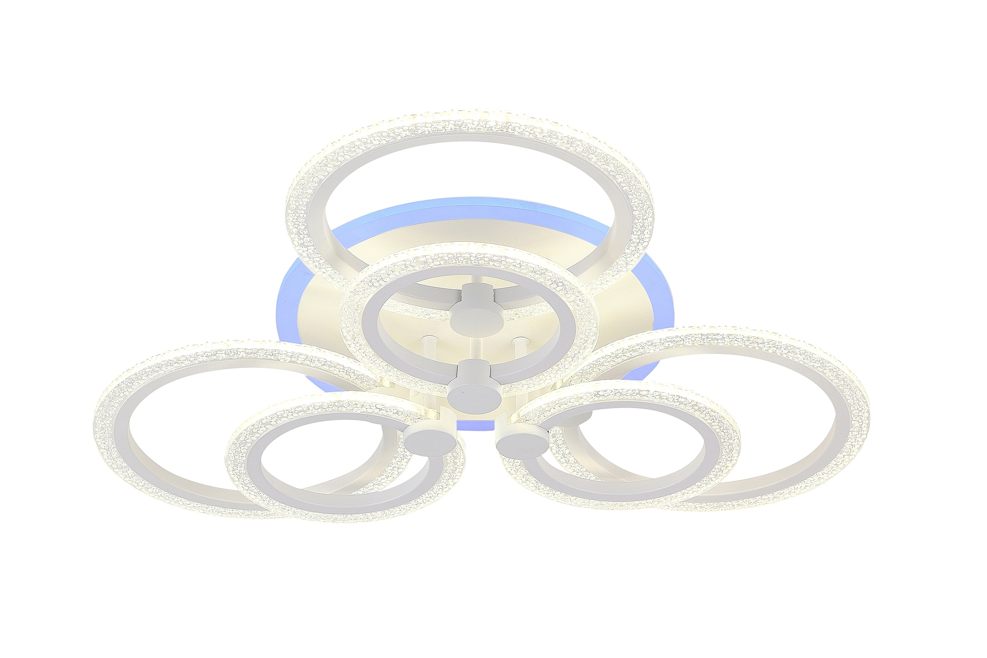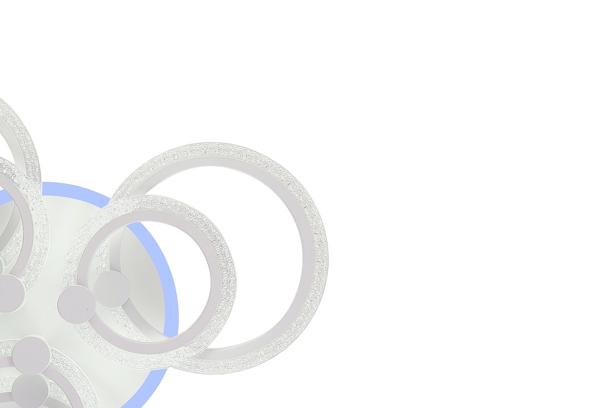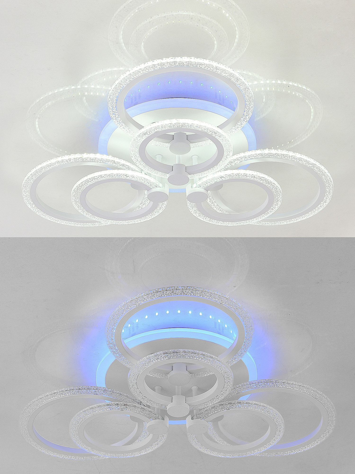 Светодиодный светильник с дистанционным управлением через пульт ДУ, смартфон, планшет. Лицевую часть составляют равноудалённые друг от друга рожки округлой формой. По их периметру расположена подсветка, а пузырчатое стекло обеспечивает отличное рассеивание света. В качестве дополнительного освещения имеет подсветку с RGB-палитрой, которая включает в себя 7 разных цветов с возможностью плавного их переливания. Дизайн люстры выполнен в современном стиле в белом цвете и отлично подойдёт в любой интерьер. Люстра имеет тёплый, естественный и холодный свет с регулировкой температуры свечения. Обладает плавной настройкой яркости в диапазоне от 10% до 100%. Имеется режим ночника и таймер отключения. Кроме того, от стандартного выключателя люстра имеет 6 режима свечения. Данные функции делают светильник оптимальным в процессе использования. Общая мощность 100W со световым потоком 8000 lm позволяет осветить до 24 кв.м. Он прост в сборке, установке и экономичен в обслуживании. Светодиоды легко заменимы в случае перегорания. Люстра подойдёт для всех видов потолков. Цветовая температура настраивается от 2700 до 7000 K. Степень защиты 20 IP.