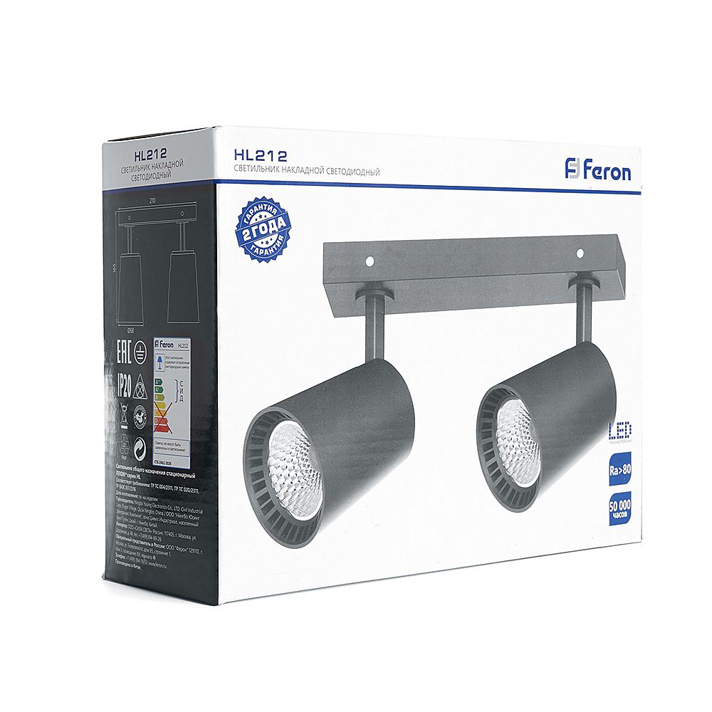 Светильник накладной светодиодный для акцентного освещения, спот поворотный (ДПО) FERON HL212, 2*12W, 4000К (белый), 170-265V, 2160Lm, IP20, угол рассеивания 35градусов, цвет черный, корпус алюминий, рассеиватель поликарбонат, 210*68*165