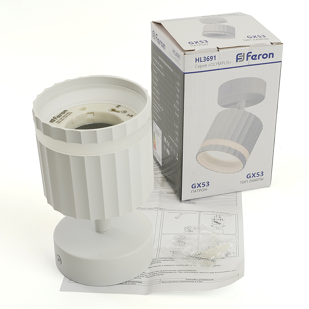 Светильник накладной под лампу, спот (-) FERON HL3691, GX53 1*12W, 230V, IP20, цвет белый, корпус алюминий, акрил, 85*85*75