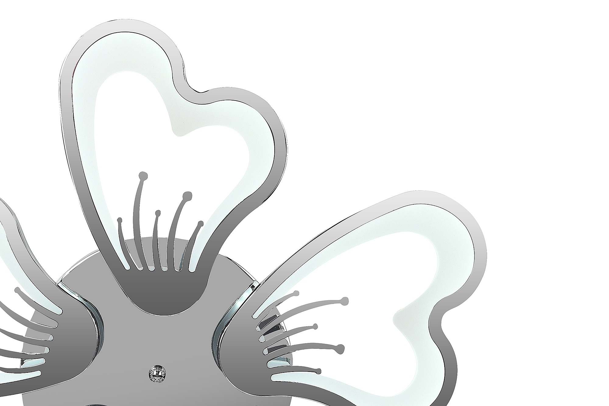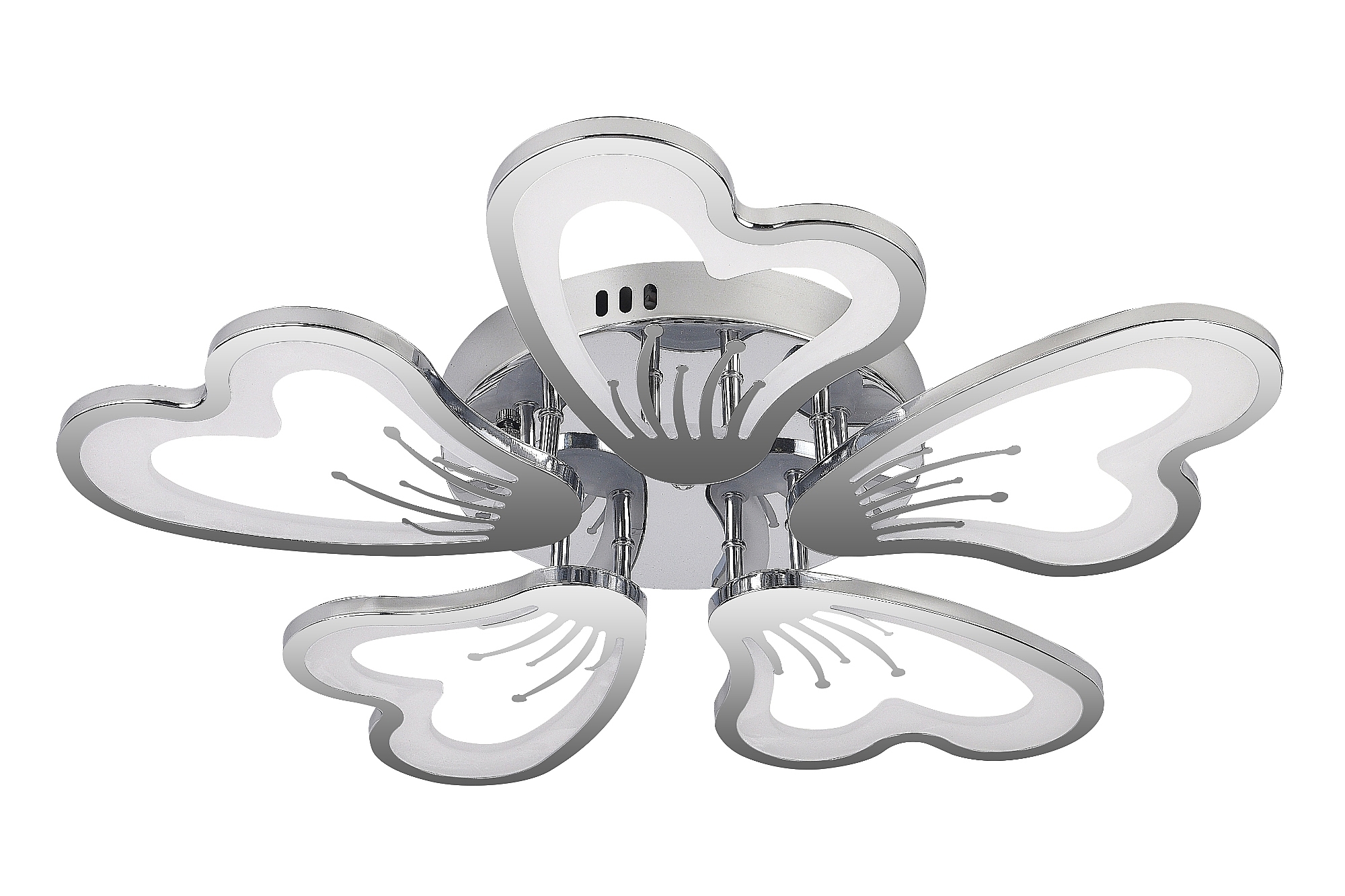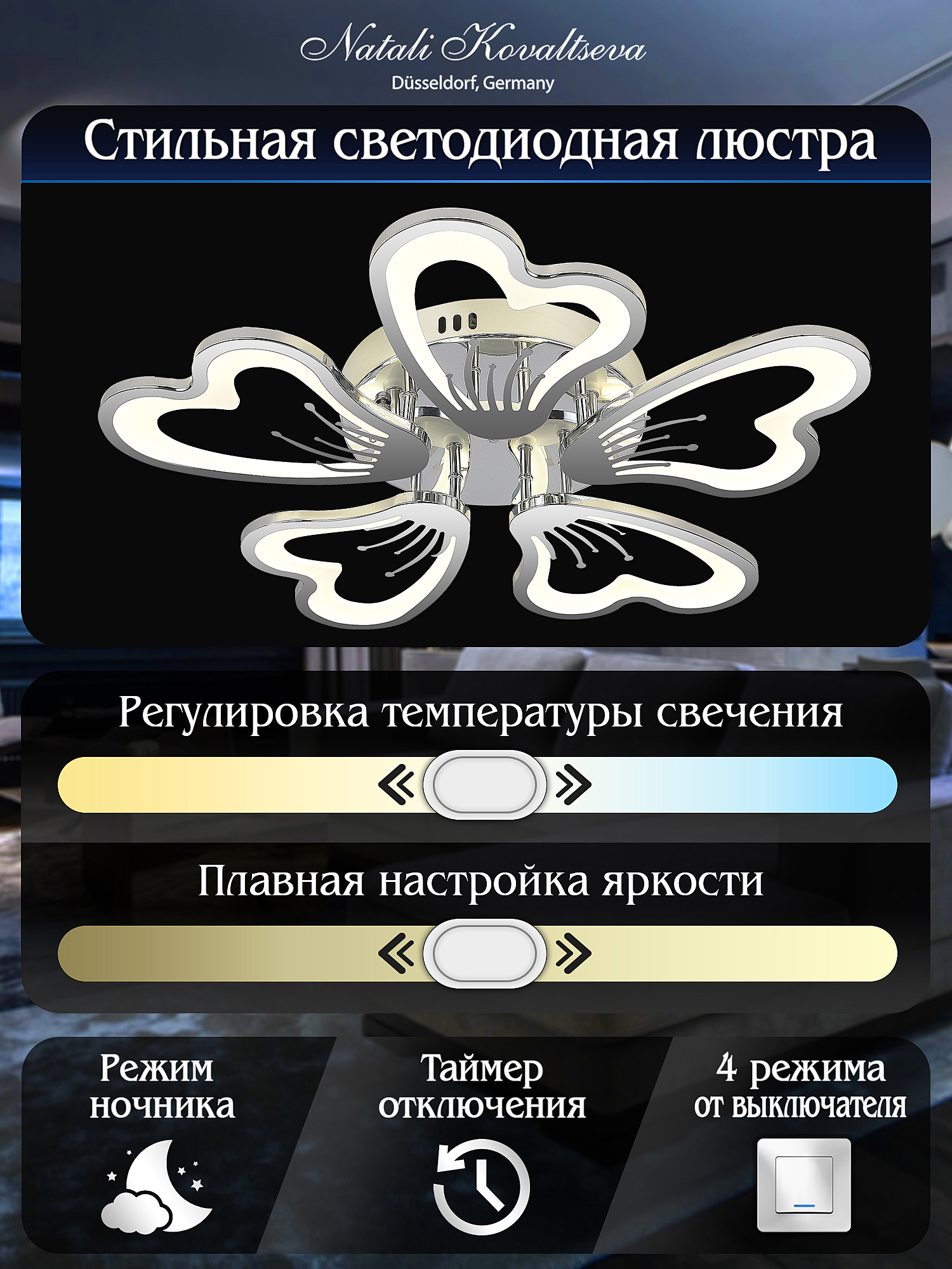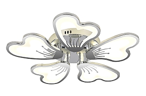 Светодиодный светильник с дистанционным управлением через пульт ДУ, смартфон, планшет. Лицевую часть составляют равноудалённые друг от друга рожки с симметричным дизайнерским узором. По их периметру расположена подсветка, а акрил обеспечивает отличное рассеивание света. Дизайн люстры выполнен в современном стиле в цвете хром и отлично подойдёт в любой интерьер. Люстра имеет тёплый, естественный и холодный свет с регулировкой температуры свечения. Обладает плавной настройкой яркости в диапазоне от 10% до 100%. Имеется режим ночника и таймер отключения. Кроме того, от стандартного выключателя люстра имеет 4 режима свечения. Данные функции делают светильник оптимальным в процессе использования. Общая мощность 100W со световым потоком 8000 lm позволяет осветить до 22 кв.м. Он прост в сборке, установке и экономичен в обслуживании. Люстра подойдёт для всех видов потолков. Цветовая температура настраивается от 2700 до 7000 K. Степень защиты 20 IP.