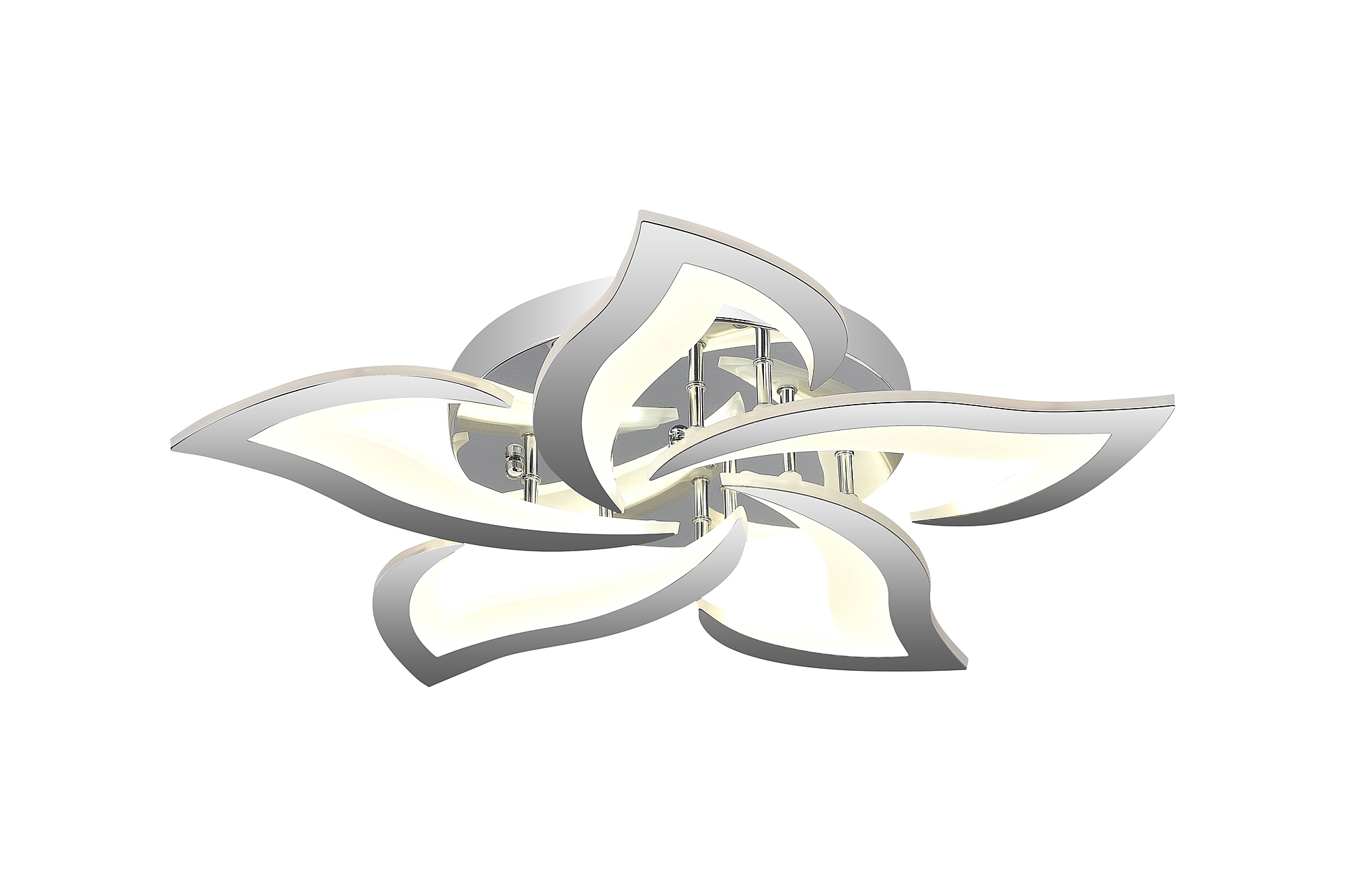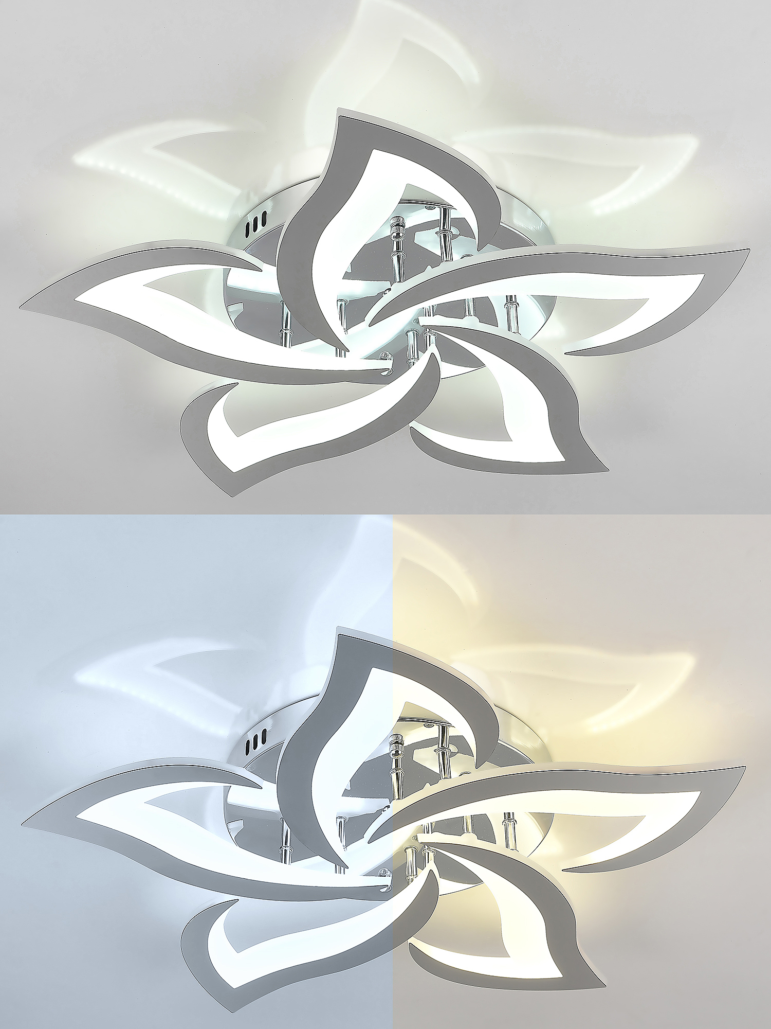 Светодиодный светильник с дистанционным управлением через пульт ДУ, смартфон, планшет. Лицевую часть составляют равноудалённые друг от друга рожки с симметричным дизайнерским узором. По их периметру расположена подсветка, а акрил обеспечивает отличное рассеивание света. Дизайн люстры выполнен в современном стиле в цвете хром и отлично подойдёт в любой интерьер. Люстра имеет тёплый, естественный и холодный свет с регулировкой температуры свечения. Обладает плавной настройкой яркости в диапазоне от 10% до 100%. Имеется режим ночника и таймер отключения. Кроме того, от стандартного выключателя люстра имеет 4 режима свечения. Данные функции делают светильник оптимальным в процессе использования. Общая мощность 100W со световым потоком 8000 lm позволяет осветить до 18 кв.м. Он прост в сборке, установке и экономичен в обслуживании. Люстра подойдёт для всех видов потолков. Цветовая температура настраивается от 2700 до 7000 K. Степень защиты 20 IP.
