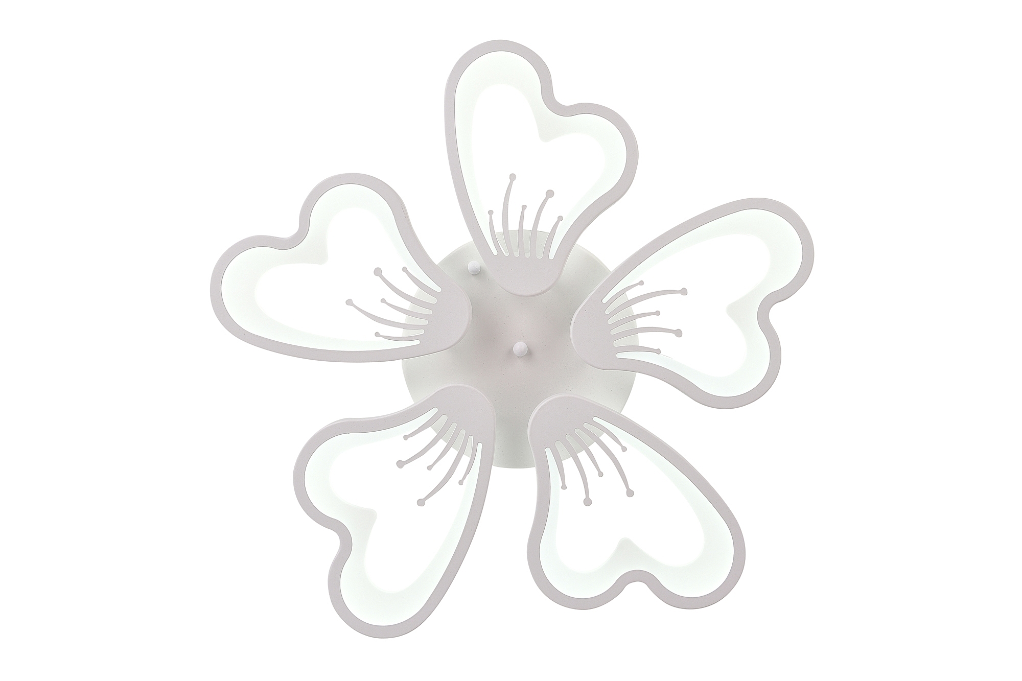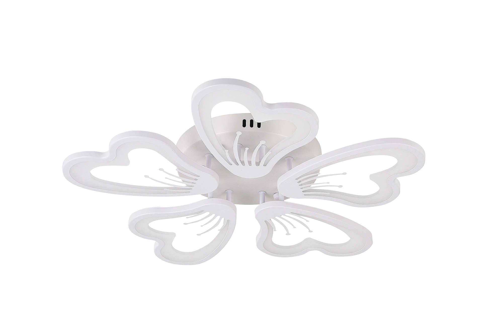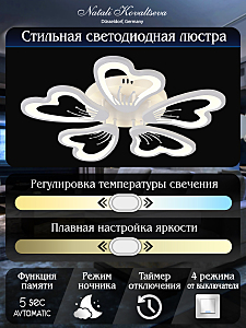 Светодиодный светильник с дистанционным управлением через пульт ДУ, смартфон, планшет. Лицевую часть составляют равноудалённые друг от друга рожки с симметричным дизайнерским узором. По их периметру расположена подсветка, а акрил обеспечивает отличное рассеивание света. Дизайн люстры выполнен в современном стиле в белом цвете и отлично подойдёт в любой интерьер. Люстра имеет тёплый, естественный и холодный свет с регулировкой температуры свечения. Обладает плавной настройкой яркости в диапазоне от 10% до 100%. Имеется режим ночника и таймер отключения. Кроме того, от стандартного выключателя люстра имеет 4 режима свечения. Данные функции делают светильник оптимальным в процессе использования. Общая мощность 100W со световым потоком 8000 lm позволяет осветить до 22 кв.м. Он прост в сборке, установке и экономичен в обслуживании. Люстра подойдёт для всех видов потолков. Цветовая температура настраивается от 2700 до 7000 K. Степень защиты 20 IP.