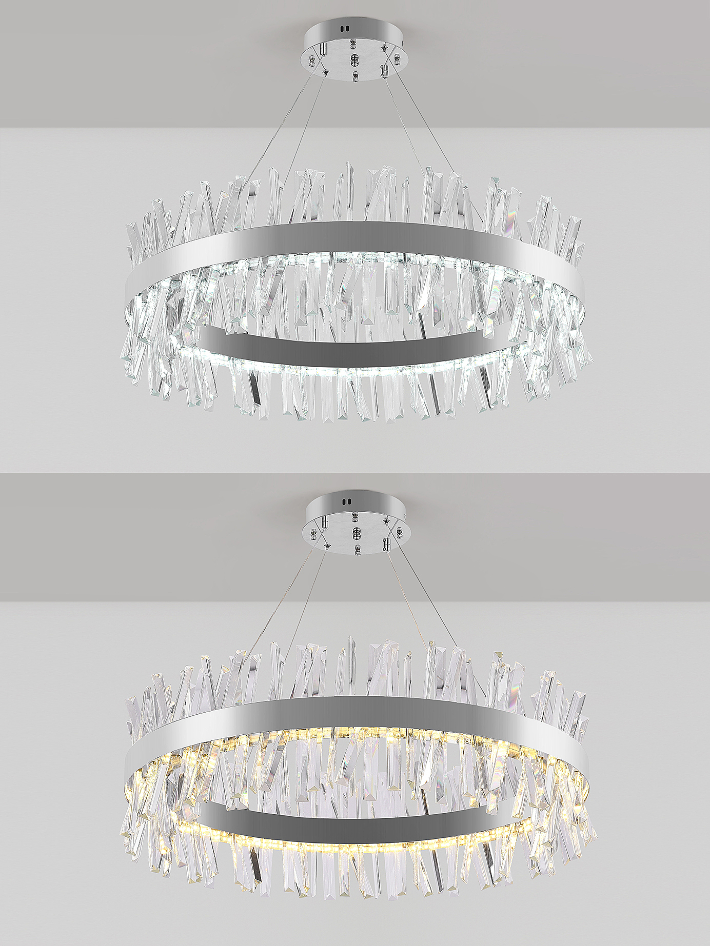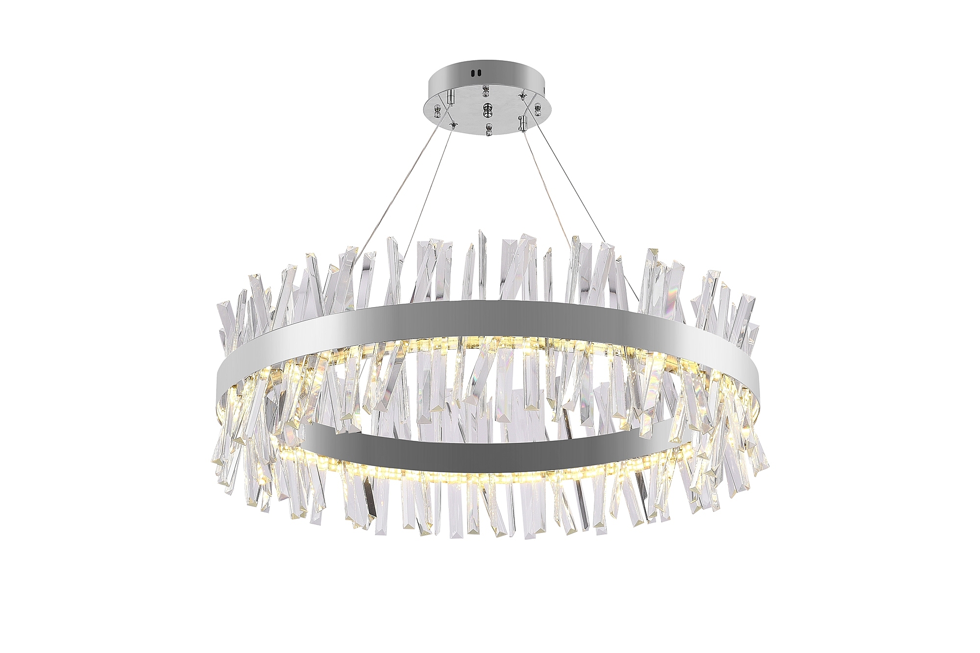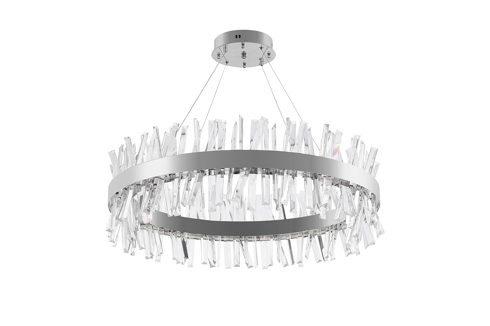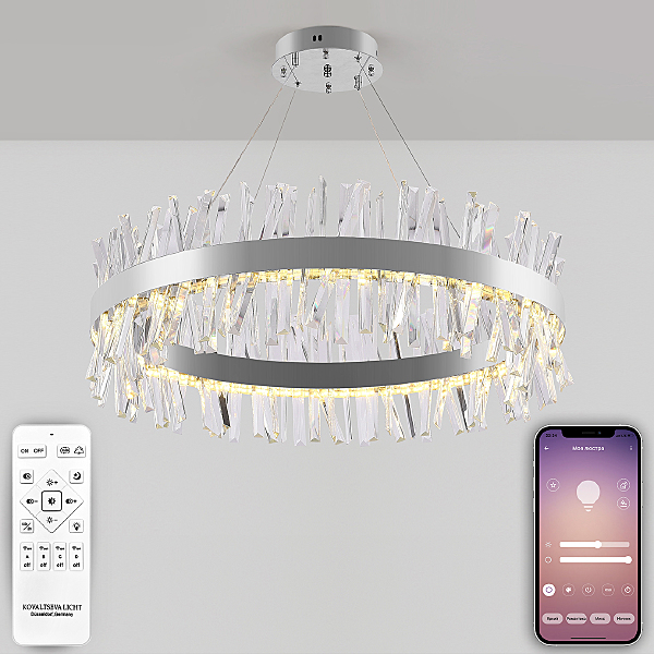 Высококачественный LED светильник в современном стиле с функционалом "умный дом". Данная люстра сочетает в себе исключительный дизайн и обширную функциональность. Светильник имеет круглую, кольцеобразную форму с эстетическим дизайном нимб выполненный в хроме. По периметру располагается гранённый хрусталь под наклоном, благодаря которому светильник подойдёт в любой интерьер и подчеркнёт стилистику. Высота люстры регулируется. Многофункциональный пульт управления позволит дистанционно управлять светильником. Возможность управлять светильником со смартфона и планшета, загрузив специальное приложение. Люстра в качестве основного освещения имеет тёплый, естественный и холодный свет с регулировкой температуры свечения. Несколько режимов их интеграции. Кроме того, имеется функция регулировки яркости свечения, делая светильник оптимальным в процессе использования. Имеет режим ночника и таймер отключения. Общая мощность лампы 160 Ватт. Потолочный светодиодный светильник может осветить до 25 метров2. Он прост в сборке, установке и экономичен в обслуживании. Подойдёт для всех видов потолков. Степень защиты 20 IP. Цветовая температура от 2700 до 7000Kelvin(K). Состав: металл,хрусталь. Световой поток 9000 lm.