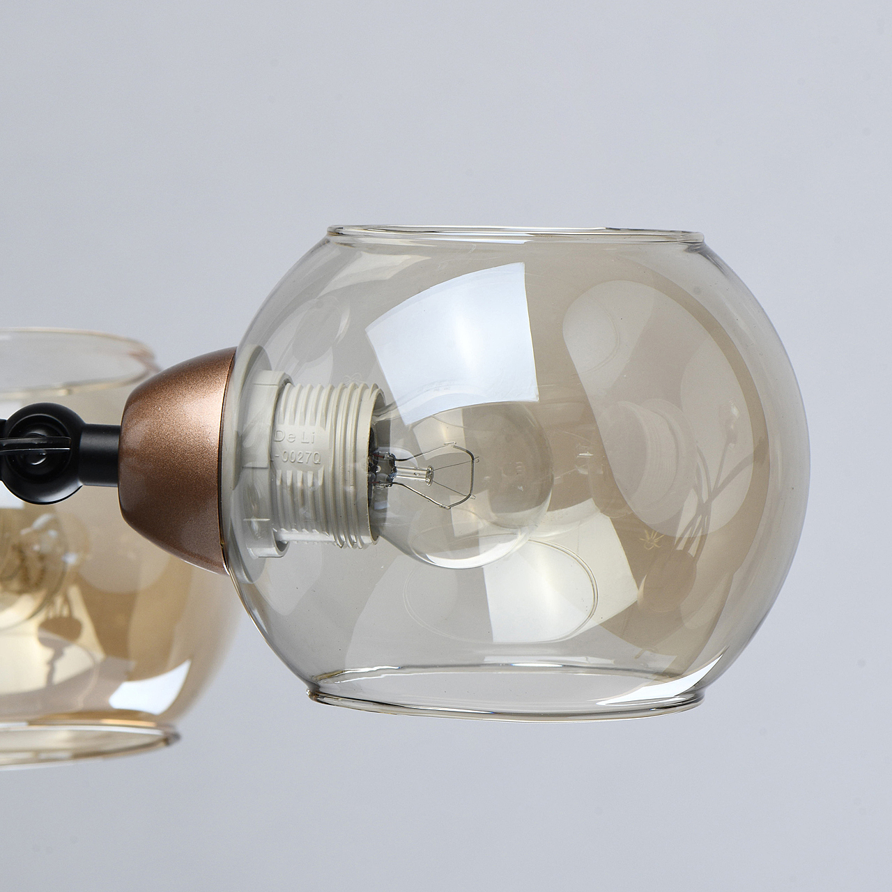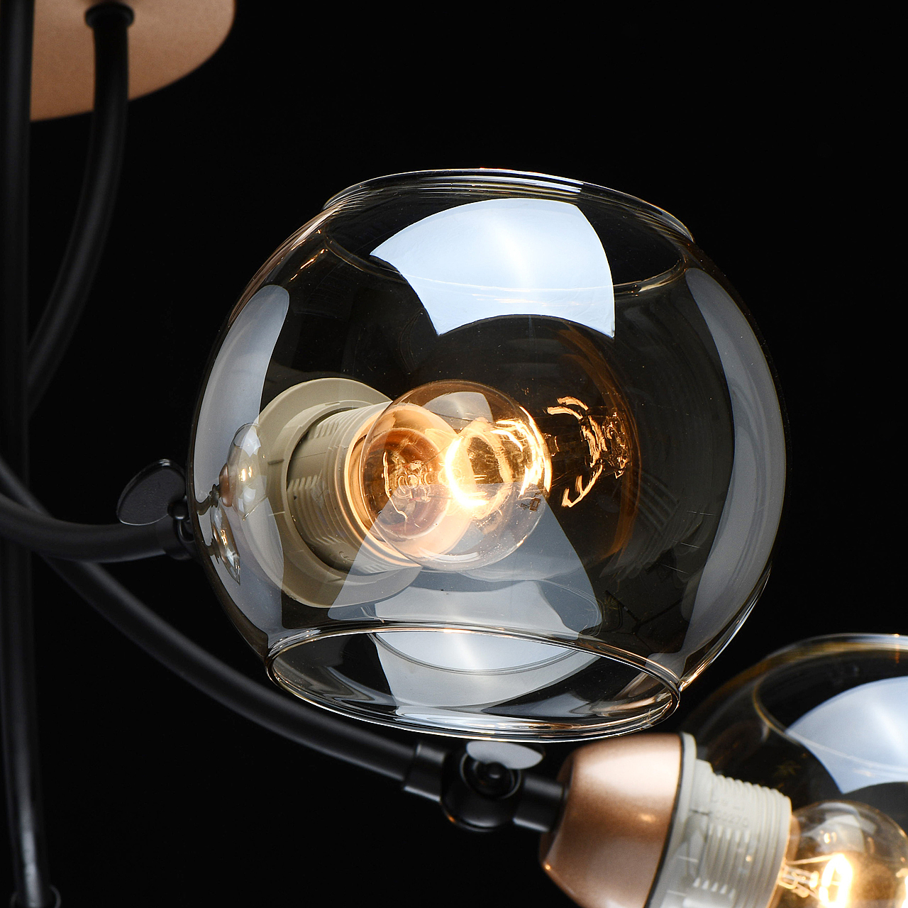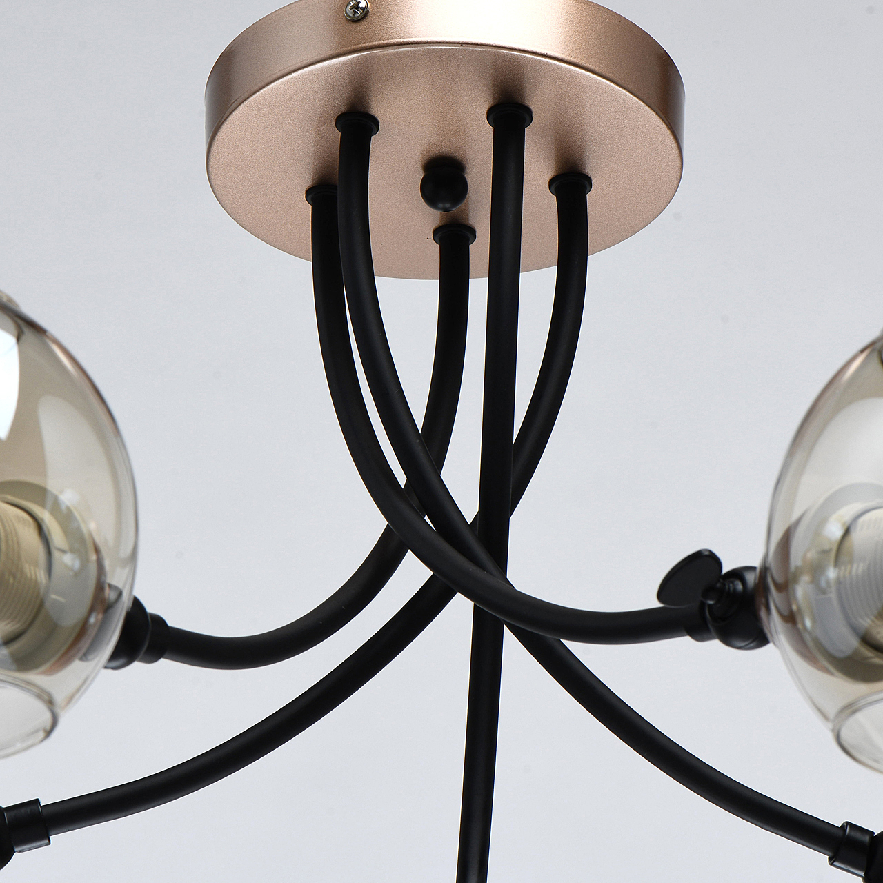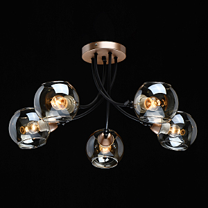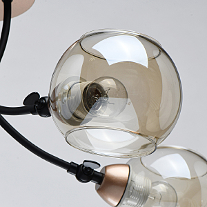 Актуальное сочетание металлов цвета розового золота и черного.Тонированное стекло коньячного цвета обеспечивает комфортный свет.Открытый с двух сторон плафон, оригинальная идея в современном интерьере.Заменяемые источники света удобны в эксплуатации.Спот-функция плафонов регулирует расположение источников света.