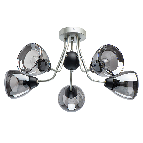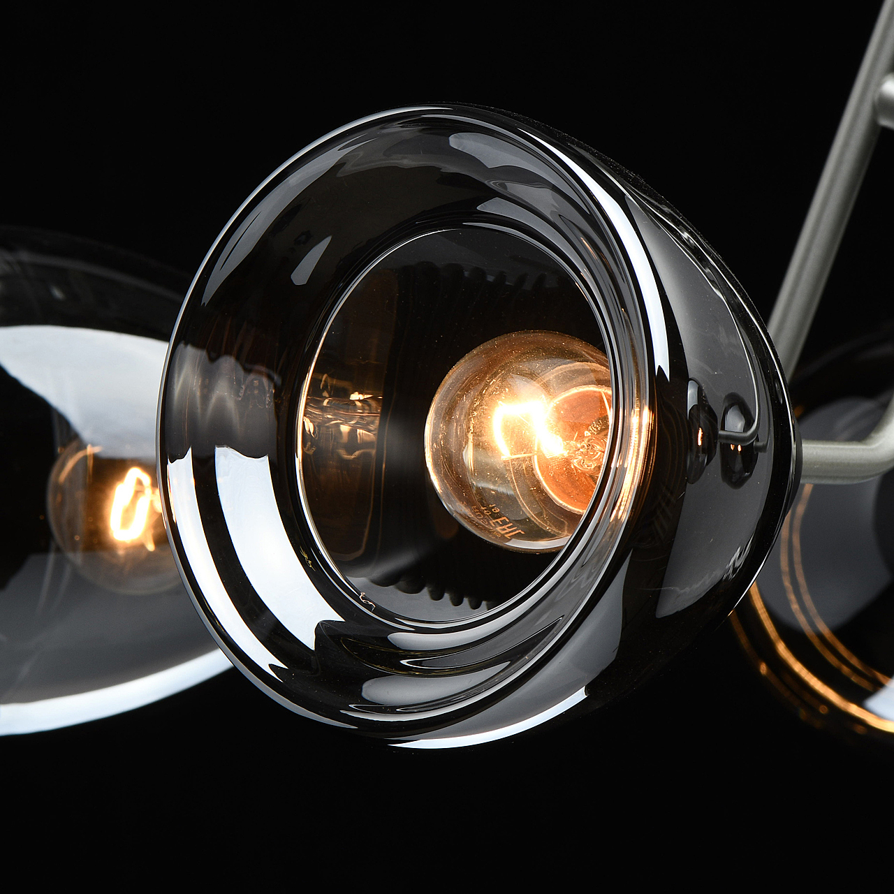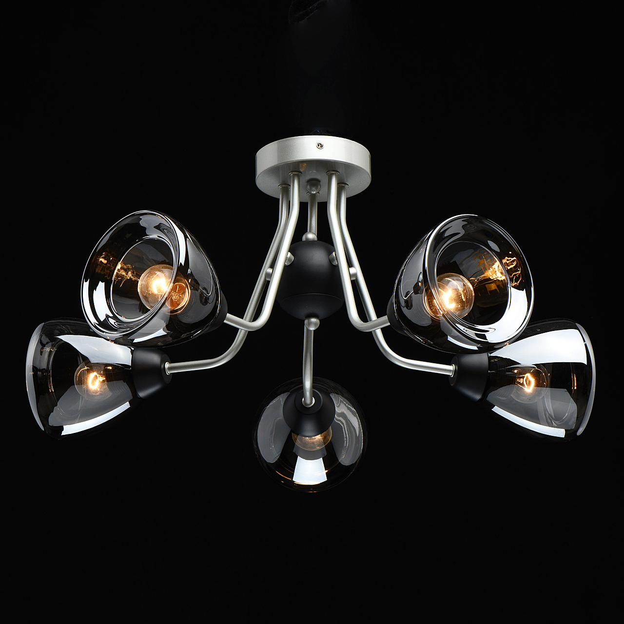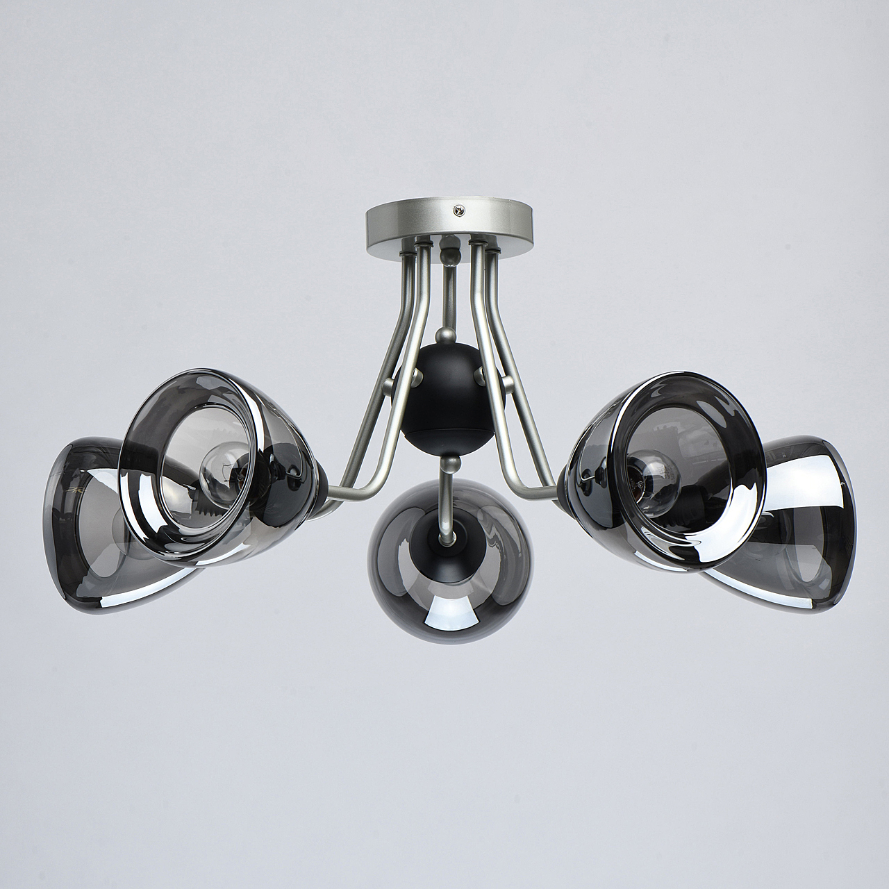 Популярный цвет перламутрового серебра и черного актуален в большинстве интерьеров.Плафоны дымчатого цвета оригинальной формы создают оптимальное распределение света.Заменяемые источники света удобны в эксплуатации.Варианты светильников на 3 и на 5 ламп.Компактные размеры для стандартных помещений.