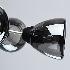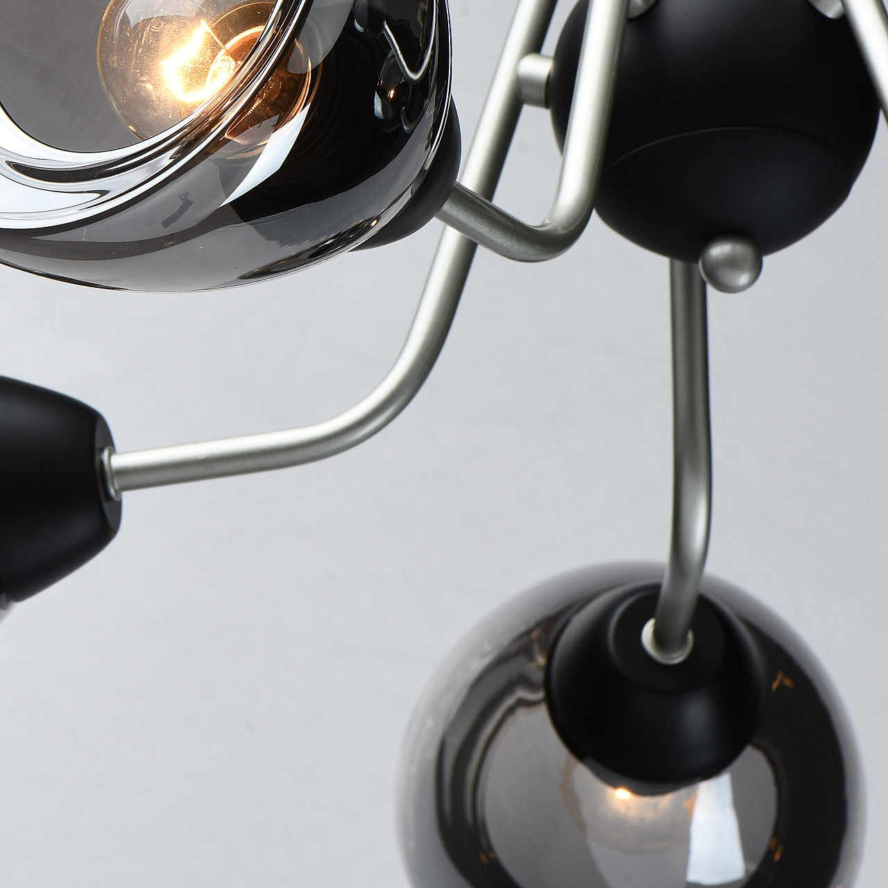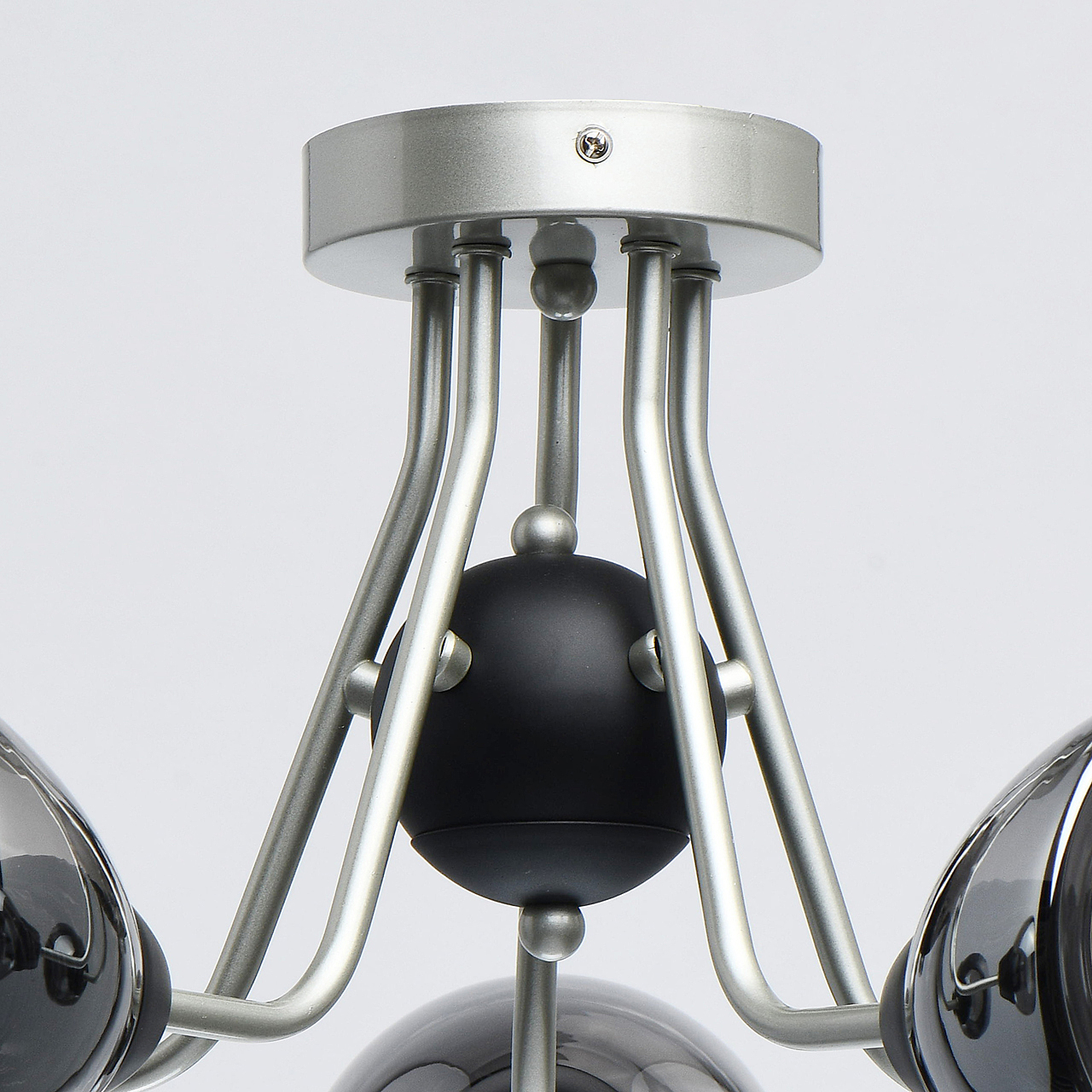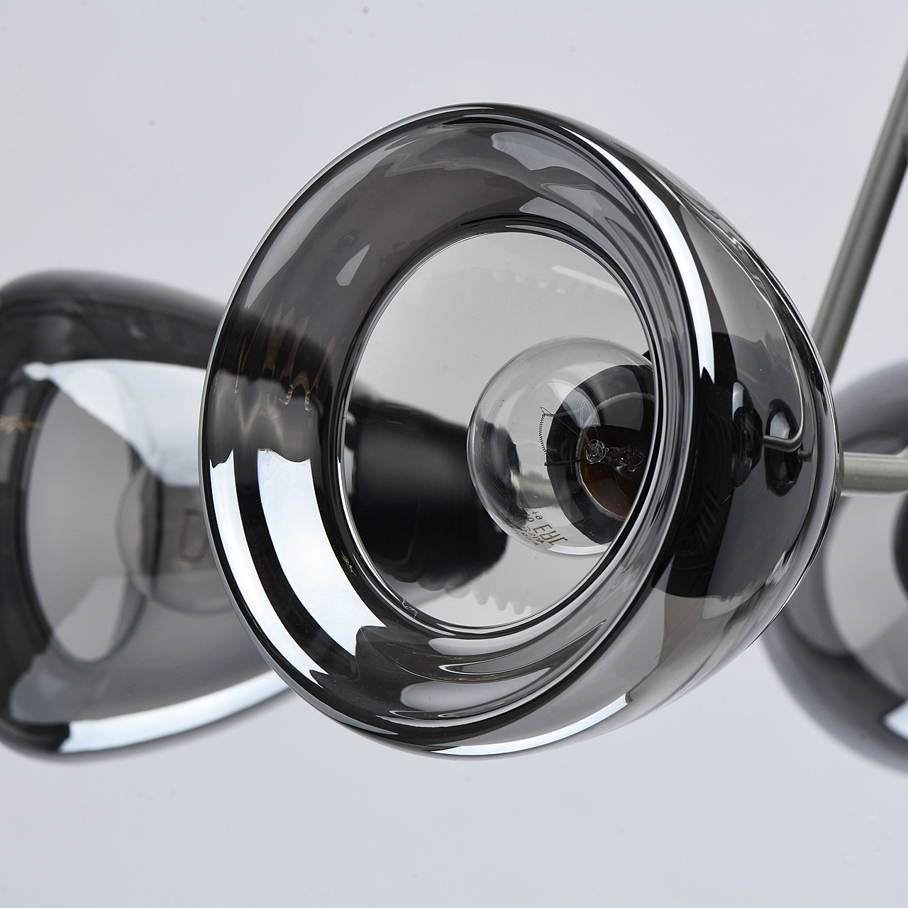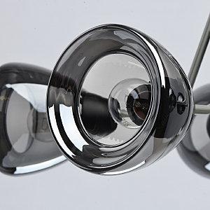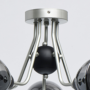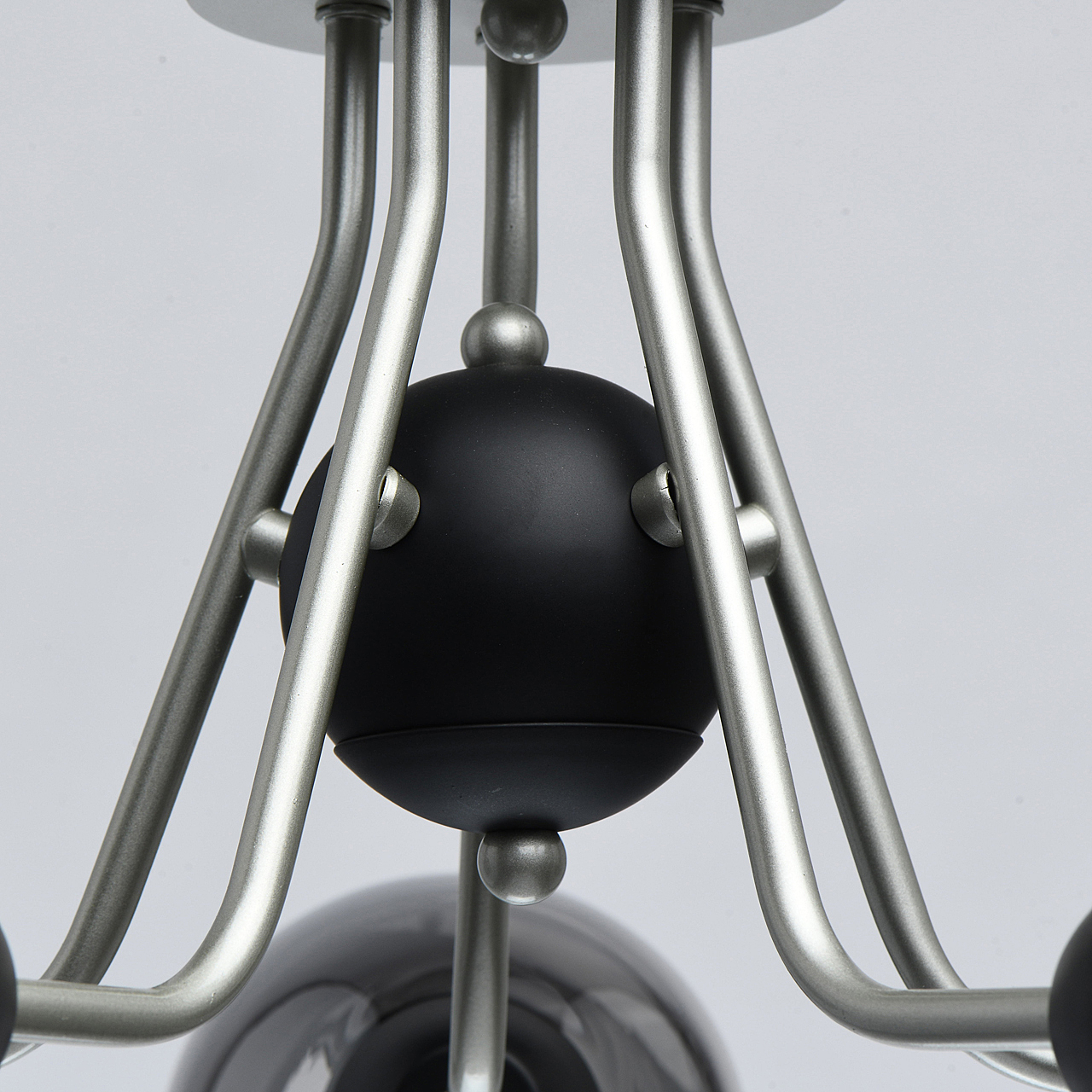 Популярный цвет перламутрового серебра и черного актуален в большинстве интерьеров.Плафоны дымчатого цвета оригинальной формы создают оптимальное распределение света.Заменяемые источники света удобны в эксплуатации.Варианты светильников на 3 и на 5 ламп.Компактные размеры для стандартных помещений.