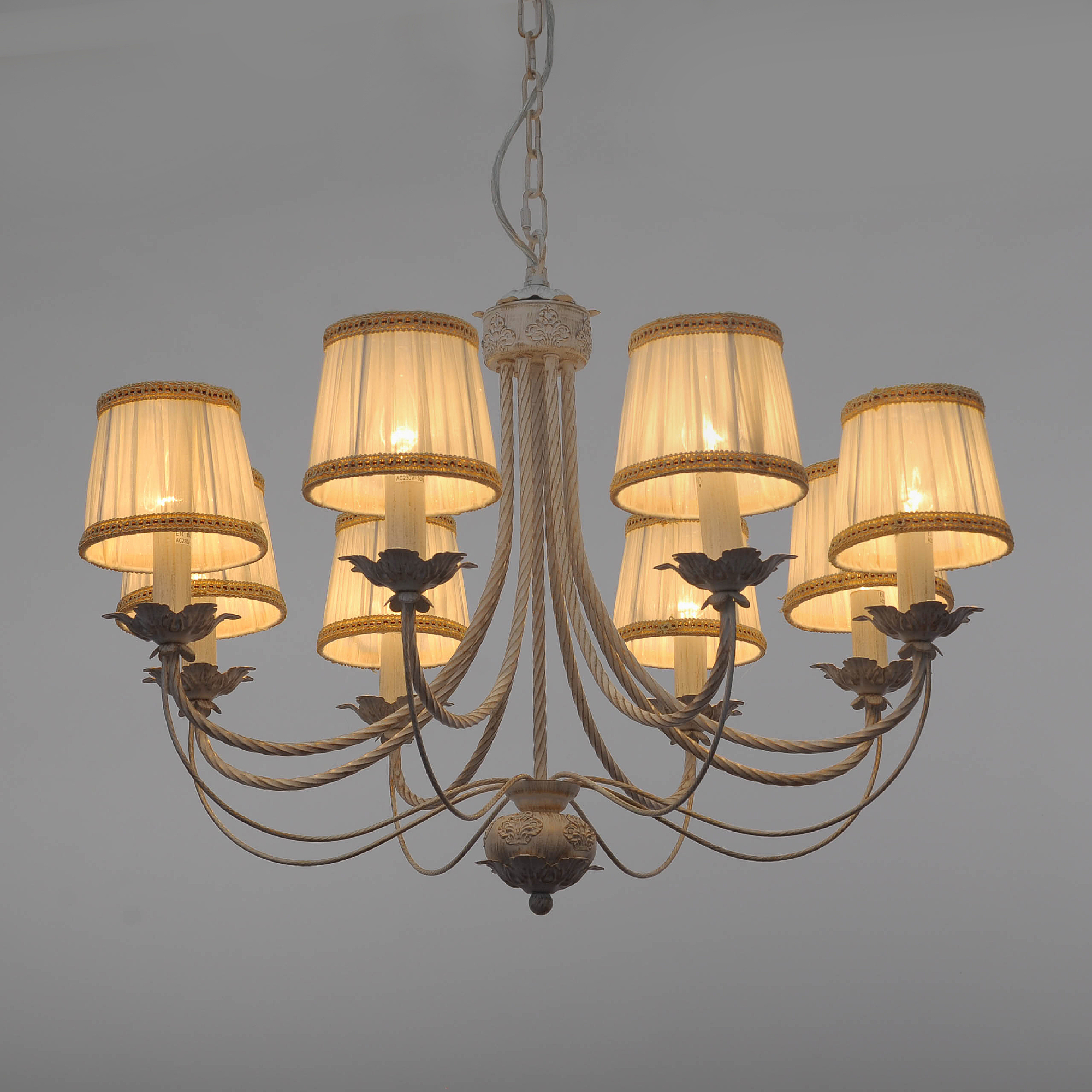 Допускается отличие страны-изготовителя, указанной в характеристиках. Линии производства могут находиться в нескольких государствах. Это не влияет на качество изготовления товара: все заводы данного бренда работают по общим стандартам, а готовые изделия проходят соответствующий контроль.Германия Коллекция Jasmin ЦветЦвет арматуры Кремовый Цвет Кремовый Материал арматуры Металл Цвет плафона кремовый Материал плафона Текстиль РазмерыВысота (мм) 500 Диаметр (мм) 700 Ширина (мм) 700 ЭлектрикаКоличество ламп (шт) 8 Цоколь E14 Тип лампы Светодиодная, Накаливания Мощность лампы (Вт) 40 Напряжение (В) 220 Площадь освещения 20 Дополнительная информацияСпособ крепления Крюк Степень защиты (IP) IP20 Место установки на потолок Тип подвеса На цепи -