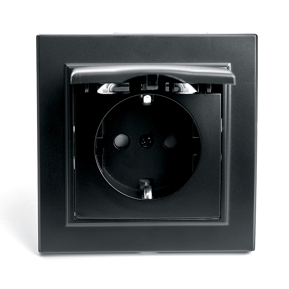 Розетка STEKKER PST16-9012-03 на 1 гнездо, с крышкой, с заземлением. Материал: ABS пластик, медь, цвет черный, размер 84*84*39мм. Номинальное напряжение 250, номинальный ток 16А, диапазон рабочих температур 0..+35градусовC, IP20
