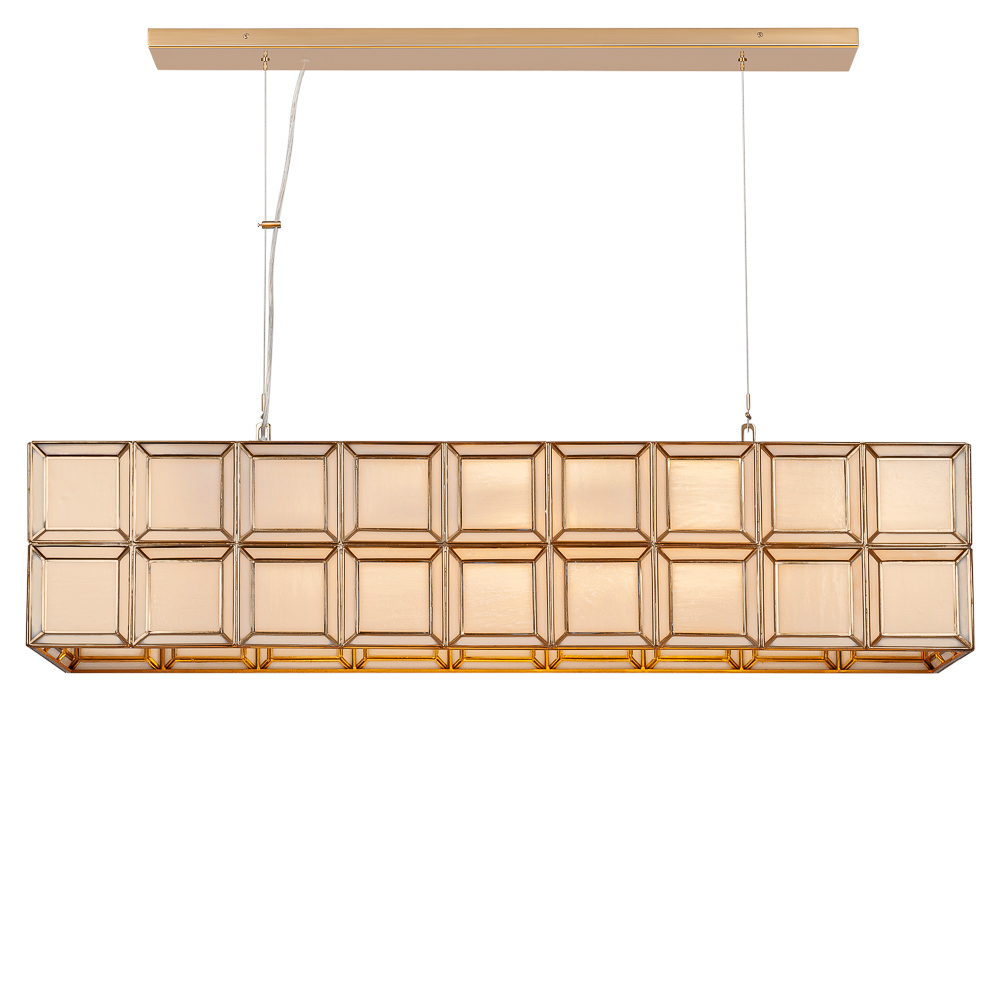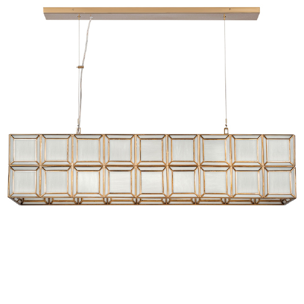 Допускается отличие страны-изготовителя, указанной в характеристиках. Линии производства могут находиться в нескольких государствах. Это не влияет на качество изготовления товара: все заводы данного бренда работают по общим стандартам, а готовые изделия проходят соответствующий контроль.Россия ЦветЦвет арматуры Белый, Состаренная латунь Цвет Латунь Материал арматуры Стекло, Латунь РазмерыВысота (мм) 250 Длина (мм) 340 Ширина (мм) 1140 Дополнительная информацияТип подвеса На тросах -