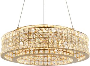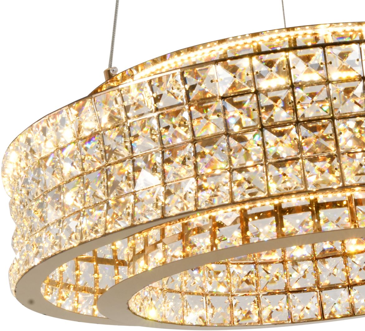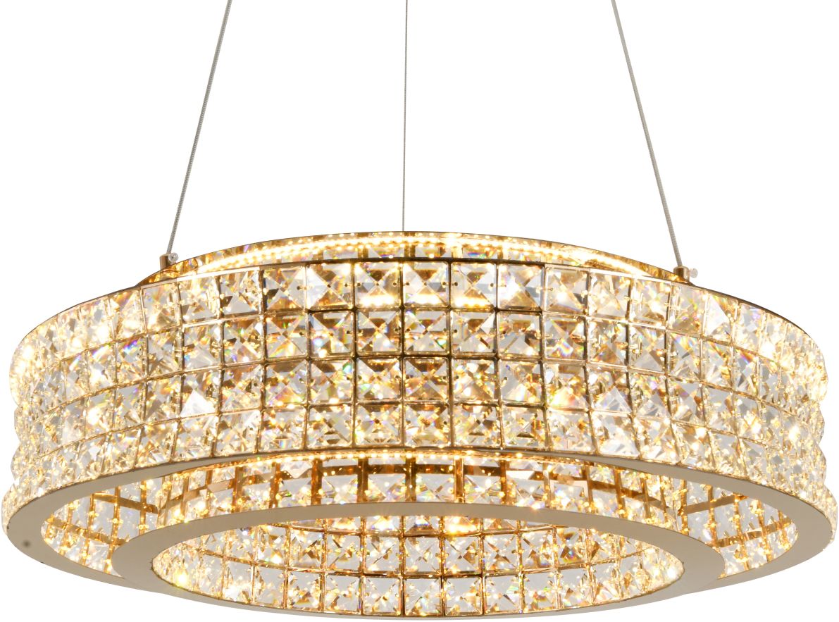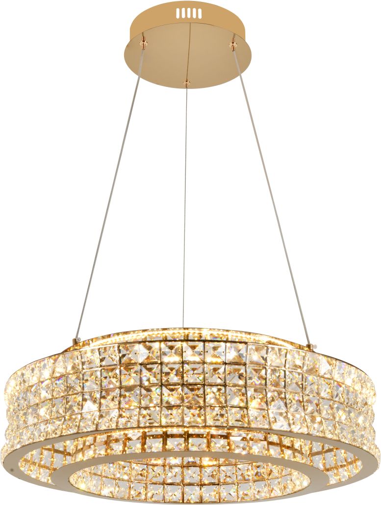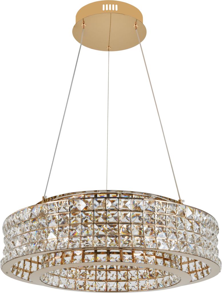 Люстра подвесная эксклюзивной коллекции Karnelli выполнена из нержавеющей стали золотого цвета и декорирована текстурным хрусталем высшей категории. Модель комплектуется пультом дистанционного управления 2,4G и драйвером высокого качества европейского стандарта T?V, обеспечивающим переключение трех режимов световой температуры и диммирование. Премиальное качество и неповторимыи? дизаи?н светильников идеально подои?дут как в классические, так и современные дизайнерские интерьеры. Из данной коллекции светильников можно сделать индивидуальный заказ любого цвета и размера.