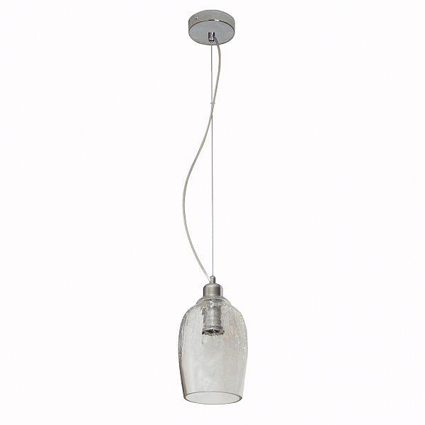 Потолочная чаша выполнена из металла и гальванизирована в цвет хрома. Плафон выполнен из прозрачного стекла, обработанного до середины по технологии кракелирования.