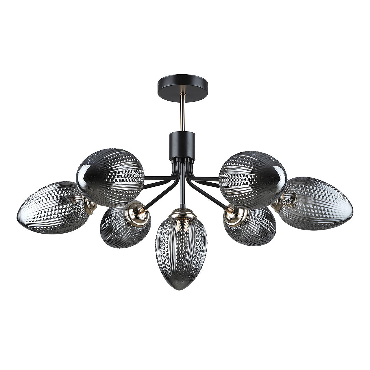 Актуальное контрастное сочетание черного и цвета античной бронзы выделяет потолочную люстру в интерьере. Грановитая фактура плафонов воплощает идеи итальянского возрождения. Дымчатый цвет стекла плафонов мягко рассеивает свет. Компактный размер потолочной люстры позволяет сохранить пространство комнаты при стандартном потолке. Заменяемые источники света удобны в эксплуатации.