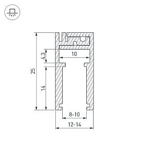 Алюминиевый анодированный профиль для светодиодной подсветки стекла 8-10мм. Фиксируется на кромке стекла на глубину 14мм при помощи 2-х стороннего скотча. Размер 2000х25, высота на стекле 8мм - 12 мм; на стекле 10мм - 14 мм. Ширина площадки для ленты 5 мм. Заглушки и другие аксессуары приобретаются отдельно. Цена за 1 метр.