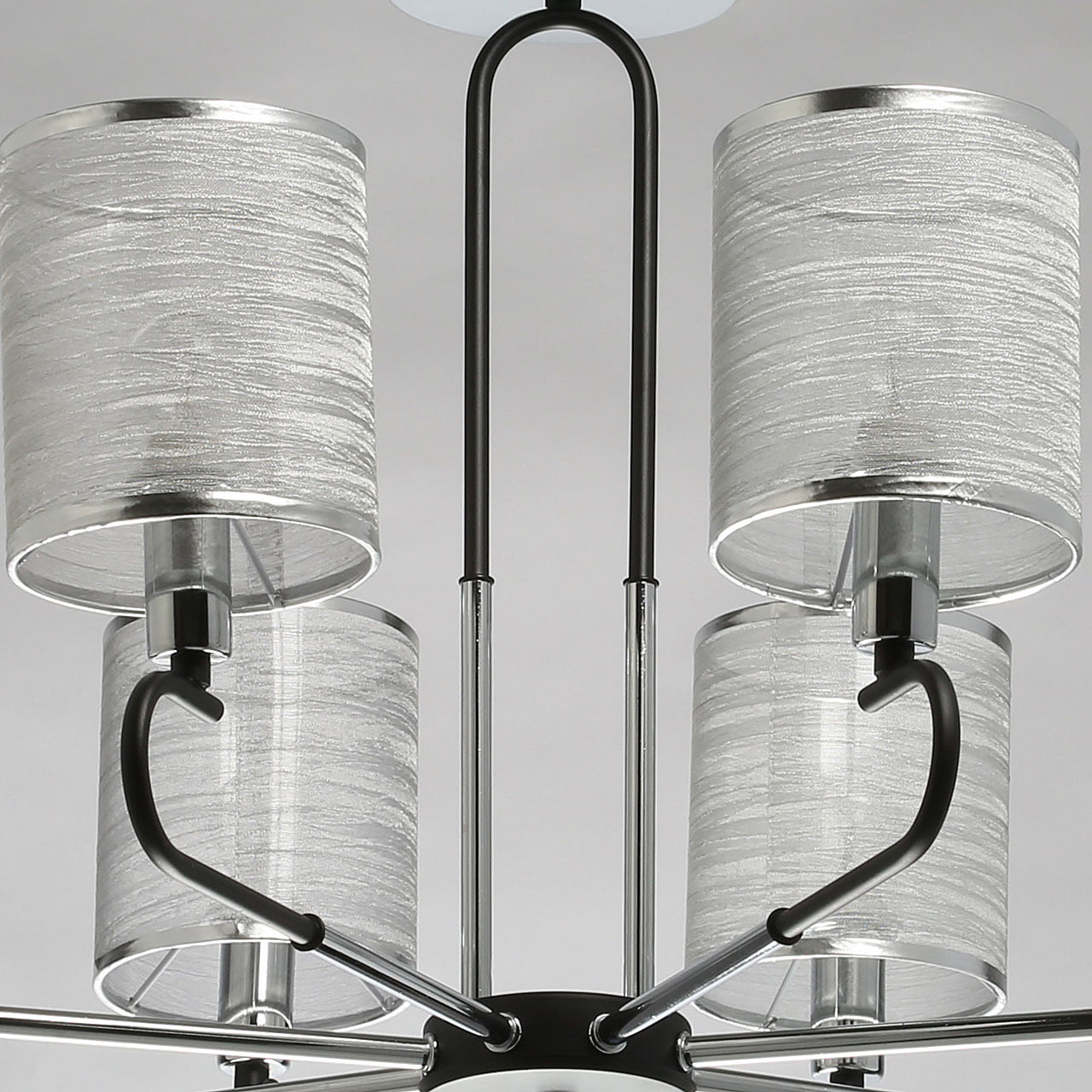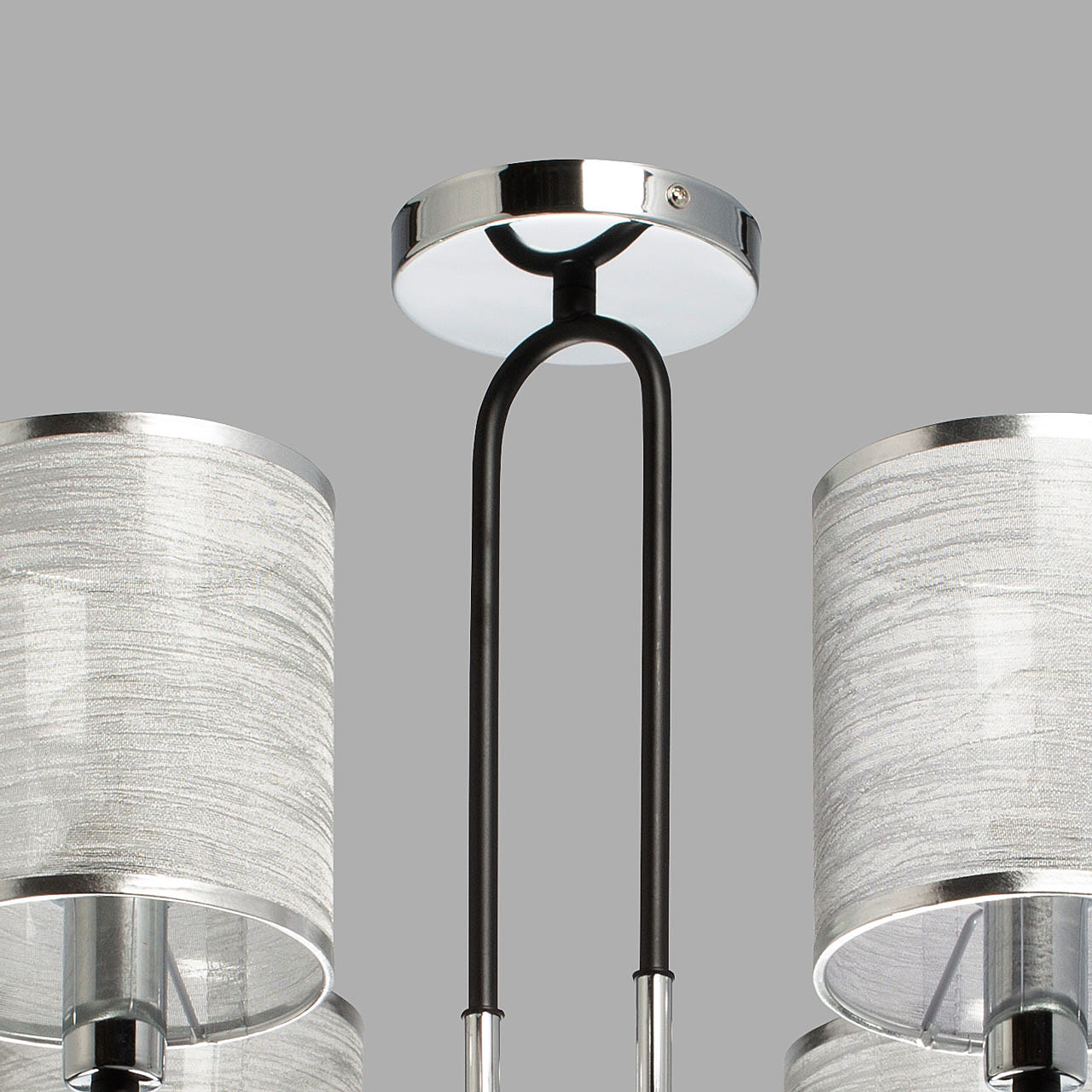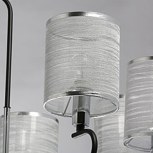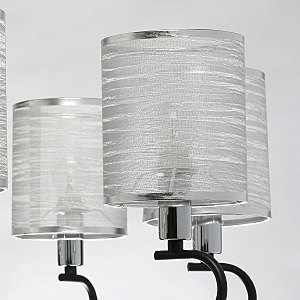 Основание светильника выполнено из металла и гальванизировано в цвет хрома. Отдельные элементы основания окрашены в черный цвет. Светильник декорирован двухслойными текстильными абажурами с термостойким акрилом внутри и жатой органзой серебряного цвета снаружи. Абажуры отделаны кантом серебряного цвета и прошиты.